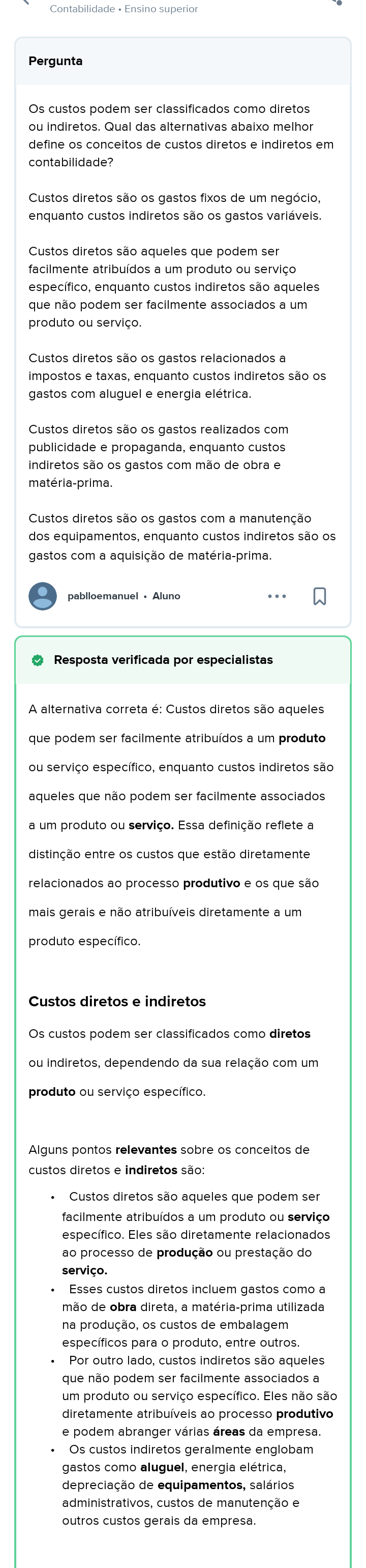 <p>Contabilidade Ensino superior Pergunta Os custos podem ser classificados como diretos ou indiretos. Qual das alternativas abaixo melhor define os conceitos de custos diretos e indiretos em contabilidade? Custos diretos são os gastos fixos de um negócio, enquanto custos indiretos são os gastos variáveis. Custos diretos são aqueles que podem ser facilmente atribuídos a um produto ou serviço específico, enquanto custos indiretos são aqueles que não podem ser facilmente associados a um produto ou serviço. Custos diretos são os gastos relacionados a impostos e taxas, enquanto custos indiretos são os gastos com aluguel e energia elétrica. Custos diretos são os gastos realizados com publicidade e propaganda, enquanto custos indiretos são os gastos com mão de obra e matéria-prima. Custos diretos são os gastos com a manutenção dos equipamentos, enquanto custos indiretos são os gastos com a aquisição de matéria-prima. pablloemanuel Aluno ... Resposta verificada por especialistas A alternativa correta é: Custos diretos são aqueles que podem ser facilmente atribuídos a um produto ou serviço específico, enquanto custos indiretos são aqueles que não podem ser facilmente associados a um produto ou serviço. Essa definição reflete a distinção entre os custos que estão diretamente relacionados ao processo produtivo e os que são mais gerais e não atribuíveis diretamente a um produto específico. Custos diretos e indiretos Os custos podem ser classificados como diretos ou indiretos, dependendo da sua relação com um produto ou serviço específico. Alguns pontos relevantes sobre os conceitos de custos diretos e indiretos são: Custos diretos são aqueles que podem ser facilmente atribuídos a um produto ou serviço específico. Eles são diretamente relacionados ao processo de produção ou prestação do serviço. Esses custos diretos incluem gastos como a mão de obra direta, a matéria-prima utilizada na produção, os custos de embalagem específicos para produto, entre outros. Por outro lado, custos indiretos são aqueles que não podem ser facilmente associados a um produto ou serviço específico. Eles não são diretamente atribuíveis ao processo produtivo e podem abranger várias áreas da empresa. Os custos indiretos geralmente englobam gastos como aluguel, energia elétrica, depreciação de equipamentos, salários administrativos, custos de manutenção e outros custos gerais da empresa.</p>