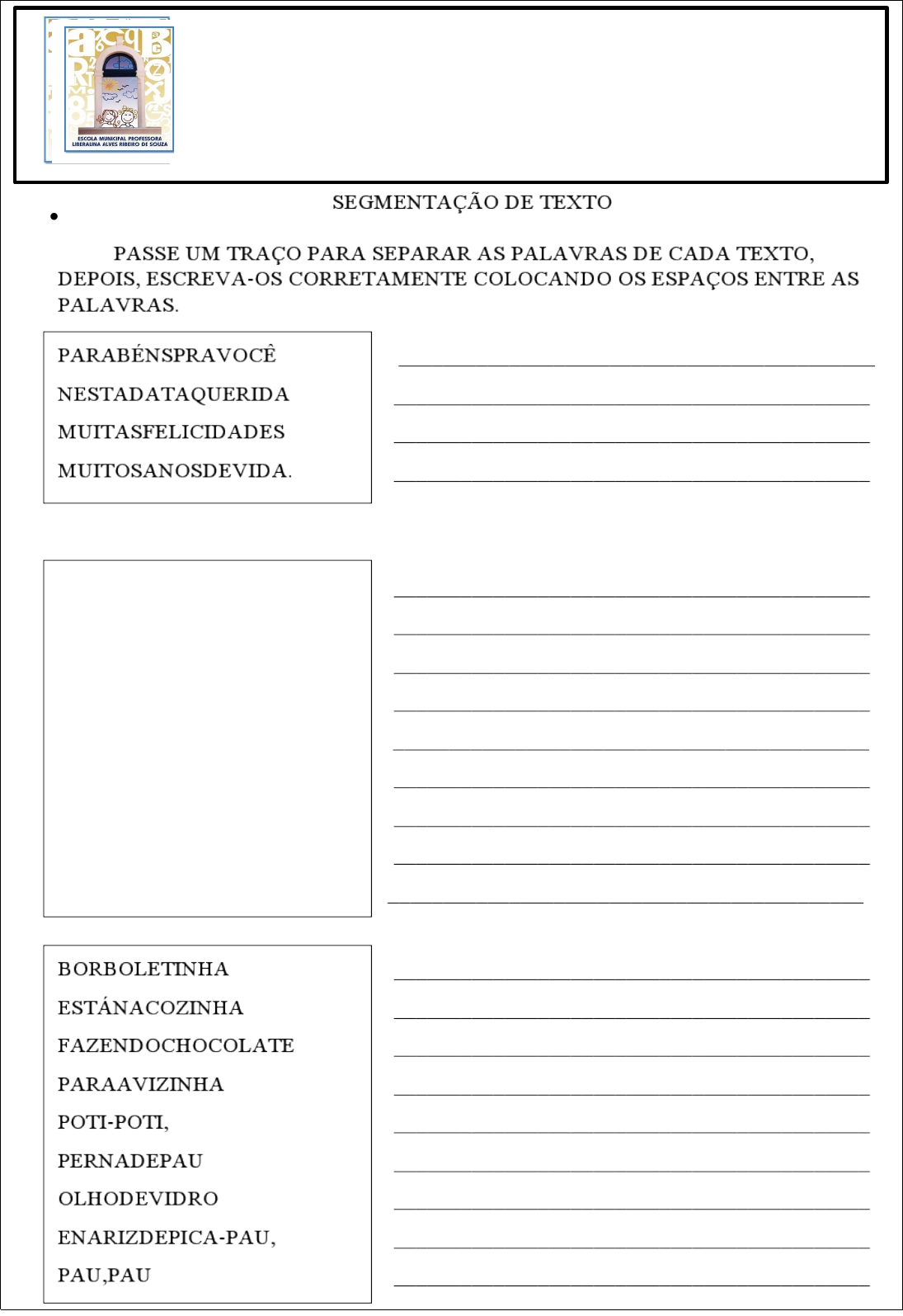 <p>Escola Municipal Professora Liberalina Alves Ribeiro de Souza</p><p>“Educação constrói valores, valores constroem história”</p><p>Aluno(a): __________________________________________ Data: ____/____/2024</p><p>Ano: 2° Ano Escolar Turma: 204 Profª.: ________________</p><p>· (</p><p>NÃOATIREOPAUNOGATO</p><p>NÃOATIREOPAUNOGATO,</p><p>TÔ,TÔ</p><p>PORQUEISSO,</p><p>SÔ</p><p>NÃOSEFAZ,FAZ,FAZ</p><p>OGATINHO,</p><p>NHÔ,NHÔ</p><p>É</p><p>NOSSOAMIGO,</p><p>GÔ</p><p>NÃODEVEMOS,</p><p>NÃODEVEMOS</p><p>MALTRATAROSANIMAIS</p><p>JAMAIS!</p><p>)PINTE A PALAVRA QUE CORRESPONDE AO NOME DA FIGURA. DEPOIS, PINTE COM CAPRICHO!</p><p>image2.emf</p><p>image3.jpeg</p><p>image4.jpeg</p>