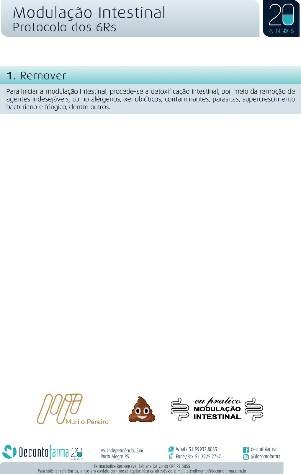 <p>Biointestil _______________600mg</p><p>Posologia: Tomar 1 dose 1-2x/ dia, após principais refeições.</p><p>Berberina HCL ______________ 250mg</p><p>Posologia: Nos 15 primeiros dias, tomar 2x/dia, após refeições. Após 15 dias, tomar 1x/dia, após refeição.</p><p>Usar mês sim, mês não (processo de 12 semanas)</p><p>Ômega 3 GOLD _____________ 1g</p><p>Posologia: Tomar 1 dose, 2x/dia, após ou durante refeições</p><p>Óleo de orégano ________________ 1g</p><p>Posologia: Tomar 1 dose 1x/dia, após refeição</p><p>Allium sativum _______________ 500mg</p><p>Posologia: Tomar 1 dose, 3x/dia, ao acordar em jejum, sempre longe das refeições, para atuar no intestino</p><p>Vaccinium macrocarpon (Cramberry) extrato seco ______________ 120 a 800mg</p><p>Posologia: Tomar 1 dose, 1 a 2x/dia</p><p>Glutamina ________5g</p><p>Silício orgânico biodisponível ____________50mg</p><p>Magnésio-glicil-glutamina______________200mg</p><p>Posologia: Tomar 1 dose 1x/ dia, antes de dormir, por 30 dias</p><p>Arginina _______ 1 a 5g/dia</p><p>Vitamina A ________ 5000 a 10.000UI/dia</p><p>Zinco ____________ 20 a 40mg/dia</p><p>Vitamina D _________ 2000 UI</p><p>Posologia: Tomar 1 dose 1x/ dia, após refeição</p><p>Betaina HCL _________ 200 a 1000mg</p><p>Posologia: 1 dose, antes das refeições</p><p>Pool de enzimas digestivas</p><p>Bromelina _______________75 mg</p><p>Protease_________________75mg</p><p>Papaina_________________ 75mg</p><p>Pepsina__________________50mg</p><p>Lipase___________________50mg</p><p>Amilase__________________100mg</p><p>Posologia: Tomar 1 dose antes das principais refeições</p><p>Microbiomex® ________________ 500mg</p><p>Posologia: Tomar 1 dose 1x/ dia, antes de dormir por 12 semanas. Para manutenção, utilizar 1 dose 1x/</p><p>dia, a cada 2 dias</p><p>Tintura digestiva e Protetora gástrica</p><p>Casearia sylvestris (Guaçatonga)________ 40%</p><p>Maytenus ilicifolia (Espinheira santa) _______40%</p><p>Rosmarinus officinalis (Alecrim)___________ 20%</p><p>Posologia: Tomar 20 gotas, antes das principais refeições</p><p>Digestão</p><p>Mentha piperita (Hortelã)__________200mg</p><p>Matricaria recutita (Camomila)________200mg</p><p>Zingiber officinale (Gengibre)_________250mg</p><p>Posologia: Tomar 1 dose 1x/ dia, durante ou após a refeição</p><p>Stomazinc ________________ 150mg</p><p>Posologia: Tomar 1 dose longe das refeições, por 12 semanas</p><p>Intense 112,5 ® ________________ 112,5mg</p><p>Posologia: Tomar uma dose antes de dormir, no máximo 6 meses</p><p>Intest Booster ® ___________________ 100mg</p><p>Posologia: Tomar uma dose antes de dormir, por 12 semanas</p><p>Mix de fibras solúveis e insolúveis:</p><p>Plantago psyllium __________2,5g</p><p>Inulina_____________ 2g</p><p>FOS __________________2g</p><p>Fibregum B ®____________ 2,5g</p><p>Posologia: Tomar 1 dose (sachê) 1x/ dia, antes de dormir</p><p>Ganoderma lucidum __________ 200 a 400mg</p><p>Posologia: Tomar 1 dose 1x/ dia, pela manhã, por 12 semanas</p><p>IBS Care 8 ___________50 a 100mg</p><p>Posologia: Tomar 1 dose 1x ao dia, antes de dormir</p><p>Intest Booster ___________50 a 100mg</p><p>Posologia: Tomar 1 dose 1x ao dia, antes de dormir</p>