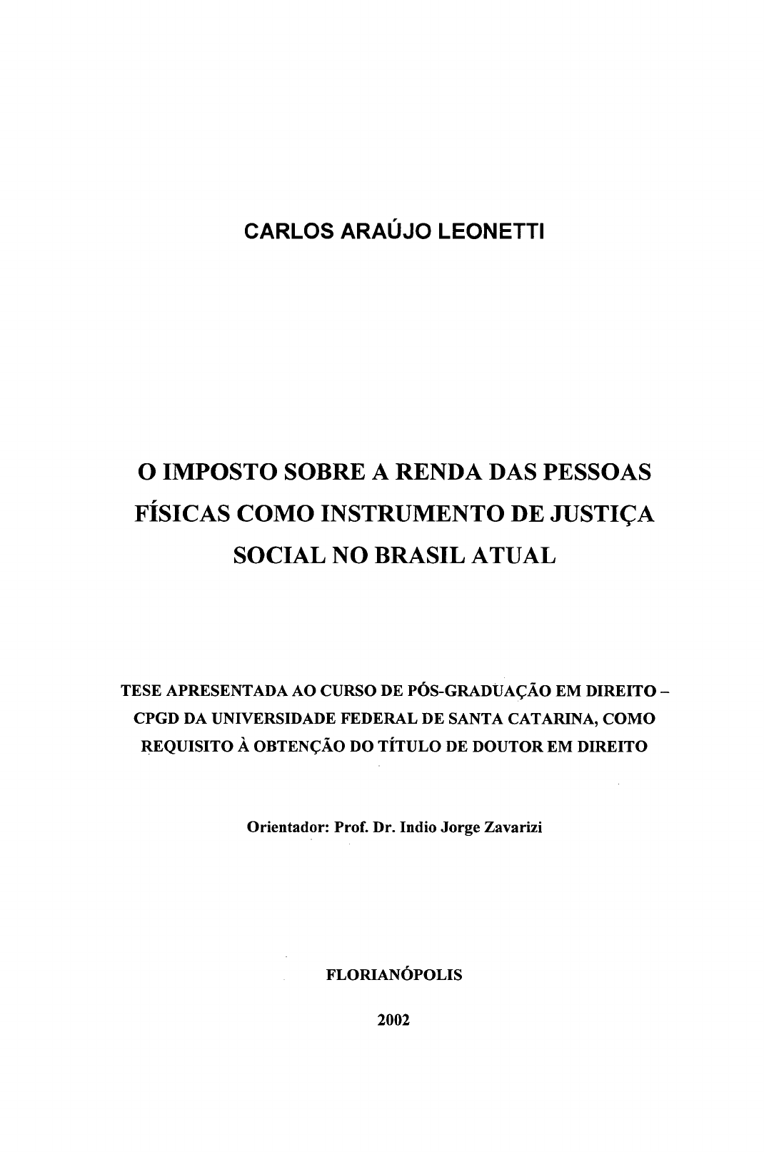 <p>CARLOS ARAÚJO LEONETTI</p><p>O IMPOSTO SOBRE A RENDA DAS PESSOAS</p><p>FÍSICAS COMO INSTRUMENTO DE JUSTIÇA</p><p>SOCIAL NO BRASIL ATUAL</p><p>TESE APRESENTADA AO CURSO DE PÓS-GRADÜAÇÃO EM DIREITO -</p><p>CPGD DA UNIVERSIDADE FEDERAL DE SANTA CATARINA, COMO</p><p>REQUISITO À OBTENÇÃO DO TÍTULO DE DOUTOR EM DIREITO</p><p>Orientador: Prof. Dr. Indio Jorge Zavarizi</p><p>FLORIANÓPOLIS</p><p>2002</p><p>UNIVERSIDADE FEDERAL DE SANTA CATARINA</p><p>CENTRO DE CIÊNCIAS JURÍDICAS</p><p>CURSO DE PÓS-GRADUAÇÃO EM DIREITO</p><p>ATESE</p><p>'O IMPOSTO SOBRE A RENDA DAS PESSOAS FÍSICAS COMO</p><p>INSTRUMENTO DE JUSTIÇA SOCIAL",</p><p>ELABORADA POR</p><p>CARLOS ARAUJO LEONETTI</p><p>E APROVADA POR TODOS OS MEMBROS DA BANCA EXAMINADORA, FOI</p><p>JULGADA ADEQUADA PARA A OBTENÇÃO DO TÍTULO DE</p><p>DOUTOR EM DIREITO.</p><p>FLORIANÓPOLIS, 21 DE FEVEREIRO DE 2002.</p><p>BANCA EXAMINADORA:</p><p>Prof. Dr. Ipdio Jorge Zavarizi</p><p>Presidente</p><p>Prof. Dr. Casar Luiz Pas</p><p>Membro / / *IMsv</p><p>.'""V'V'Vv-*--,</p><p>achado,Profa. Dra. Misabel Ab</p><p>Membro</p><p>Prof. Dr. Sacha Calmon Navarro Coêlho</p><p>TERMO DE ISENÇÃO DE RESPONSABILIDADE</p><p>A aprovação do presente trabalho acadêmico não significará o endosso do</p><p>Professor Orientador, da Banca Examinadora ou do CPGD/UFSC à ideologia que o</p><p>fundamenta ou que nele é exposta.</p><p>3</p><p>AGRADECIMENTOS</p><p>Ao meu Orientador, Professor Doutor índio Jorge Zavarizi, pela amizade,</p><p>paciência e dedicação com que sempre me distinguiu ao longo de minha vida acadêmica.</p><p>Ao meu Orientador na Universidade Harvard, Professor Daniel Halperin, pela</p><p>inestimável colaboração prestada.</p><p>Aos demais Professores do Curso de Pós-Graduação em Direito - CPGD da</p><p>UFSC que colaboraram para minha formação acadêmica, assim como a todos os colegas,</p><p>professores, servidores técnico-administrativos e estudantes, do Centro de Ciência Jurídicas</p><p>da UFSC, cujo Corpo Docente tenho a honra de integrar, pelo apoio recebido.</p><p>À minha irmã, MSc Elisabete Araújo Leonetti, pela competente e criteriosa</p><p>revisão gramatical dos originais.</p><p>Finalmente, à minha esposa Rosana e a meus filhos, Isabel e Fábio, pelos</p><p>incentivos e compreensão em face dos sacrifícios que lhes foram impostos.</p><p>4</p><p>RESUMO</p><p>O objetivo desta Tese é o de demonstrar que o imposto brasileiro sobre a renda</p><p>das pessoas físicas pode e deve atuar como um eficaz instrumento de Justiça Social, embora</p><p>ainda não o faça, pelo menos na medida desejada.</p><p>O estudo se desenvolve em cinco momentos distintos, cada qual</p><p>correspondendo a um Capítulo. Num primeiro momento, procurar-se-á mostrar as origens e</p><p>evolução, no Brasil e no exterior, tanto da tributação da renda em si como das teorias</p><p>jurídicas e econômicas que a amparam. A seguir, passar-se-á à dissecação do imposto</p><p>brasileiro sobre a renda das pessoas físicas à luz da Constituição e da legislação</p><p>infraconstitucional vigentes. Mais adiante, estudar-se-á o imposto federal sobre a renda das</p><p>pessoas físicas nos Estados Unidos da América. Logo após, formular-se-á o conceito de</p><p>Justiça Social a ser adotado na presente Tese. No último Capítulo examinar-se-á detida e</p><p>acuradamente a efetividade do imposto brasileiro sobre a renda das pessoas físicas como</p><p>instrumento de Justiça Social. Para tal, confrontar-se-á o perfil atual da exação com o</p><p>conceito de Justiça Social adotado para fins desta Tese, com apoio na história do instituto</p><p>no Brasil e no estrangeiro, assim como no modelo americano.</p><p>Finalmente, apresentar-se-á uma síntese dos principais resultados obtidos com a</p><p>presente pesquisa.</p><p>5</p><p>ABSTRACT</p><p>The main goal of this Thesis is to demonstrate that the Brazilian individuals</p><p>income tax can and should be a strong tool of Social Justice, despite it is not true yet, at</p><p>least as far as desired.</p><p>The study has five distinct phases, each one corresponding to a chapter. We start</p><p>from the origins of the personal income taxation in the world and in Brazil, showing the</p><p>evolution of this tax and of the concept of income. In a second moment, we dissect the</p><p>current Brazilian income taxation on individuals. Afterwards, we study the United States</p><p>federal personal income tax. Later, we formulate the concept of Social Justice used in this</p><p>Thesis. In the last chapter we analyze whether and how the Brazilian individuals income</p><p>tax works as a Social Justice’s tool. To make this goal we compare the current profile of</p><p>the Brazilian individuals income tax with the concept of Social Justice adopted by us, with</p><p>support on the income taxation history and on the U. S. federal individuals income tax.</p><p>Finally, we present the most important conclusions of our research.</p><p>6</p><p>RESUMEN</p><p>El objetivo de esta Tesis es el de demostrar que el impuesto brasilero sobre la</p><p>renta de las personas físicas puede y debe actuar como un eficaz instrumento de Justicia</p><p>Social, mismo que aún no lo haga, por lo menos en la medida deseada.</p><p>El estúdio se desarrolla en cinco momentos distintos, cada cual correspondiendo</p><p>a un capítulo. En un primer momento, se procurará mostrar los orígenes y evolución, en el</p><p>Brasil y en el exterior, tanto de la tributación de la renta en sí como de las teorias jurídicas y</p><p>económicas que la amparan. En seguida se pasará a la disecación dei impuesto brasilero</p><p>sobre la renta de la persona física, bajo la luz de la constitución y de la legislación infra-</p><p>constitucional vigentes. Más adelante se estudiará el impuesto federal sobre la renta de las</p><p>personas físicas en los Estados Unidos de América. Luego después, se formulará el</p><p>concepto de Justicia Social