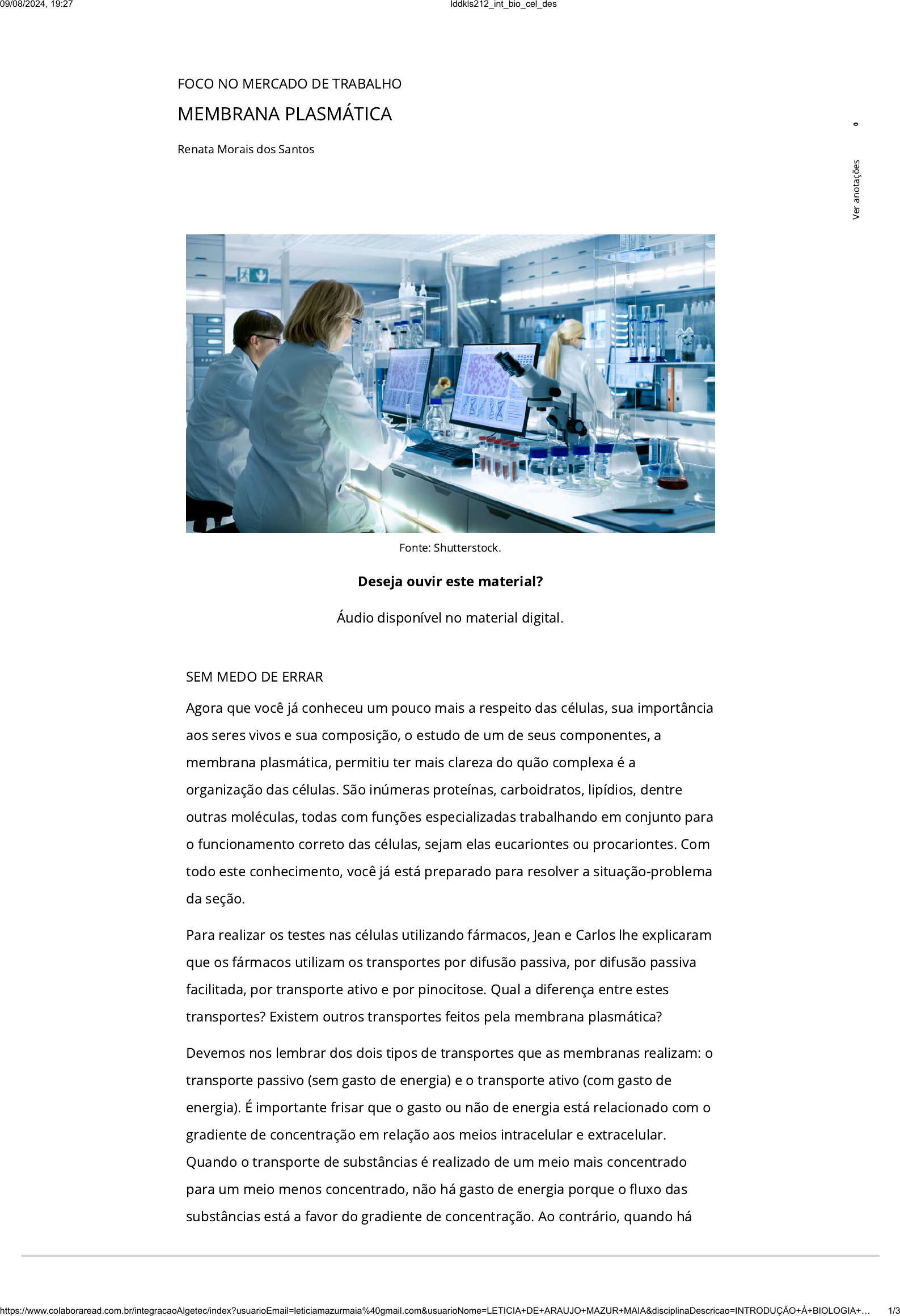 <p>FOCO NO MERCADO DE TRABALHO</p><p>MEMBRANA PLASMÁTICA</p><p>Renata Morais dos Santos</p><p>SEM MEDO DE ERRAR</p><p>Agora que você já conheceu um pouco mais a respeito das células, sua importância</p><p>aos seres vivos e sua composição, o estudo de um de seus componentes, a</p><p>membrana plasmática, permitiu ter mais clareza do quão complexa é a</p><p>organização das células. São inúmeras proteínas, carboidratos, lipídios, dentre</p><p>outras moléculas, todas com funções especializadas trabalhando em conjunto para</p><p>o funcionamento correto das células, sejam elas eucariontes ou procariontes. Com</p><p>todo este conhecimento, você já está preparado para resolver a situação-problema</p><p>da seção.</p><p>Para realizar os testes nas células utilizando fármacos, Jean e Carlos lhe explicaram</p><p>que os fármacos utilizam os transportes por difusão passiva, por difusão passiva</p><p>facilitada, por transporte ativo e por pinocitose. Qual a diferença entre estes</p><p>transportes? Existem outros transportes feitos pela membrana plasmática?</p><p>Devemos nos lembrar dos dois tipos de transportes que as membranas realizam: o</p><p>transporte passivo (sem gasto de energia) e o transporte ativo (com gasto de</p><p>energia). É importante frisar que o gasto ou não de energia está relacionado com o</p><p>gradiente de concentração em relação aos meios intracelular e extracelular.</p><p>Quando o transporte de substâncias é realizado de um meio mais concentrado</p><p>para um meio menos concentrado, não há gasto de energia porque o �uxo das</p><p>substâncias está a favor do gradiente de concentração. Ao contrário, quando há</p><p>Fonte: Shutterstock.</p><p>Deseja ouvir este material?</p><p>Áudio disponível no material digital.</p><p>0</p><p>V</p><p>e</p><p>r</p><p>a</p><p>n</p><p>o</p><p>ta</p><p>çõ</p><p>e</p><p>s</p><p>09/08/2024, 19:27 lddkls212_int_bio_cel_des</p><p>https://www.colaboraread.com.br/integracaoAlgetec/index?usuarioEmail=leticiamazurmaia%40gmail.com&usuarioNome=LETICIA+DE+ARAUJO+MAZUR+MAIA&disciplinaDescricao=INTRODUÇÃO+À+BIOLOGIA+… 1/3</p><p>gasto de energia, as substâncias seguem em direção contrária ao gradiente de</p><p>concentração, se movem do meio menos concentrado para o meio mais</p><p>concentrado.</p><p>Sabemos que a difusão passiva ou simples e a difusão facilitada são exemplos de</p><p>transporte passivo. Quando há difusão simples, as substâncias transportadas são</p><p>solutos pequenos que conseguem atravessar a membrana seguindo o gradiente</p><p>de concentração. Já na difusão facilitada, as substâncias que não possuem</p><p>a�nidade com os lipídios, ou íons que mesmo pequenos não conseguem</p><p>atravessar sozinhos a bicamada lipídica da membrana, recebem o auxílio de</p><p>proteínas carreadoras que as transportam através da membrana. Esta é uma</p><p>característica destas proteínas auxiliares, capazes de reconhecerem as substâncias</p><p>e realizarem esta modi�cação em sua estrutura, sem a necessidade de gasto de</p><p>energia.</p><p>No transporte ativo é necessário o gasto de energia: quando esta é proveniente de</p><p>uma molécula de ATP, caracteriza-se o transporte ativo primário; já quando a</p><p>energia utilizada é proveniente de outro processo, tem-se o transporte ativo</p><p>secundário. A pinocitose é um transporte feito por membranas que englobam</p><p>partículas líquidas e as transportam para o interior das células, por um processo</p><p>chamado de endocitose.</p><p>Existem outros tipos de transportes feitos pela membrana plasmática, como a</p><p>osmose (transporte passivo), a bomba de sódio-potássio (transporte ativo), a</p><p>fagocitose (transporte realizado por membranas), a exocitose (transporte realizado</p><p>por membranas).</p><p>Após responder com clareza estes questionamentos, você já está pronto para</p><p>montar uma apresentação destacando os principais conceitos das células e</p><p>membrana plasmática, de forma que �que clara e objetiva para os seus colegas</p><p>também trainees. Caso seja necessário retome o conteúdo.</p><p>AVANÇANDO NA PRÁTICA</p><p>ATUAÇÕES DA MEMBRANA PLASMÁTICA</p><p>Imagine você, no laboratório de biologia celular, como estagiário, auxiliando o</p><p>professor de biologia em uma prática laboratorial de transportes de membrana</p><p>plasmática.</p><p>O professor procura trazer em suas aulas conhecimentos do cotidiano dos alunos</p><p>para que eles consigam associar o conteúdo de uma forma mais prática. Foram</p><p>preparados dois experimentos:</p><p>1o experimento: em um copo de água foi adicionado um pouco de iodo.</p><p>Introduziu-se no copo uma espécie de bolsa feita com um pedaço de papel �lme</p><p>(�no e aderente, utilizado para envolver alimentos), uma colher de sopa de amido</p><p>de milho e um pouco de água. Simulando a membrana plasmática, a bolsa de</p><p>papel �lme, contendo amido e água, ao ser imersa na solução do copo (água e</p><p>iodo) e passado algum tempo, adquire coloração violeta. A coloração é por conta</p><p>da cor do iodo dissolvido em água presente no copo.</p><p>0</p><p>V</p><p>e</p><p>r</p><p>a</p><p>n</p><p>o</p><p>ta</p><p>çõ</p><p>e</p><p>s</p><p>09/08/2024, 19:27 lddkls212_int_bio_cel_des</p><p>https://www.colaboraread.com.br/integracaoAlgetec/index?usuarioEmail=leticiamazurmaia%40gmail.com&usuarioNome=LETICIA+DE+ARAUJO+MAZUR+MAIA&disciplinaDescricao=INTRODUÇÃO+À+BIOLOGIA+… 2/3</p><p>2o experimento: duas folhas de alface são colocadas em um prato e em uma das</p><p>folhas foi adicionado grande quantidade de sal e limão, enquanto a outra folha de</p><p>alface permaneceu sem adição de substâncias. Passado algum tempo, a folha de</p><p>alface com adição de sal e limão (simulando uma salada temperada que utilizamos</p><p>em nossas casas) encontrava-se murcha, já a folha sem tempero estava como</p><p>antes, intacta.</p><p>V