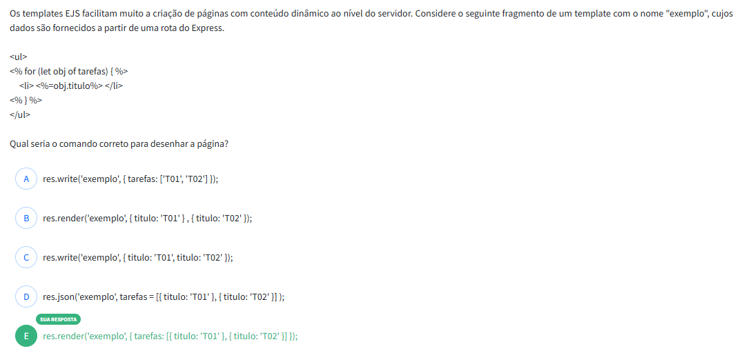 <p>Os templates EJS facilitam muito a criação de páginas com dinâmico ao nível do servidor. Considere o seguinte fragmento de um template com o nome "exemplo", cujos dados são fornecidos a partir de uma rota do Express. <ul> <% for %=obj.titulo%> </li> </ul> Qual seria comando correto para desenhar a página? A B {titulo: titulo: C {titulo: 'T01', titulo: D tarefas = titulo: {titulo: ); SUA RESPOSTA F titulo:</p>