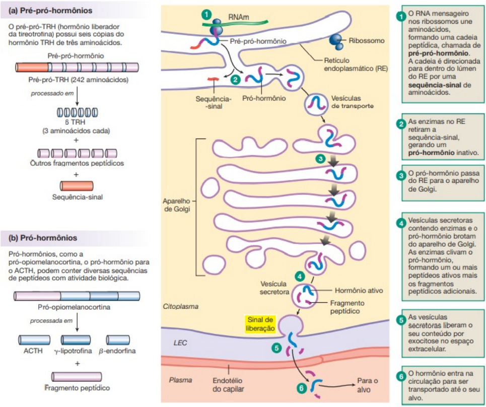 <p>(a) 1 RNAm 1 o RNA mensageiro nos ribossomos une pré-pró-TRH (hormônio liberador aminoácidos, da tireotrofina) possui seis cópias do hormônio TRH de três Ribossomo formando uma cadeia chamada de A cadeia é direcionada endoplasmático (RE) para dentro do lúmen Pré-pró-TRH (242 aminoácidos) 2 do RE por uma sequência-sinal de processado em aminoácidos. Sequência- Pró-hormônio Vesiculas -sinal de transporte 000000 6 TRH 2 As enzimas no RE (3 aminoácidos cada) retiram a + sequência-sinal, gerando um pró-hormônio Outros fragmentos + 3 pró-hormônio passa do RE para aparelho de Golgi. Sequência-sinal Aparelho de Golgi 4 secretoras contendo enzimas e (b) Pró-hormônios pró-hormônio brotam do aparelho de Golgi. Pró-hormônios, como a As enzimas clivam pró-opiomelanocortina, o pró-hormônio para formando um ou mais ACTH. podem conter diversas sequências de peptideos com atividade biológica. peptideos ativos mais os fragmentos secretora Hormônio ativo adicionais. Pró-opiomelanocortina Citoplasma Fragmento processada em Sinal de 5 As vesiculas liberação secretoras liberam seu conteúdo por LEC exocitose no espaço ACTH y-lipotrofina B-endorfina 5 + o hormônio entra na 6 Plasma Endotélio Para o circulação para ser Fragmento do capilar 6 alvo transportado até seu alvo.</p>