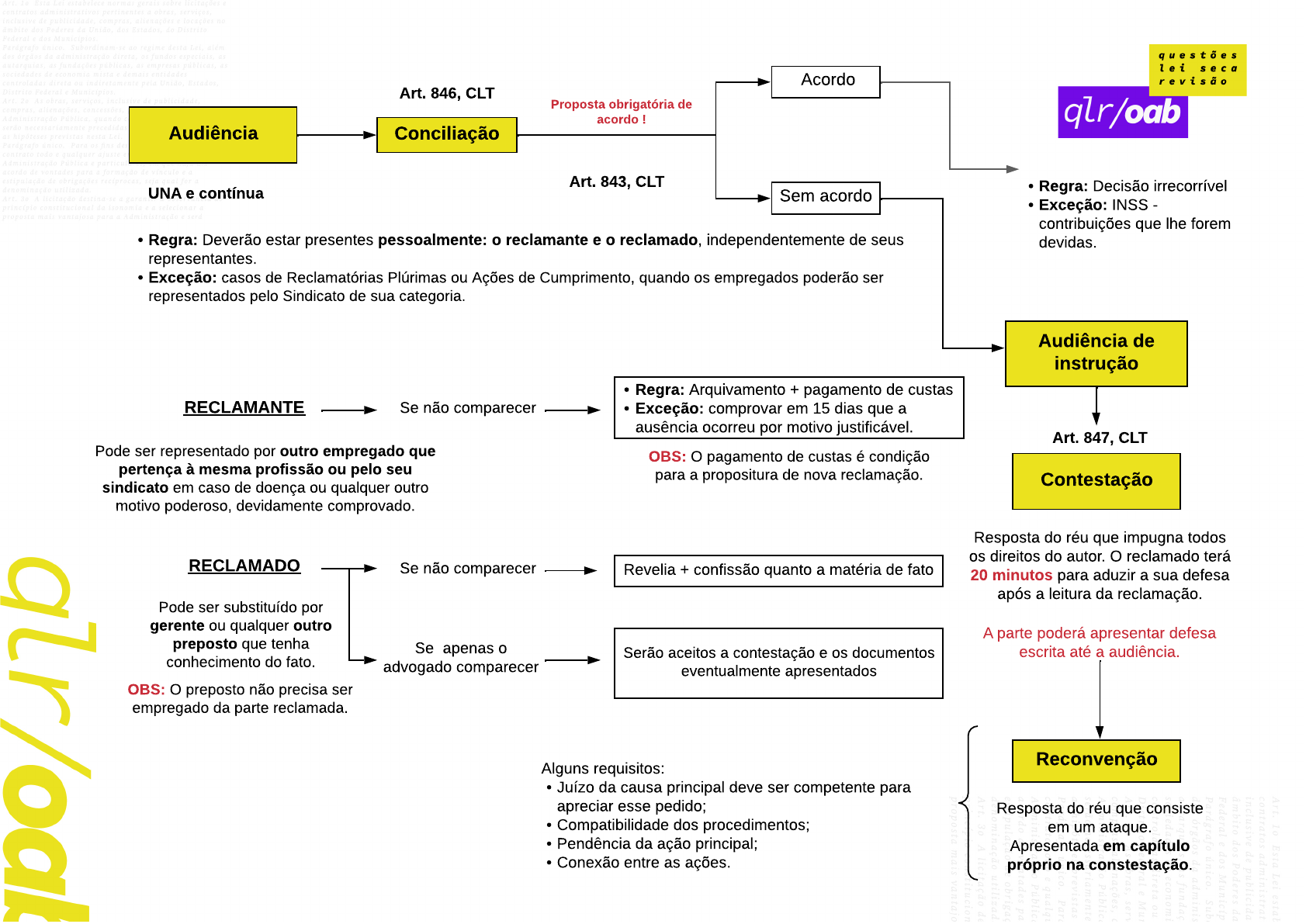 <p>Contestação</p><p>Audiência Conciliação</p><p>Sem acordoUNA e contínua</p><p>Audiência de</p><p>instrução</p><p>Art. 846, CLT</p><p>Proposta obrigatória de</p><p>acordo !</p><p>Acordo</p><p>- Regra: Decisão irrecorrível</p><p>- Exceção: INSS -</p><p>contribuições que lhe forem</p><p>devidas.</p><p>Resposta do réu que impugna todos</p><p>os direitos do autor. O reclamado terá</p><p>20 minutos para aduzir a sua defesa</p><p>após a leitura da reclamação.</p><p>Art. 847, CLT</p><p>A parte poderá apresentar defesa</p><p>escrita até a audiência.</p><p>Reconvenção</p><p>Resposta do réu que consiste</p><p>em um ataque.</p><p>Apresentada em capítulo</p><p>próprio na constestação.</p><p>- Regra: Deverão estar presentes pessoalmente: o reclamante e o reclamado, independentemente de seus</p><p>representantes.</p><p>- Exceção: casos de Reclamatórias Plúrimas ou Ações de Cumprimento, quando os empregados poderão ser</p><p>representados pelo Sindicato de sua categoria.</p><p>Art. 843, CLT</p><p>RECLAMANTE</p><p>RECLAMADO</p><p>Pode ser representado por outro empregado que</p><p>pertença à mesma profissão ou pelo seu</p><p>sindicato em caso de doença ou qualquer outro</p><p>motivo poderoso, devidamente comprovado.</p><p>Pode ser substituído por</p><p>gerente ou qualquer outro</p><p>preposto que tenha</p><p>conhecimento do fato.</p><p>OBS: O preposto não precisa ser</p><p>empregado da parte reclamada.</p><p>Serão aceitos a contestação e os documentos</p><p>eventualmente apresentados</p><p>- Regra: Arquivamento + pagamento de custas</p><p>- Exceção: comprovar em 15 dias que a</p><p>ausência ocorreu por motivo justificável.</p><p>Se não comparecer</p><p>OBS: O pagamento de custas é condição</p><p>para a propositura de nova reclamação.</p><p>Se não comparecer Revelia + confissão quanto a matéria de fato</p><p>Se apenas o</p><p>advogado comparecer</p><p>Alguns requisitos:</p><p>- Juízo da causa principal deve ser competente para</p><p>apreciar esse pedido;</p><p>- Compatibilidade dos procedimentos;</p><p>- Pendência da ação principal;</p><p>- Conexão entre as ações.</p><p>Nathalia do Espírito Santo Xavier - nathxaviers4@gmail.com - CPF: 060.217.895-98</p><p>Produção de</p><p>provas</p><p>Razões finais</p><p>Segunda</p><p>proposta de</p><p>conciliação</p><p>Sentença</p><p>Réplica</p><p>O reclamante poderá</p><p>manifestar-se no prazo</p><p>assinalado pelo juiz.</p><p>Contestação</p><p>OBS: Findo o interrogatório, poderá</p><p>qualquer dos litigantes retirar-se,</p><p>prosseguindo a instrução com o seu</p><p>representante.</p><p>Art. 848, CLT</p><p>- Interrogação dos litigantes:</p><p>reclamante e reclamada.</p><p>- Testemunhas do reclamante,</p><p>- Testemunhas da reclamada</p><p>- Peritos</p><p>- Técnicos, se houver.</p><p>Prazo não excedente de 10</p><p>minutos para cada uma.</p><p>Art. 850, CLT Art. 849, CLT</p><p>- Regra: contínua,</p><p>- Exceção: Marcará para a</p><p>primeira audiência desimpedida,</p><p>por motivo de força maior</p><p>Audiência de</p><p>instrução</p><p>OBS: Também pode ser escrita,</p><p>conforme designação do juíz.</p><p>Proposta obrigatória de</p><p>acordo!</p><p>NÚMERO DE TESTEMUNHAS</p><p>- Proc. ordinário: 3</p><p>- Proc. sumaríssimo: 2</p><p>- Inquérito judicial para</p><p>apuração de falta grave: 6</p><p>Nathalia do Espírito Santo Xavier - nathxaviers4@gmail.com - CPF: 060.217.895-98</p><p>3M - PROCEDIMENTO COMUM (Reclamação, Audiência e Resposta)</p><p>Página 2</p><p>Página 3</p>