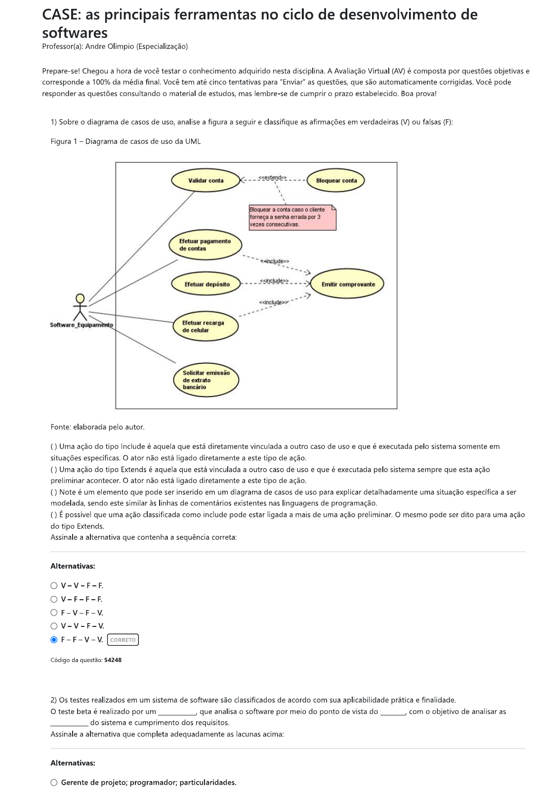 <p>CASE: as principais ferramentas no ciclo de desenvolvimento de softwares Professor(a): Andre Olimpio (Especialização) Prepare-se! Chegou a hora de você testar o conhecimento adquirido nesta disciplina. A Avaliação Virtual (AV) é composta por questões objetivas e corresponde a 100% da média final. Você tem até cinco tentativas para "Enviar" as questões, que são automaticamente corrigidas. Você pode responder as questões consultando o material de estudos, mas lembre-se de cumprir o prazo estabelecido. Boa prova! 1) Sobre o diagrama de casos de uso, analise a figura a seguir e classifique as afirmações em verdadeiras (V) ou falsas (F) Figura 1 Diagrama de casos de uso da UML <<extend>> Validar conta Bloquear conta Bloquear a conta caso cliente forneça a senha errada por 3 vezes consecutivas. Efetuar pagamento de contas <<include>> <<include>> Efetuar depósito Emitir comprovante <<include>> Software_Equipamento Efetuar recarga de celular Solicitar emissão de extrato bancário Fonte: elaborada pelo autor. Uma ação do tipo Include é aquela que está diretamente vinculada a outro caso de uso e que é executada pelo sistema somente em situações específicas. ator não está ligado diretamente a este tipo de ação. Uma ação do tipo Extends é aquela que está vinculada a outro caso de uso e que é executada pelo sistema sempre que esta ação preliminar acontecer. ator não está ligado diretamente a este tipo de ação. Note é um elemento que pode ser inserido em um diagrama de casos de uso para explicar detalhadamente uma situação específica a ser modelada, sendo este similar às linhas de comentários existentes nas linguagens de programação. É possível que uma ação classificada como include pode estar ligada a mais de uma ação preliminar. mesmo pode ser dito para uma ação do tipo Extends Assinale a alternativa que contenha a sequência correta: Alternativas: CORRETO Código da questão: 54248 2) Os testes realizados em um sistema de software são classificados de acordo com sua aplicabilidade prática e finalidade. O teste beta é realizado por um que analisa o software por meio do ponto de vista do com o objetivo de analisar as do sistema e cumprimento dos requisitos. Assinale a alternativa que completa adequadamente as lacunas acima: Alternativas: Gerente de projeto; programador; particularidades.</p><p>Grupo específico; usuário final; funcionalidades. CORRETO Grupo específico; analista de sistemas; finalidades. Profissional de TI; grupo de usuários; gerências. Profissional de TI; desenvolvedor do software; funcionalidades. Código da questão: 54287 3) Sobre ferramentas Case utilizadas para modelagem de sistemas, classifique as afirmações a seguir em verdadeiras (V) ou falsas (V): Astah é uma ferramenta orientada a objetos que permite, entre outras coisas, criar códigos em Java e outras linguagens de programação, além de integrar o sistema com um servidor de banco de dados. Netbeans é uma ferramenta open source e multiplataforma, ou seja, possui código-fonte aberto e pode ser instalado em qualquer sistema operacional. O Microsoft Visio é um tipo de IDE que permite a compilação de códigos escritos em linguagens C#, VB.NET e oferecendo ao desenvolvedor um vasto leque de possibilidade para programação de computadores, como, por exemplo, games em 3-D e sistemas web de controle de vendas. Eclipse IDE é uma ferramenta de licença proprietária que não possui versão gratuita. Mas apresenta uma versão para testes de 30 dias disponível no site oficial da empresa que desenvolveu esta ferramenta. Assinale a alternativa que contenha a sequência correta: Alternativas: CORRETO V-F-V-F Código da questão: 54251 4) Sobre os conceitos pipeline de dados, é possível afirmar que: I. pipeline de dados pode ser definido como um conjunto de canais que são criados com o intuito de garantir o fluxo de informações geradas a partir de entradas específicas nas quais os dados contidos serão devidamente processados e enviados para outro processo. II. Refere-se a uma estrutura escrita com base no framework Ruby on Rails, sendo, assim, um conjunto de bibliotecas utilizadas para aumentar a velocidade e a facilidade de criação de websites orientados a banco de dados, ou seja, aplicações baseadas em estruturas predefinidas com conectividade com a maioria dos bancos de dados existentes no mercado atual. III. termo data lake refere-se a um ambiente de armazenamento variado de dados. IV. Utiliza uma interface-padrão que permite a visualização do controle e monitoramento das tarefas existentes no projeto de desenvolvimento do software por meio de quadros (boards), permitindo criar um amplo panorama de cada uma dessas tarefas. A partir dessas afirmações, podemos afirmar que são verdadeiras: Alternativas: III IV. INCORRETO II III. IV. III IV. Código da questão: 54277 5) Os testes de software seguem padrões e conceitos que permitem que estes sejam validados e posteriormente sirvam de medidores para se mensurar a qualidade desse software. Um desses conceitos utilizados é o BDD (Behavior Driven Development, em português: desenvolvimento guiado por comportamento). Trata-se de uma técnica de que encoraja a colaboração entre desenvolvedores, setores de qualidade e ou de negócios em um Assinale a alternativa que completa adequadamente as lacunas acima: Alternativas: Análise de requisitos; programadores de dados; objeto de software. Banco de dados; gerentes de projeto; teste de software. Desenvolvimento ágil; pessoas não técnicas; projeto de software. CORRETO</p><p>Testes de software; pessoas técnicas; documento de software. Controle de versionamento; grupos de sistemas; gerenciamento de riscos. Código da questão: 54288 6) A UML é o padrão de referência para modelagem de sistemas de software, sendo utilizada por profissionais de do mundo todo. Ela apresenta 14 diagramas que têm como finalidade fazer uma visualização do sistema em