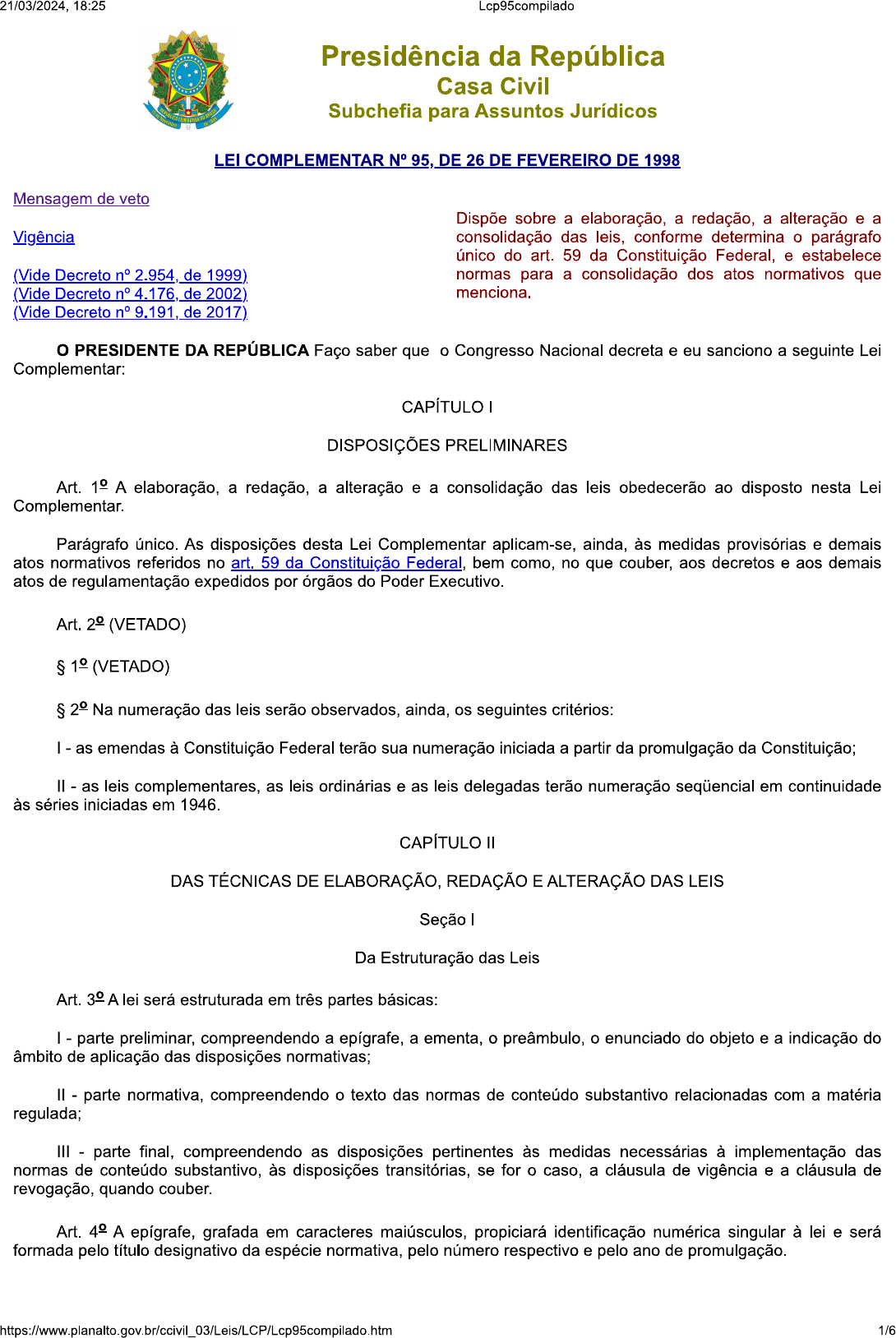 <p>21/03/2024, 18:25 Lcp95compilado Presidência da República Casa Civil Subchefia para Assuntos Jurídicos LEI COMPLEMENTAR N° 95, DE 26 DE FEVEREIRO DE 1998 Mensagem de veto Dispõe sobre a elaboração, a redação, a alteração e a Vigência consolidação das leis, conforme determina o parágrafo único do art. 59 da Constituição Federal, e estabelece (Vide Decreto n° 2.954, de 1999) normas para a consolidação dos atos normativos que (Vide Decreto n° 4.176, de 2002) menciona. (Vide Decreto n° 9.191, de 2017) o PRESIDENTE DA REPUBLICA Faço saber que o Congresso Nacional decreta e eu sanciono a seguinte Lei Complementar: CAPÍTULO DISPOSIÇÕES PRELIMINARES Art. A elaboração, a redação, a alteração e a consolidação das leis obedecerão ao disposto nesta Lei Complementar. Parágrafo único. As disposições desta Lei Complementar aplicam-se, ainda, às medidas provisórias e demais atos normativos referidos no art. 59 da Constituição Federal, bem como, no que couber, aos decretos e aos demais atos de regulamentação expedidos por órgãos do Poder Executivo. Art. 2° (VETADO) § (VETADO) § 2° Na numeração das leis serão observados, ainda, os seguintes critérios: as emendas à Constituição Federal terão sua numeração iniciada a partir da promulgação da Constituição; - as leis complementares, as leis ordinárias e as leis delegadas terão numeração seqüencial em continuidade às séries iniciadas em 1946. CAPÍTULO DAS TÉCNICAS DE ELABORAÇÃO, REDAÇÃO ALTERAÇÃO DAS LEIS Seção Da Estruturação das Leis Art. 3° A lei será estruturada em três partes básicas: - parte preliminar, compreendendo a epígrafe, a ementa, o preâmbulo, o enunciado do objeto e a indicação do âmbito de aplicação das disposições normativas; - parte normativa, compreendendo o texto das normas de conteúdo substantivo relacionadas com a matéria regulada; III parte final, compreendendo as disposições pertinentes às medidas necessárias à implementação das normas de conteúdo substantivo, às disposições transitórias, se for o caso, a cláusula de vigência e a cláusula de revogação, quando couber. Art. A epígrafe, grafada em caracteres maiúsculos, propiciará identificação numérica singular à lei e será formada pelo título designativo da espécie normativa, pelo número respectivo e pelo ano de promulgação. https://www.planalto.gov.br/ccivil_03/Leis/LCP/Lcp95compilado.htm 1/6</p><p>21/03/2024, 18:25 Lcp95compilado Art. 5° A ementa será grafada por meio de caracteres que a realcem e explicitará, de modo conciso e sob a forma de título, o objeto da lei. Art. 6° O preâmbulo indicará o órgão ou instituição competente para a prática do ato e sua base legal. Art. primeiro artigo do texto indicará o objeto da lei e o respectivo âmbito de aplicação, observados os seguintes princípios: - excetuadas as codificações, cada lei tratará de um único objeto; - a lei não conterá matéria estranha a seu objeto ou a este não vinculada por afinidade, pertinência ou conexão; III - o âmbito de aplicação da lei será estabelecido de forma tão específica quanto o possibilite o conhecimento técnico ou científico da área respectiva; IV - o mesmo assunto não poderá ser disciplinado por mais de uma lei, exceto quando a subseqüente se destine a complementar lei considerada básica, vinculando-se a esta por remissão expressa. Art. 8° A vigência da lei será indicada de forma expressa e de modo a contemplar prazo razoável para que dela se tenha amplo conhecimento, reservada a cláusula "entra em vigor na data de sua publicação" para as leis de pequena repercussão. § A contagem do prazo para entrada em vigor das leis que estabeleçam período de vacância far-se-á com a inclusão da data da publicação e do último dia do prazo, entrando em vigor no dia subseqüente à sua consumação integral. (Incluído pela Lei Complementar n° 107, de 26.4.2001) § 2° As leis que estabeleçam período de vacância deverão utilizar a cláusula 'esta lei entra em vigor após decorridos (o número de) dias de sua publicação oficial. (Incluído pela Lei Complementar 107, de Art. 9° A cláusula de revogação deverá enumerar, expressamente, as leis ou disposições legais revogadas. (Redação dada pela Lei Complementar n° 107, de 26.4.2001) Parágrafo único. (VETADO) (Incluído pela Lei Complementar 107, de 26.4.2001) Seção Da Articulação e da Redação das Leis Art. 10. Os textos legais serão articulados com observância dos seguintes princípios: - - a unidade básica de articulação será o artigo, indicado pela abreviatura "Art.", seguida de numeração ordinal até o nono e cardinal a partir deste; - os artigos desdobrar-se-ão em parágrafos ou em incisos; os parágrafos em incisos, os incisos em alíneas e as alíneas em itens; III - os parágrafos serão representados pelo sinal gráfico seguido de numeração ordinal até o nono e cardinal a partir deste, utilizando-se, quando existente apenas um, a expressão "parágrafo único" por extenso; IV - os incisos serão representados por algarismos romanos, as alíneas por letras minúsculas e os itens por algarismos arábicos; V - o agrupamento de artigos poderá constituir o de Subseções, a Seção; o de Seções, o Capítulo; o de Capítulos, o Título; o de Títulos, o Livro e o de Livros, a Parte; VI - os Capítulos, Títulos, Livros e Partes serão grafados em letras maiúsculas e identificados por algarismos romanos, podendo estas últimas desdobrar-se em Parte Geral e Parte Especial ou ser subdivididas em partes expressas em numeral ordinal, por extenso; VII - as Subseções e Seções serão identificadas em algarismos romanos, grafadas em letras minúsculas e postas em negrito ou caracteres que as coloquem em realce; VIII - a composição prevista no inciso V poderá também compreender agrupamentos em Disposições Preliminares, Gerais, Finais ou Transitórias