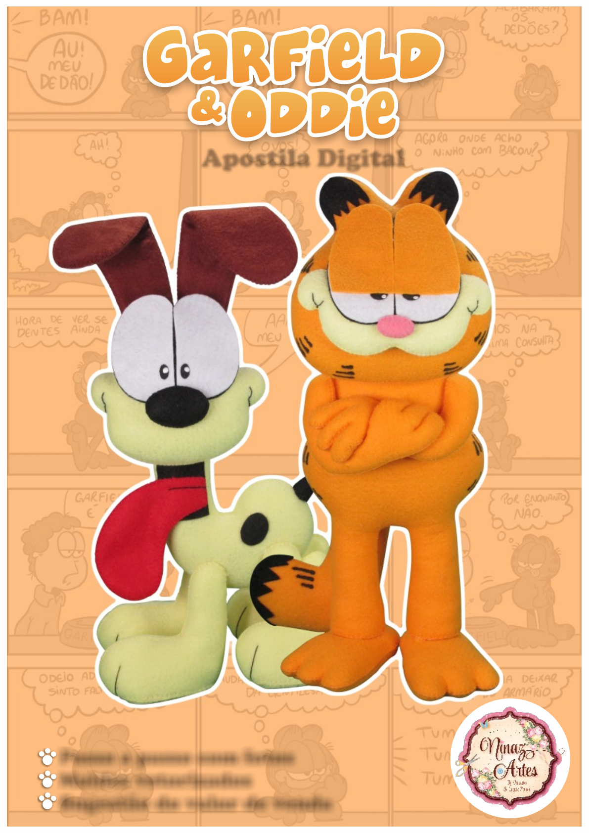 <p>GarfieldGarfield</p><p>OddieOddie&&</p><p>Apostila Digital</p><p>Passo a passo com fotos</p><p>Moldes vetorizados</p><p>Sugestão do valor de venda</p><p>- Leia com atenção toda a apostila antes de iniciar a confecção,</p><p>pois uma parte complementa a outra. Siga as fotos sempre lendo</p><p>a descrição.</p><p>- Recomendo imprimir somente os moldes e seguir o PAP (passo a</p><p>passo) direto pela tela o computador, pois a imagem fica mais</p><p>nítida e colorida.</p><p>- O PAP foi preparado com as peças sendo confeccionadas a mão.</p><p>- Para costura a mão, utilize ponto caseado. Ele fica mais</p><p>resistente e dá um charme artesanal a peça.</p><p>- Para que sua peça tome forma, você deve caprichar no</p><p>enchimento. Coloque fibra até preencher toda a peça, deixando-a</p><p>firme.</p><p>- Antes de colar qualquer detalhe da sua peça, sempre posicione</p><p>antes e ponha um alfinete para visualizar se está bem alinhado.</p><p>- Se você colar qualquer parte da sua peça errada com a cola</p><p>quente, use um secador de cabelo para aquecer a região e</p><p>descolar.</p><p>- Se não encontrar algum tom de feltro, você pode substituir por</p><p>outro de cor próxima...aí entra a licença poética. Pode também</p><p>usar os apliques e detalhes como quiser, o mundo do feltro te</p><p>possibilita mil e uma ideias!</p><p>- O feltro é um material que não pode ser lavado. Para a limpeza</p><p>da peça, utilize somente um espanador. Para conservar por mais</p><p>tempo, pode espirrar termolina caseira (receita no final da</p><p>apostila) com um borrifador.</p><p>DICAS</p><p>3</p><p>TAMANHO: 32 cm</p><p>Materiais</p><p>GarfieldGarfield</p><p>Feltro nas cores: Amarelo Claro, Laranja, Rosa, Branca e</p><p>Preto.</p><p>Meada Anchor ou linha de costura nas cores compatíveis</p><p>com cada tom de feltro.</p><p>(Caso prefira, pode usar linha invisível). E preta para bordar.</p><p>Tinta acripuff ou acrilex: branca e preta.</p><p>Plumante, papel paraná ou papelão, pistola de cola quente,</p><p>tubos de cola quente (ou</p><p>cola de silicone fria, se preferir), caneta comum ou</p><p>fantasminha, tesoura, agulha.</p><p>4</p><p>Cole a parte preta</p><p>na pontinha do</p><p>rabo.</p><p>Vá costurando e</p><p>enchendo aos poucos o</p><p>corpo. Faça o mesmo com</p><p>a cabeça...</p><p>Cole as</p><p>pontinhas da</p><p>orelha também.</p><p>Separe as bases</p><p>das pernas e</p><p>posicione.</p><p>Irá iniciar a costura pelo</p><p>centro das pernas, depois a</p><p>base e depois subindo pelas</p><p>laterais das pernas.</p><p>...até finalizar</p><p>ambas. Rabo</p><p>também.</p><p>Com a caneta</p><p>fantasminha (use o</p><p>gabarito) risque e depois</p><p>borde a bochecha no</p><p>focinho.</p><p>E depois de encher e</p><p>costurar, cole o focinho</p><p>no rosto como</p><p>indicado.</p><p>Cole os olhos em</p><p>um pedaço de</p><p>feltro preto...</p><p>5</p><p>GarfieldGarfield</p><p>Corte o excesso das</p><p>beiradas deixando</p><p>apenas 1 milímetro para</p><p>fazer a sombra do olho.</p><p>Encha e cole o</p><p>nariz no rosto.</p><p>E depois cole-os na</p><p>lateral do tronco,</p><p>virados assim para</p><p>frente.</p><p>Depois cole as</p><p>pálpebras.</p><p>E as cole no</p><p>rosto como</p><p>indicado.</p><p>Depois cole ou</p><p>costure a cabeça</p><p>ao tronco.</p><p>Costure e encha</p><p>os bracinhos.</p><p>Então você vai passar</p><p>cola no braço esquerdo</p><p>e segurar firme os</p><p>dedinhos para dentro</p><p>para colar dessa forma.</p><p>Depois vai passar cola</p><p>no braço direito e</p><p>colar a outra</p><p>mãozinha como</p><p>indicado.</p><p>6</p><p>Garfield</p><p>Ficará como na</p><p>figura, com braços</p><p>cruzados.</p><p>Passe cola na base</p><p>e cole nos pés na</p><p>posição indicada.</p><p>Depois com a</p><p>tinta preta fiz as</p><p>riscas das laterais</p><p>do rosto...</p><p>Cole a base de papel</p><p>paraná por dentro de duas</p><p>solas espelhadas.</p><p>(obs: costumo colocar pesos</p><p>colados na sola, como pedra</p><p>de aquário por exemplo)</p><p>Costure e encha</p><p>bem os pés.</p><p>Aqui pintei a pupila</p><p>com tinta preta, mas</p><p>pode colar em feltro</p><p>se preferir.</p><p>Com um pingo de</p><p>tinta branca faça</p><p>o brilho dos olhos.</p><p>...e também as</p><p>da laterais do</p><p>corpo e rabo.</p><p>Finalizado.</p><p>7</p><p>Garfield</p><p>Feltro nas cores: Amarelo Claro, Ferrugem, Vermelho Noel,</p><p>Branca e Preto.</p><p>Meada Anchor ou linha de costura nas cores compatíveis com</p><p>cada tom de feltro.</p><p>(Caso prefira, pode usar linha invisível). E preta para bordar.</p><p>Tinta acripuff ou acrilex: branca e preta.</p><p>Plumante, papel paraná ou papelão, pistola de cola quente,</p><p>tubos de cola quente (ou</p><p>cola de silicone fria, se preferir), caneta comum ou</p><p>fantasminha, tesoura, agulha e</p><p>manta R1.</p><p>8</p><p>TAMANHO: 30 cm</p><p>Materiais</p><p>OddieOddie</p><p>Com a caneta</p><p>fantasminha (use o</p><p>gabarito) risque e</p><p>borde a bochecha.</p><p>E as cole no</p><p>rosto como</p><p>indicado.</p><p>Cole a manta R1 por</p><p>dentro das orelhas,</p><p>deixe sobrar 2</p><p>milímetros nas</p><p>beiradas.</p><p>Costure e encha</p><p>corpo e cabeça até</p><p>finalizar ambas.</p><p>Siga o mesmo</p><p>procedimento do</p><p>olho do Garfield.</p><p>Costure e encha nariz</p><p>e rabinho (esse tem</p><p>uma base).</p><p>Cole o nariz no</p><p>rosto.</p><p>Então caseie</p><p>toda a volta.</p><p>Depois cole-as</p><p>atrás da cabeça.</p><p>9</p><p>OddieOddie</p><p>Passe um pinguinho de</p><p>cola na metade delas,</p><p>bem na beirada. Dobre-</p><p>as como indicado e elas</p><p>ficarão na posição da</p><p>imagem.</p><p>...e cole como</p><p>indicado.</p><p>Costure e encha</p><p>bem todas as</p><p>patas.</p><p>Cole a boca no</p><p>tronco.</p><p>Caseie e borde a</p><p>língua...</p><p>Cole ou costure</p><p>a cabeça ao</p><p>tronco.</p><p>Cole a base de papel paraná</p><p>por dentro das so