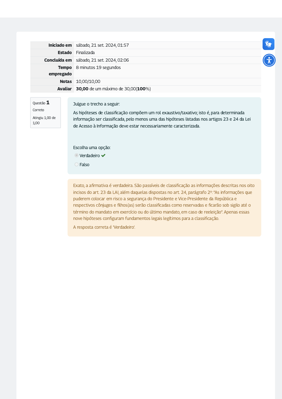 <p>Questão 1</p><p>Correto</p><p>Atingiu 1,00 de</p><p>1,00</p><p>Iniciado em sábado, 21 set. 2024, 01:57</p><p>Estado Finalizada</p><p>Concluída em sábado, 21 set. 2024, 02:06</p><p>Tempo</p><p>empregado</p><p>8 minutos 19 segundos</p><p>Notas 10,00/10,00</p><p>Avaliar 30,00 de um máximo de 30,00(100%)</p><p>Julgue o trecho a seguir:</p><p>As hipóteses de classi�cação compõem um rol exaustivo/taxativo; isto é, para determinada</p><p>informação ser classi�cada, pelo menos uma das hipóteses listadas nos artigos 23 e 24 da Lei</p><p>de Acesso à Informação deve estar necessariamente caracterizada.</p><p>Escolha uma opção:</p><p>Verdadeiro </p><p>Falso</p><p>Exato, a a�rmativa é verdadeira. São passíveis de classi�cação as informações descritas nos oito</p><p>incisos do art. 23 da LAI, além daquelas dispostas no art. 24, parágrafo 2º: “As informações que</p><p>puderem colocar em risco a segurança do Presidente e Vice-Presidente da República e</p><p>respectivos cônjuges e �lhos(as) serão classi�cadas como reservadas e �carão sob sigilo até o</p><p>término do mandato em exercício ou do último mandato, em caso de reeleição”. Apenas essas</p><p>nove hipóteses con�guram fundamentos legais legítimos para a classi�cação.</p><p>A resposta correta é 'Verdadeiro'.</p><p>Questão 2</p><p>Correto</p><p>Atingiu 1,00 de</p><p>1,00</p><p>Sobre os graus de classi�cação estabelecidos pela LAI, identi�que a alternativa CORRETA:</p><p>Escolha uma opção:</p><p>a. As informações podem ser classi�cadas em graus reservado, con�dencial, secreto e</p><p>ultrassecreto.</p><p>b. A autoridade competente para a prorrogação da classi�cação em grau ultrassecreto é</p><p>a autoridade classi�cadora.</p><p>c. A contagem</p><p>do prazo de</p><p>sigilo tem</p><p>por data</p><p>inicial a data</p><p>de produção</p><p>do</p><p>documento</p><p>e não a data</p><p>de</p><p>classi�cação.</p><p> Exato! A a�rmativa está correta! A contagem tem por data inicial a</p><p>data de produção do documento que registra a informação que</p><p>esteja sendo classi�cada. Ou seja, se uma informação produzida há</p><p>10 anos for classi�cada como secreta na data de hoje, ela se</p><p>tornará ostensiva em 5 anos. Isso signi�ca, por exemplo, que um</p><p>documento produzido há 6 anos não poderia ser classi�cado como</p><p>"Reservado”, uma vez que o prazo de sigilo desse grau (5 anos) já</p><p>estaria expirado. Da mesma forma, classi�car como "Secreto” um</p><p>documento produzido há 20 anos também não produz efeito de</p><p>sigilo.</p><p>d. Qualquer autoridade pode realizar o ato de classi�cação, de modo a garantir o sigilo de</p><p>informações imprescindíveis à segurança da sociedade e do Estado.</p><p>e. Expirado o prazo da classi�cação, as informações se tornam públicas. Isso signi�ca que,</p><p>caso existam informações pessoais sensíveis ou protegidas por sigilos legais na</p><p>documentação, elas serão divulgadas.</p><p>Sua resposta está correta.</p><p>A alternativa C é a correta. As informações em poder dos órgãos e entidades públicas,</p><p>observado o seu teor e em razão de imprescindibilidade do sigilo à segurança da sociedade ou</p><p>do Estado, poderão ser classi�cadas em três diferentes graus:</p><p>ultrassecreto, com prazo de sigilo de até 25 anos (único passível de prorrogação);</p><p>secreto, com prazo de sigilo de até 15 anos; e</p><p>reservado, com prazo de sigilo de até 5 anos.</p><p>Se você ainda tem dúvidas sobre o assunto, reveja os tópicos "1.2 Por quanto tempo as</p><p>informações classi�cadas estão protegidas?” e "1.3 Quais autoridades podem classi�car</p><p>informações?”.</p><p>A resposta correta é: A contagem do prazo de sigilo tem por data inicial a data de produção do</p><p>documento e não a data de classi�cação.</p><p>Questão 3</p><p>Correto</p><p>Atingiu 1,00 de</p><p>1,00</p><p>Questão 4</p><p>Correto</p><p>Atingiu 1,00 de</p><p>1,00</p><p>Conforme estudado no Módulo III, preencha as lacunas a seguir:</p><p>Muito embora o Termo de Classi�cação de Informação (TCI) seja um documento</p><p> , o campo "razões da classi�cação” é considerado .</p><p>público</p><p>sigiloso</p><p>O TCI é um documento público, recaindo restrição de acesso somente a um de seus campos: o</p><p>campo "razões da classi�cação”. Tal precaução é compreensível, pois é justamente nele que a</p><p>autoridade deverá motivar a sua decisão de classi�car, assinalando as razões conjunturais que a</p><p>levaram a adotar determinada hipótese ou grau de sigilo.</p><p>Veja a a�rmação com as lacunas corretas preenchidas:</p><p>Muito embora o Termo de Classi�cação de Informação (TCI) seja um documento público, o</p><p>campo "razões da classi�cação” é considerado sigiloso.</p><p>Se você ainda tem dúvidas sobre o assunto, reveja o tópico 1.4 Quais são os procedimentos para</p><p>a classi�cação de informação?</p><p>A respeito do acesso a informações classi�cadas, julgue o trecho a seguir:</p><p>O acesso a informações classi�cadas em qualquer grau de sigilo por pessoa não credenciada ou</p><p>não autorizada por legislação poderá, excepcionalmente, ser permitido mediante assinatura de</p><p>Termo de Compromisso de Manutenção de Sigilo (TCMS).</p><p>Escolha uma opção:</p><p>Verdadeiro </p><p>Falso</p><p>Exato! A alternativa está correta. Aquelas pessoas que não forem autorizadas por lei ou</p><p>credenciadas e, ademais, tiverem necessidade de conhecer informações classi�cadas, poderão</p><p>acessá-las, excepcionalmente, mediante a assinatura de Termo de Compromisso de Manutenção</p><p>de Sigilo (TCMS).</p><p>A resposta correta é 'Verdadeiro'.</p><p>Questão 5</p><p>Correto</p><p>Atingiu 1,00 de</p><p>1,00</p><p>Sobre as competências da Comissão Mista de Reavaliação de Informaçõe