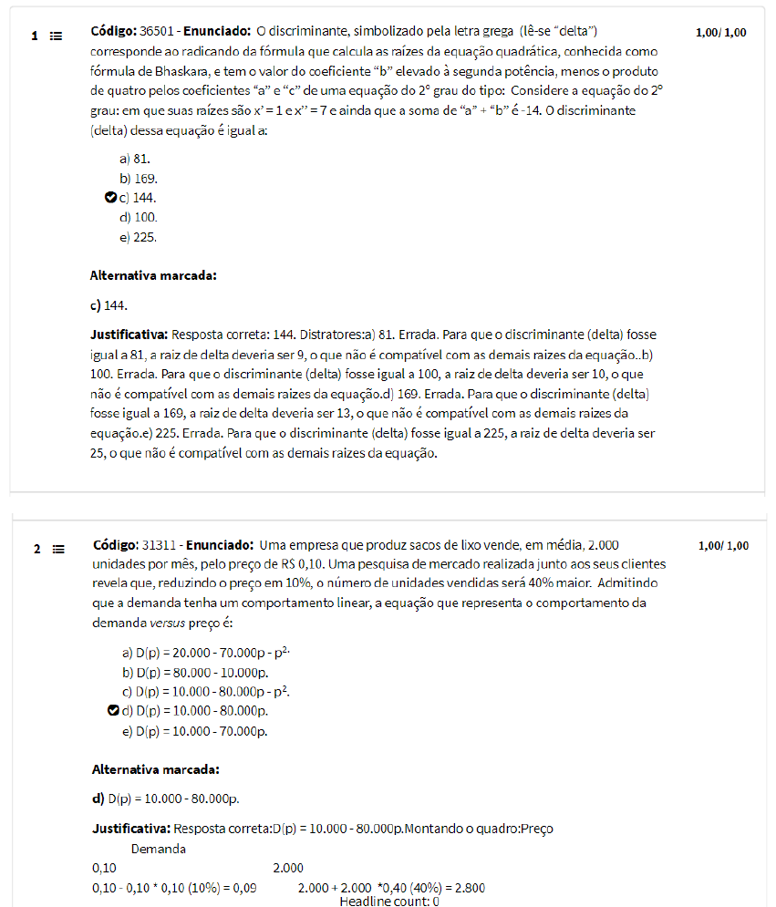 <p>1 Código: 36501 - Enunciado: o discriminante, simbolizado pela letra grega (lê-se "delta") 1,00/1,00 corresponde ao radicando da fórmula que calcula as raízes da equação quadrática, conhecida como fórmula de Bhaskara, e tem valor do coeficiente "b" elevado à segunda potência, menos o produto de quatro pelos coeficientes "a" e de uma equação do 2° grau do tipo: Considere a equação do 2° grau: em que suas raízes ainda que a soma de "a" + "b" é -14. o discriminante (delta) dessa equação é igual a: a) 81. b) 169. c) 144. d) 100. e) 225. Alternativa marcada: c) 144. Justificativa: Resposta correta: 144. Distratores:a) 81. Errada. Para que discriminante (delta) fosse igual a 81, a raiz de delta deveria ser 9, o que não é compatível com as demais raizes da equação..b) 100. Errada. Para que o discriminante (delta) fosse igual a 100, a raiz de delta deveria ser 10, o que não é compatível com as demais raizes da equação.d) 169. Errada. Para que discriminante (delta) fosse igual a 169, a raiz de delta deveria ser 13, que não é compatível com as demais raizes da equação.e) 225. Para que o discriminante (delta) fosse igual a 225, a raiz de delta deveria ser 25, que não é compatível com as demais raizes da equação. 2 Código: 31311 Enunciado: Uma empresa que produz sacos de lixo vende, em média, 2.000 1,00/ 1,00 unidades por mês, pelo preço de R$ 0,10. Uma pesquisa de mercado realizada junto aos seus clientes revela que, reduzindo preço em 10%, número de unidades vendidas será 40% maior. Admitindo que a demanda tenha um comportamento linear, a equação que representa o comportamento da demanda versus preço é: a) D(p) = 20.000 70.000p p2. b) D(p) = 80.000 10.000p. c) D(p) = 10.000 80.000p d) D(p) = 80.000p. e) D(p) = 10.000 70.000p. Alternativa marcada: d) Justificativa: Resposta correta:D(p) = 10.000 80.000p.Montando quadro:Preço Demanda 0,10 2.000 (10%) = 0,09 2.000 + 2.000 *0,40 (40%) = Headline count: 0</p><p>3 Código: 31282 Enunciado: A secretaria municipal de uma cidade do interior estudou o 1,00/1,00 comportamento da taxa de desemprego nos últimos meses e observou que ela vem crescendo. Baseado nos últimos números registrados, chegou-se ao seguinte gráfico, que relaciona a taxa de desemprego pelo tempo expresso em meses: Para que a prefeitura dessa cidade possa fazer seu planejamento social estratégico a respeito desse cenário econômico, qual deverá ser a taxa de desemprego projetada em junho desse mesmo ano, caso essa tendência seja mantida? a) 9,0% b) 6,0% c) d) e) 7,0% Alternativa marcada: d) Justificativa: Resposta correta: Associar 1 a jan, 2 a fev, 6 a jun. Coeficiente angular: Coeficiente linear: 4,8 = Taxa para t=6 (junho), temos: taxa (6) 8,0. Distratores:a) para a taxa de crescimento de 5% teriamos o tempo Taxa (5) = 0,8t período ao longo de julho, diferente de junho conforme solicitado.b) para a taxa de crescimento de 6% teriamos 3,2 8,0, agosto, diferente de junho conforme solicitado.c) para a taxa de crescimento de 7% teriamos tempo Taxa (7) 0,8t + 3,2 = 0,8 3,2 5,6 + 3,2 = 8,8, período ao longo de agosto, diferente de junho conforme solicitado.e) para a taxa de crescimento de 9% teriamos o tempo Taxa (9) longo de outubro, diferente de junho conforme solicitado. 4 Código: 31321 Enunciado: Uma forma de classificar uma função é comportamento de 1,00/1,00 seu valor em função da variação crescente da variável independente (eixo horizontal). Assim, uma função pode ser crescente, decrescente ou constante. Considere a função descrita no gráfico, a seguir: A partir da análise gráfica, indique a afirmação correta: a) A função é crescente no intervalo: 4 <x<6. b) A função é decrescente no intervalo: c) A função é decrescente no intervalo: Headline count: 0 2/6 15/12/2020 Ilumno d) A função é crescente no intervalo: e) A função é crescente no intervalo: Alternativa marcada: c) A função é decrescente no intervalo: 0<x<1. Justificativa: Resposta correta:A função é decrescente no intervalo: 0<x<1.Uma função que diminui o seu valor com o aumento da variável do eixo horizontal (x) apresenta um comportamento decrescente, e se com aumento de X valor da função aumentar ela será dita crescente neste intervalo. Caso valor de X aumente e o valor da função não se alterar a função é dita constante. Neste caso no intervalo de 0<x<1 valor da função diminui quando valor de X varia de 0 para 1, que caracteriza uma função descrescente. Distratores:A função é crescente no intervalo: 0 <x<4. Errada. Na verdade, no intervalo de 0 a 1 ela é decrescente, mas no intervalor de 1 a 4 ela é crescente.A função é crescente no intervalo: Errada, pois o valor de X quando varia de -2 a 0 a função diminui de valor que representa uma função descrescente. A função é decrescente no intervalo: Errada, pois o valor de X quando varia de -4 a -2 a função aumenta de valor o que representa uma função crescente. A função é crescente no intervalo: 4<x<6. Errada, pois valor de X quando varia de 4 a 6 a função diminui de valor o que representa uma função decrescente.</p><p>5 Código: 31288 Enunciado: Uma empresa de colchões encomendou uma pesquisa de mercado 1,00/1,00 para que fosse determinada a demanda mensal de suas vendas de colchões em relação ao preço de venda praticado e chegou à seguinte informação: Q(p) 9.500 10p, em que 300 p < 10.000. preço que deve ser cobrado para que a receita seja maximizada é: a) R$ 655,00. b) R$ 425,00. c) R$ 575,00. d) R$ 925,00. e) R$ 475,00. Alternativa marcada: e) R$ 475,00. Justificativa: Resposta correta: 10Para que a receita seja máxima, temos:pv = -9.500 R$ 475,00 (referente ao "x" do vértice). Distratores: a) R$ 575,00. Errada. Com o preço de R$ 575,00 teríamos uma receita de R$ 2.156.250,00, diferente da receita máxima de R(475) = 9.500.475 10.475^2 = 2.256.250,00b) R$ 425,00. Errada. Com o preço de R$ 425,00 teríamos uma receita de R
