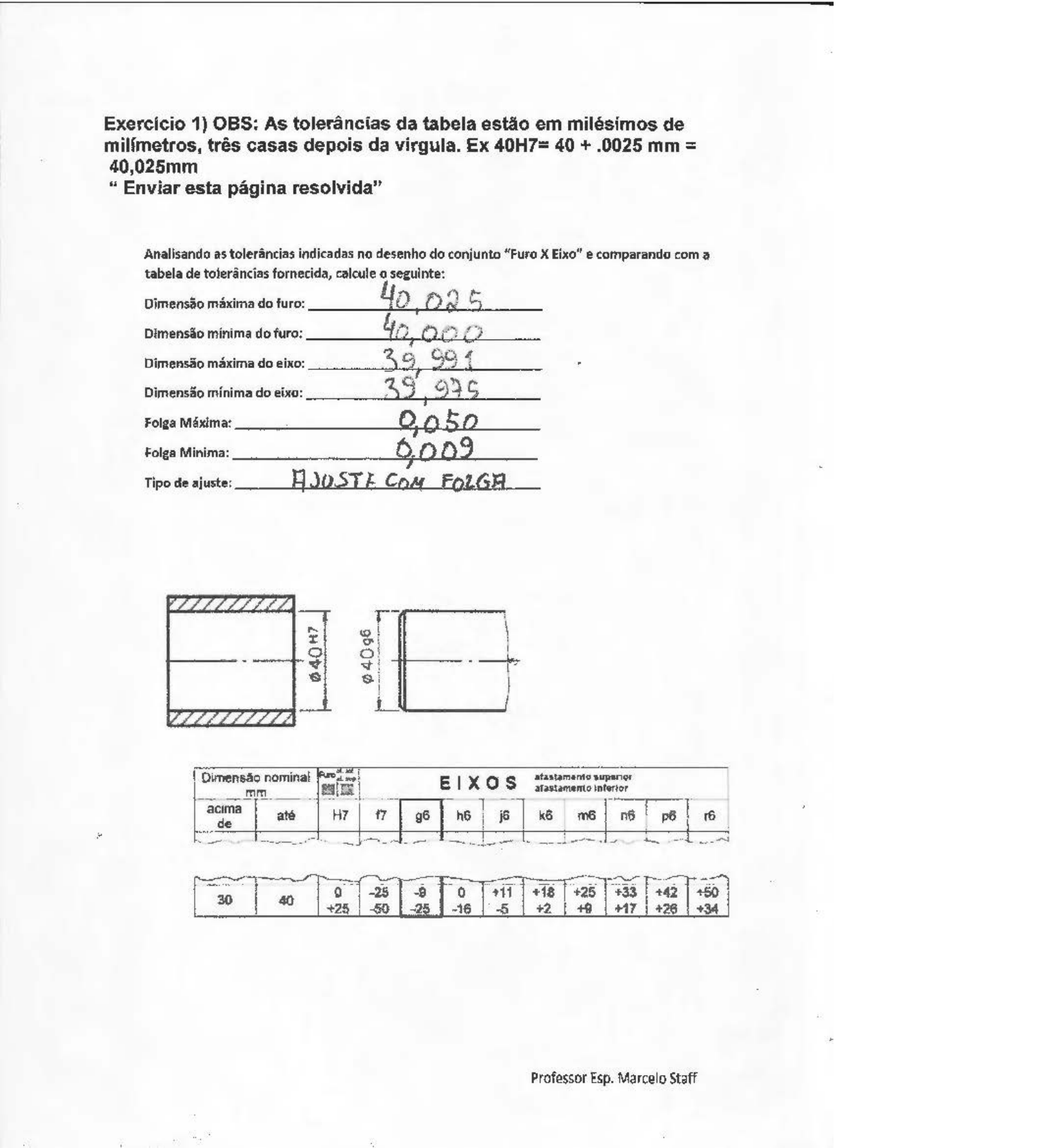 <p>Exercício 1) OBS: As tolerâncias da tabela estão em milésimos de milímetros, três casas depois da virgula. Ex 40H7= 40 + .0025 mm = 40,025mm Enviar esta página resolvida" Analisando as tolerâncias indicadas no desenho do conjunto e comparando com a tabela de tolerâncias fornecida, calcule o seguinte: Dimensão máxima do furo: Dimensão mínima do furo: 40,000 Dimensão máxima do eixo: 39,991 Dimensão mínima do eixo: 39,975 Folga Máxima: 0,050 Folga Minima: 0,009 Tipo de ajuste: AJUSTE COM FOLGA Dimensão nominal EIXOS atastamento superior afastamento mm acima até H7 f7 g6 h6 j6 k6 m6 de p6 r6 0 -25 -9 0 +11 +18 +25 +33 +42 +50 30 40 +25 -50 -25 -16 -5 +2 +9 +17 +26 +34 Professor Esp. Marcelo Staff</p>