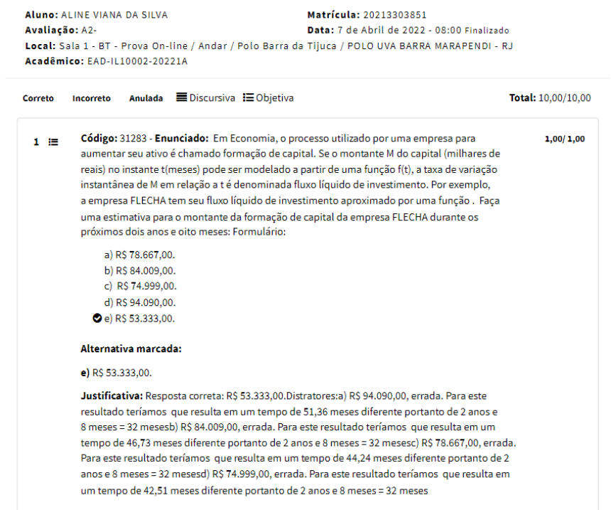 <p>Aluno: ALINE VIANA DA SILVA Matrícula: 20213303851 Avaliação: A2- Data: 7 de Abril de 2022 - 08:00 Finalizado Local: Sala 1 BT - Prova On-line / Andar / Polo Barra da Tijuca / POLO UVA BARRA MARAPENDI RJ Acadêmico: EAD-IL10002-20221A Correto Incorreto Anulada Discursiva Objetiva Total: 10,00/10,00 1 Código: 31283 - Enunciado: Em Economia, processo utilizado por uma empresa para 1,00/1,00 aumentar seu ativo é chamado formação de capital. Se o montante M do capital (milhares de reais) no instante t(meses) pode ser modelado a partir de uma função f(t), a taxa de variação instantânea de M em relação a t é denominada fluxo líquido de investimento. Por exemplo, a empresa FLECHA tem seu fluxo líquido de investimento aproximado por uma função Faça uma estimativa para o montante da formação de capital da empresa FLECHA durante os próximos dois anos e oito meses: Formulário: a) R$ b) R$ 84.009,00. c) R$ d) R$ 94.090,00. e) 53.333,00. Alternativa marcada: e) R$ 53.333,00. Justificativa: Resposta correta: R$ R$ 94.090,00, errada. Para este resultado teríamos que resulta em um tempo de 51,36 meses diferente portanto de 2 anos e 8 meses = 32 mesesb) R$ 84.009,00, errada. Para este resultado teríamos que resulta em um tempo de 46,73 meses diferente portanto de 2 anos e 8 meses = 32 mesesc) R$ 78.667,00, errada. Para este resultado teríamos que resulta em um tempo de 44,24 meses diferente portanto de 2 anos e 8 meses = 32 mesesd) R$ 74.999,00, errada. Para este resultado teríamos que resulta em um tempo de 42,51 meses diferente portanto de 2 anos e 8 meses = 32 meses</p><p>2 Código: 31288 - Enunciado: Uma empresa de colchões encomendou uma pesquisa de mercado 1,00/ 1,00 para que fosse determinada a demanda mensal de suas vendas de colchões em relação ao preço de venda praticado e chegou à seguinte informação: Q(p) = 9.500 10p, em que 300 <p< o preço que deve ser cobrado para que a receita seja maximizada é: a) R$ 925,00. b) R$ 425,00. c) R$ 655,00. d) R$ 475,00. e) R$ 575,00. Alternativa marcada: d) 475,00. Justificativa: Resposta correta: (9.500 10p) = 9.500p 10Para que a receita seja máxima, temos:pv = -9.500 (referente ao "x" do vértice). Distratores: a) R$ 575.00. Errada. Com o preço de 575,00 teríamos uma receita de R$ 2.156.250,00, diferente da receita máxima de R(475) = 9.500.475 10.475^2 = R$ 2.256.250,00b) R$ 425,00. Com o preço de R$ teríamos uma receita de diferente da receita máxima de R(475) = 9.500.475 - 10.475^2 = R$ 655,00. Errada. Com preço de R$ 655,00 teríamos uma receita de R$ 1.932.250,00, diferente da receita máxima de R(475) = 9.500.475 10.475^2 = R$ R$ 925,00. Com o preço de 1/5 18:38 Ilumno 925,00 teríamos uma receita de R$ 231.250,00, diferente da receita máxima de R(475) = 9.500.475 10.475^2 = R$ 2.256.250,00 3 Código: 36501 - Enunciado: o discriminante, simbolizado pela letra grega (lê-se "delta") 2,00/2,00 corresponde ao radicando da fórmula que calcula as raízes da equação quadrática, conhecida como fórmula de Bhaskara, e tem valor do coeficiente "b" elevado à segunda potência, menos produto de quatro pelos coeficientes "a" e "c" de uma equação do 2° grau do tipo: Considere a equação do 2° grau: em que suas raízes e ainda que a soma de "a" + "b" é -14. o discriminante (delta) dessa equação é igual a: a) 100. b) 144. c) 81. d) 169. e) 225. Alternativa marcada: b) 144. Justificativa: Resposta correta: 144. Distratores:a) 81. Errada. Para que o discriminante (delta) fosse igual a 81, a raiz de delta deveria ser 9, que não é compatível com as demais raizes da equação..b) 100. Errada. Para que o discriminante (delta) fosse igual a 100, a raiz de delta deveria ser 10, o que não é compatível com as demais raizes da equação.d) 169. Para que o discriminante (delta) fosse igual a 169, a raiz de delta deveria ser 13, o que não é compatível com as demais raizes da equação.e) 225. Errada. Para que o discriminante (delta) fosse igual a 225, a raiz de delta deveria ser 25, o que não é compatível com as demais raizes da equação.</p><p>4 Código: 31321 Enunciado: Uma forma de classificar uma função é analisar comportamento 1,00/1,00 de seu valor em função da variação crescente da variável independente (eixo horizontal). Assim, uma função pode ser crescente, decrescente ou constante. Considere a função descrita no gráfico, a seguir: A partir da análise gráfica, indique a afirmação correta: a) A função é crescente no intervalo: 0<x<4. b) A função é decrescente no intervalo: 0<x<1. c) A função é crescente no intervalo: d) A função é crescente no intervalo: 4 e) A função é decrescente no intervalo: Alternativa marcada: b) A função é decrescente no intervalo: Justificativa: Resposta correta:A função é decrescente no intervalo: função que diminui o seu valor com o aumento da variável do eixo horizontal (x) apresenta um comportamento decrescente, e se com aumento de o valor da função aumentar ela será dita crescente neste intervalo. Caso o valor de aumente e o valor da função não se alterar a função é dita constante. Neste caso no intervalo de 0<x<1 o valor da função diminui quando o valor de varia de 0 para 1, que caracteriza uma função descrescente. Distratores:A função é crescente no intervalo: 0<x<4. Errada. Na verdade, no intervalo de 0 a 1 ela é decrescente, mas no intervalor de 1 a 4 ela é crescente função é crescente no intervalo: Errada, pois o valor de quando varia de -2 a 0 a função diminui de valor que representa uma função A função é decrescente no intervalo: Errada, pois valor de quando varia de -4 a -2 a função aumenta de valor que representa uma função crescente. A função é crescente no intervalo: 4<x<6. Errada, pois valor de quando varia de 4 a 6 a função diminui de valor o que representa uma função decrescente. 5 Código: 31312 Enunciado: Uma pequena indústria que fabrica exclusivamente lápis vende 1,00