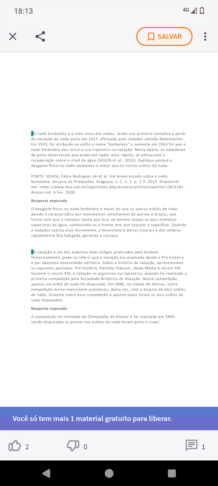 <p>18:13 4G X SALVAR nado borboleta é mais novo dos nados, tendo sua primeira tentativa a partir da variação do nado peito em efetuada pelo nadador alemão Em 1933, foi atribuído ao estilo o nome "borboleta" e somente em 1953 foi que nado borboleta deu início a sua trajetória na Nesta época, os nadadores de peito observaram que poderiam nadar mais se utilizassem a recuperação sobre o nível da água (SOUZA et al., 2013). Explique porque desgaste físico no nado borboleta é maior que outros estilos de FONTE: Fábio Rodrigues de et al. Um breve estudo sobre nado Anuário de Araguaia, n. 1, p. 2013. Disponível em: Acesso em: 6 fev. 2018. Resposta esperada o desgaste físico no nado borboleta é maior do que os outros estilos de nado devido à característica dos movimentos simultâneos de pernas e braços, que fazem com que o nadador tenha que tirar ao mesmo tempo os dois membros superiores da água, conduzindo-os à frente sem que toquem a Quando o nadador realiza esse movimento, a musculatura dorsal (costas) e dos ombros rapidamente fica gerando A natação é um dos esportes mais antigos praticados pelo homem Historicamente, pode-se inferir que a natação era praticada desde a Pré-história e por absoluta necessidade Sobre a história da apresentamos os seguintes períodos: Pré-história, Período Idade Média e século Durante o século a natação se organizou na Inglaterra, quando foi realizada a primeira competição pela Sociedade Britânica de Nessa competição, apenas um estilo de nado foi Em 1896, na cidade de Atenas, outra competição muito importante aconteceu, desta com a disputa de dois estilos de Disserte sobre essa competição e aponte quais foram os dois estilos de nado disputados. Resposta esperada A competição foi chamada de Olimpiadas de Atenas e foi realizada em 1896, sendo disputadas as provas nos estilos de nado foram peito e Você só tem mais 1 material gratuito para liberar. 2 0 1</p>