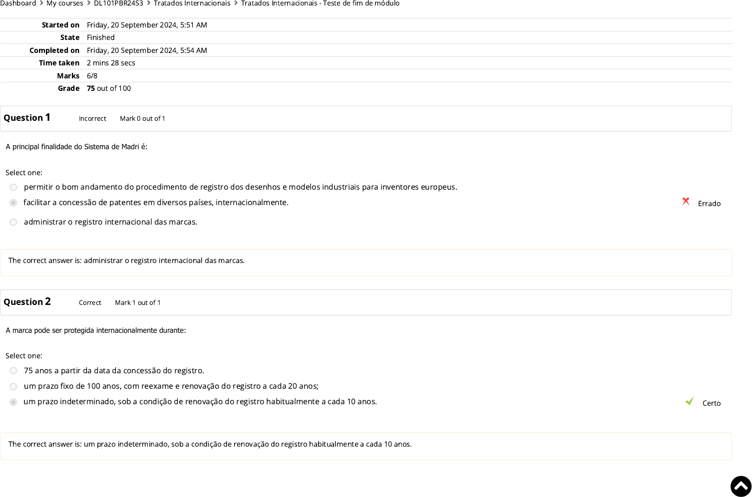 <p>Started on Friday, 20 September 2024, 5:51 AM</p><p>State Finished</p><p>Completed on Friday, 20 September 2024, 5:54 AM</p><p>Time taken 2 mins 28 secs</p><p>Marks 6/8</p><p>Grade 75 out of 100</p><p>Question 1 Incorrect Mark 0 out of 1</p><p>A principal finalidade do Sistema de Madri é:</p><p>Select one:</p><p>permitir o bom andamento do procedimento de registro dos desenhos e modelos industriais para inventores europeus.</p><p>facilitar a concessão de patentes em diversos países, internacionalmente. Errado</p><p>administrar o registro internacional das marcas.</p><p>The correct answer is: administrar o registro internacional das marcas.</p><p>Question 2 Correct Mark 1 out of 1</p><p>A marca pode ser protegida internacionalmente durante:</p><p>Select one:</p><p>75 anos a partir da data da concessão do registro.</p><p>um prazo �xo de 100 anos, com reexame e renovação do registro a cada 20 anos;</p><p>um prazo indeterminado, sob a condição de renovação do registro habitualmente a cada 10 anos. Certo</p><p>The correct answer is: um prazo indeterminado, sob a condição de renovação do registro habitualmente a cada 10 anos.</p><p>Dashboard My courses DL101PBR24S3 Tratados Internacionais Tratados Internacionais - Teste de �m de módulo</p><p></p><p>https://welc.wipo.int/lms/my/</p><p>https://welc.wipo.int/lms/course/view.php?id=10192</p><p>https://welc.wipo.int/lms/mod/quiz/view.php?id=527135</p><p>Question 3 Correct Mark 1 out of 1</p><p>O Sistema de registro internacional de desenhos e modelos industriais é:</p><p>Select one:</p><p>o Sistema de Madri.</p><p>o Acordo de Haia. Certo</p><p>A Convenção de Roma.</p><p>The correct answer is: o Acordo de Haia.</p><p>Question 4 Correct Mark 1 out of 1</p><p>A principal diferença entre a patente e o desenho ou modelo industrial :</p><p>Select one:</p><p>A patente protege a inovação e a invenção, enquanto o desenho ou modelo industrial protegem a aparência do objeto. Certo</p><p>A patente protege a aparência do objeto enquanto o desenho ou modelo industrial protegem a nova inovação ou invenção.</p><p>Não existe diferença entre a patente e um desenho ou modelo industrial.</p><p>The correct answer is: A patente protege a inovação e a invenção, enquanto o desenho ou modelo industrial protegem a aparência do objeto.</p><p>Question 5 Correct Mark 1 out of 1</p><p>O titular de um desenho ou modelo industrial tem a proteção durante:</p><p>Select one:</p><p>Um prazo �xo de 20 anos nos países da União Europeia.</p><p>Um prazo �xo de 50 anos com a possibilidade de renovação por mais 25 anos.</p><p>Um prazo �xo de 10, 15 ou 20 anos em geral, dependendo do país. Certo</p><p>The correct answer is: Um prazo �xo de 10, 15 ou 20 anos em geral, dependendo do país.</p><p></p><p>Question 6 Correct Mark 1 out of 1</p><p>A principal finalidade do Tratado de Cooperação em Matéria de Patentes :</p><p>Select one:</p><p>Simpli�car e tornar mais e�ciente o processo de depósito da proteção da patente em diversos países; Certo</p><p>para conceder patentes mundiais;</p><p>para administrar o depósito de pedidos de patente em nível mundial.</p><p>The correct answer is: Simpli�car e tornar mais e�ciente o processo de depósito da proteção da patente em diversos países;</p><p>Question 7 Incorrect Mark 0 out of 1</p><p>As quatro etapas do processo previsto pelo Tratado de Cooperação em Matéria de Patentes são:</p><p>Select one:</p><p>o depósito, o exame internacional, a publicação internacional, a pesquisa internacional e a fase nacional. Errado</p><p>o depósito, o exame internacional de patentes similares, a pesquisa internacional, a publicação internacional e a fase nacional.</p><p>o depósito, a pesquisa internacional, a publicação internacional, e o exame internacional.</p><p>The correct answer is: o depósito, a pesquisa internacional, a publicação internacional, e o exame internacional.</p><p>Question 8 Correct Mark 1 out of 1</p><p>O Tratado de Cooperação em Matéria de Patentes (PCT) não concede patentes.</p><p>Select one:</p><p>True</p><p>False</p><p>Verdadeiro</p><p>The correct answer is 'True'.</p><p></p><p>◄ Áudio 14: Qual é o papel da Organização Mundial da Propriedade Intelectual e da Organização Mundial do Comércio... Módulo Contratos de Tecnologia ►</p><p>Jump to...</p><p></p><p>https://welc.wipo.int/lms/mod/resource/view.php?id=527134&forceview=1</p><p>https://welc.wipo.int/lms/mod/resource/view.php?id=527136&forceview=1</p>