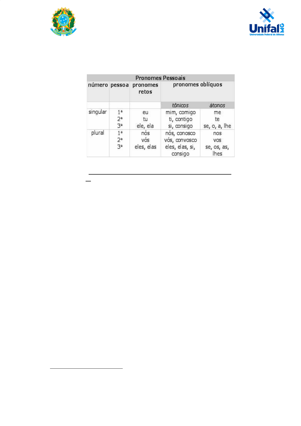 <p>MINISTÉRIO DA EDUCAÇÃO</p><p>Universidade Federal de Alfenas-UNIFAL-MG</p><p>Rua Gabriel Monteiro da Silva, 700. Alfenas/MG</p><p>CEP 37130-000</p><p>Fone: (35) 3299-1000. Fax: (35) 3299-1063</p><p>Minicurso “Pronomes Clíticos” 1</p><p>Tabela Pronomes Pessoais, extraído de</p><p><https://portugues.uol.com.br/gramatica/pronomes-pessoais-obliquos.ht</p><p>ml>. Acesso em 25 set. 2018.</p><p>Pronome: classe gramatical que desempenha na oração as funções equivalentes às</p><p>exercidas pelos elementos nominais. Servem, portanto, para representar um</p><p>substantivo (pronome substantivo) ou para acompanhar um substantivo,</p><p>determinando-lhe a extensão do significado (pronome adjetivo).</p><p>Clítico: Diz-se de ou pronome pessoal de uma só sílaba (como o, me, lo, lhe, se)</p><p>que não tem acentuação própria e que por isso depende do acento da palavra que</p><p>está imediatamente antes ou depois, geralmente um verbo.</p><p>Pronomes pessoais: denotam as três pessoas gramaticais: quem fala (1ª pessoa),</p><p>com quem se fala (2ª pessoa) e de quem se fala (3ª pessoa); podem representar,</p><p>quando na terceira pessoa, uma forma nominal anteriormente expressa; variam de</p><p>forma segundo a função (reto ou oblíquo) e a acentuação (átono ou tônico).</p><p>Formas átonas</p><p>a) objeto direto: o, a, os, as;</p><p>b) objeto indireto: lhe, lhes;</p><p>c) objeto direto e indireto: me, te, nos e vos.</p><p>1 Material didático produzido com base nas gramáticas tradicionais de Cunha & Cintra, Nova</p><p>Gramática do Português Contemporâneo, e de Cegalla, Novíssima Gramática da Língua</p><p>Portuguesa.</p><p>https://portugues.uol.com.br/gramatica/pronomes-pessoais-obliquos.html</p><p>https://portugues.uol.com.br/gramatica/pronomes-pessoais-obliquos.html</p><p>MINISTÉRIO DA EDUCAÇÃO</p><p>Universidade Federal de Alfenas-UNIFAL-MG</p><p>Rua Gabriel Monteiro da Silva, 700. Alfenas/MG</p><p>CEP 37130-000</p><p>Fone: (35) 3299-1000. Fax: (35) 3299-1063</p><p>Objeto direto: é o complemento verbal que não vem acompanhado de uma</p><p>preposição. Tem a função de completar o verbo transitivo, que sozinho não</p><p>consegue fornecer informação com sentido completo.</p><p>Objeto indireto: é o complemento verbal que exige a presença de uma</p><p>preposição. Assim como o objeto direto, tem a função de completar o verbo</p><p>transitivo, que sozinho não consegue fornecer informação com sentido completo.</p><p>Lembrando:</p><p> Preposições</p><p>Tabela de Preposições, extraído de</p><p><https://gramaticaportuguesa.blogs.sapo.pt/5865.html>. Acesso em 25</p><p>set. 2018.</p><p>Emprego dos pronomes átonos</p><p>a) objeto direto;</p><p>b) objeto indireto;</p><p>c) sujeito de infinitivo;</p><p>d) emprego enfático (realce ao objeto direto);</p><p>e) pronome de interesse;</p><p>f) valor possessivo;</p><p>g) complemento de verbos de regência distinta.</p><p>Valores e empregos do pronome se</p><p>a) objeto direto;</p><p>b) objeto indireto;</p><p>c) sujeito de um infinitivo;</p><p>d) pronome apassivador;</p><p>e) símbolo de indeterminação do sujeito;</p><p>f) palavra expletiva;</p><p>MINISTÉRIO DA EDUCAÇÃO</p><p>Universidade Federal de Alfenas-UNIFAL-MG</p><p>Rua Gabriel Monteiro da Silva, 700. Alfenas/MG</p><p>CEP 37130-000</p><p>Fone: (35) 3299-1000. Fax: (35) 3299-1063</p><p>g) parte integrante de certos verbos.</p><p>Colocação pronominal (próclise, mesóclise, ênclise)</p><p>Próclise</p><p>O pronome é colocado antes</p><p>do verbo.</p><p>Mesóclise</p><p>O pronome é colocado no</p><p>meio do verbo.</p><p>Ênclise</p><p>O pronome é colocado</p><p>depois do verbo.</p><p>Uso da Próclise:</p><p>1. Oração Negativa, que contenham palavras como: não, ninguém, nunca.</p><p>Exemplo: Não o quero aqui.</p><p>2. Pronomes relativos, indefinidos e demonstrativos.</p><p>Exemplo: Alguns lhes deram maus conselhos.</p><p>3. Verbos antecedidos por advérbios ou expressões adverbiais, exceto quando</p><p>haja vírgula depois do advérbio, uma vez que dessa forma o advérbio deixa de</p><p>atrair o pronome.</p><p>Exemplo: Talvez a jovem se decida ainda hoje.</p><p>4. Orações exclamativas e orações que exprimem desejo de que algo aconteça.</p><p>Exemplo: Deus nos dê força!</p><p>5. Orações com conjunções subordinativas.</p><p>Exemplo: Embora se sentisse melhor, saiu.</p><p>6. Verbo no gerúndio, junto da preposição em.</p><p>Exemplo: Em se tratando de confusão, ela está presente.</p><p>7. Orações interrogativas:</p><p>Exemplo: Quando te deram a notícia?</p><p>MINISTÉRIO DA EDUCAÇÃO</p><p>Universidade Federal de Alfenas-UNIFAL-MG</p><p>Rua Gabriel Monteiro da Silva, 700. Alfenas/MG</p><p>CEP 37130-000</p><p>Fone: (35) 3299-1000. Fax: (35) 3299-1063</p><p>Uso da mesóclise</p><p>A mesóclise é utilizada apenas com os verbos do futuro do presente ou do futuro</p><p>do pretérito.</p><p>Exemplo: Orgulhar-me-ei dos meus alunos.</p><p>Uso da ênclise</p><p>1. Verbo no imperativo afirmativo.</p><p>Exemplo: Depois de terminar, chamem-nos.</p><p>2. Verbo no infinitivo impessoal.</p><p>Exemplo: O seu maior sonho é casar-se.</p><p>3. Verbo iniciando a oração</p><p>Exemplo: Acordei e surpreendi-me com o café da manhã.</p><p>4. Verbo no gerúndio (sem a preposição “em”).</p><p>Exemplo: Vivo a vida encantando-me com suas surpresas.</p><p>Formas o, lo e no do pronome oblíquo</p><p>1. Quando o pronome oblíquo da 3ª pessoa, que funciona como objeto direto,</p><p>vem antes do verbo, apresenta-se sempre com as formas o, a, os, as.</p><p>2. Quando, porém, está colocado depois do verbo, a sua forma depende da</p><p>terminação do verbo:</p><p>a) Se a forma verbal terminar em vogal ou ditongo oral, empregam-se</p><p>o, a, os, as;</p><p>b) Se a forma verbal terminar em -r, -s, ou -z, suprimem-se estas</p><p>consoantes, e o pronome assume as modalidades lo, la, los, las. O</p><p>mesmo se dá quando ele vem posposto ao designativo eis