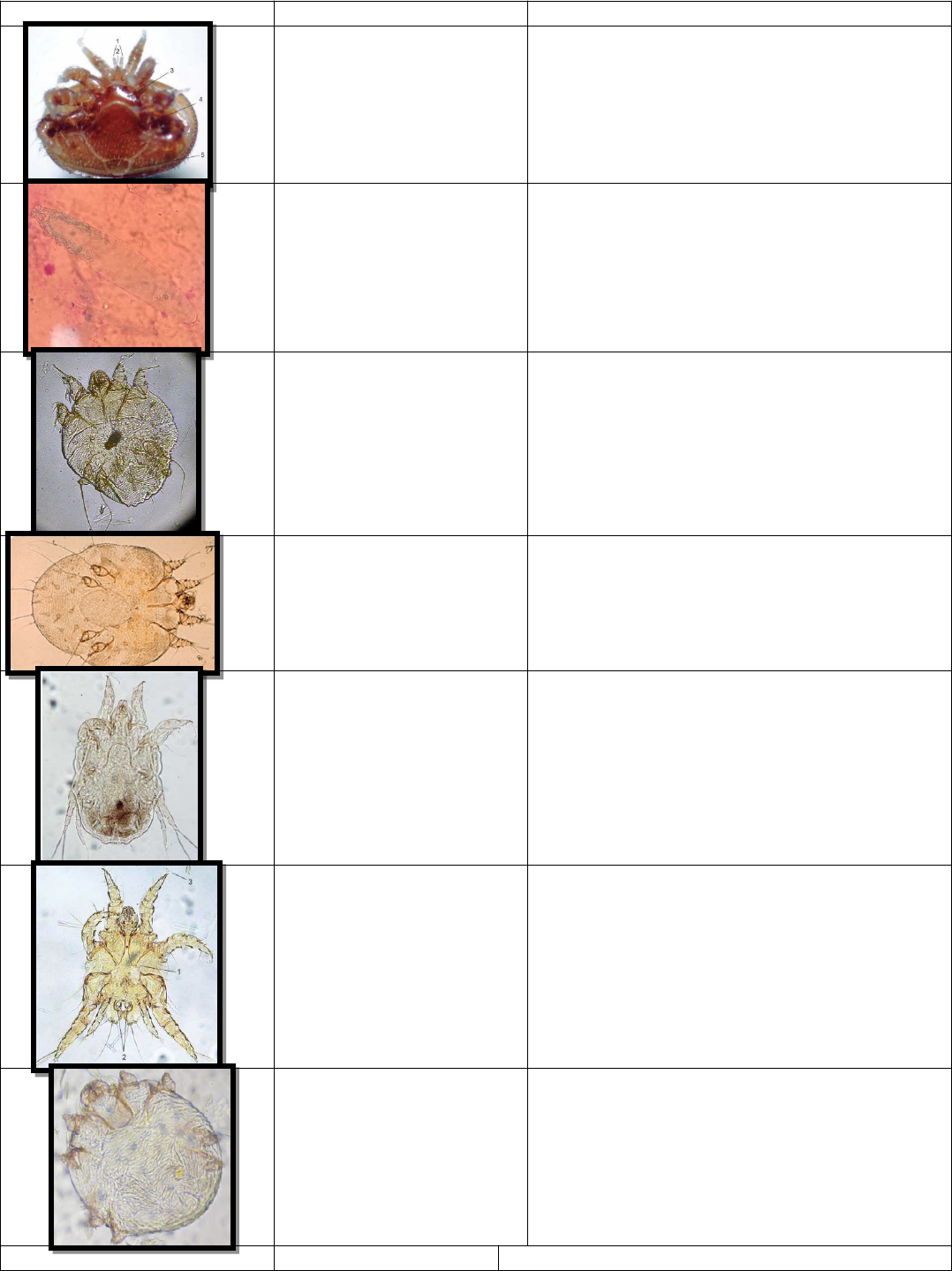 <p>Ácaros</p><p>Nome</p><p>Característica</p><p>- Varroa</p><p>- Escudos desenvolvidos e bastante quitinizados</p><p>- Patas bem desenvolvidas com ventosas</p><p>- Corpo mais largo do que longo</p><p>- Demodex</p><p>- Patas curtas</p><p>- Formato do corpo alongado</p><p>- Sarcoptes</p><p>- Espinhos na face dorsal</p><p>- Ânus terminal</p><p>- Notoedres</p><p>- Face dorsal com aparência de escamas</p><p>- Ânus dorsal</p><p>- sem presença de espinhos</p><p>- Otodectes</p><p>- Pedicelo curto e, no final dele, há uma grande ventosa transparente</p><p>- Corpo ovoide</p><p>- Epímeros convergentes</p><p>- Psoroptes</p><p>- Pedicelo longo e triarticulado</p><p>- Final das patas há um pedicelo e, na ponta dele, uma ventosa.</p><p>- Corpo ovoide</p><p>- Cnemidocoptes sp</p><p>- Corpo circular</p><p>- Patas curtas e truncadas</p><p>- Impressões digitais</p><p>Carrapatos</p><p>Nome</p><p>Características</p><p>- Rhipicephalus sanguineus</p><p>- Bucal hexagonal</p><p>- Presença de festões</p><p>- Placas adanais</p><p>- Rhipicephalus microplus</p><p>- Gnatossoma hexagonal</p><p>- Peritrema circular</p><p>- Não tem festões</p><p>- Dermacentor nitens</p><p>- Estigmas circulares</p><p>- Gnatossoma com rostro e palpos relativamente curtos</p><p>- Apresenta sete festões</p><p>- Amblyomma scuptum</p><p>- Geralmente com escudo ornamentado (de cor diferente do resto do corpo e muitas vezes com desenhos)</p><p>- Festões presentes, placas adanais ausentes no macho e presença de estigmas em forma de vírgula ou triângulo</p><p>- Escudo ornamentadoem formato de estrela</p><p>- Argas sp.</p><p>- Corpo fundido em uma única peça</p><p>- Sem escudo dorsal</p><p>- Quatro pares de patas</p><p>- Gnatossoma ventral</p><p>Pulgas</p><p>Nome</p><p>Característica</p><p>- Ctenocephalides</p><p>-</p><p>- Apresentam ctenídios pronotais e genais</p><p>- Tunga penetrans</p><p>-Palpos labiais com dois segmentos</p><p>- Cabeça com ausência de ctenídeos</p><p>- Fronte em ângulo</p><p>- Cabeça angulosa</p><p>- Pulex irritans.</p><p>-Não apresentam ctenídios genal e pronotal</p><p>- Cerda ocular</p><p>Hemíptera</p><p>Nome</p><p>Características</p><p>- Panstrongylus sp</p><p>- Cabeça curta e robusta</p><p>- Tubérculo antenal inserido bem próximo ao olho</p><p>- Triatoma sp.</p><p>- Tubérculo da antena inserido entre o olho e o aparelho bucal</p><p>- O conexivo (parte dorsal que aasa não cobre) varia de coloração e desenho conformea espécie</p><p>- Rhodnius sp.</p><p>- Coloração castanho-clara</p><p>- Tubérculo antenal bem próximo do rostro</p><p>Piolho</p><p>Mastigador</p><p>Sugador</p><p>- Cabeça mais larga que o tórax</p><p>- cabeça mais estreita que o tórax</p><p>Moscas</p><p>Nome</p><p>Características</p><p>- Oestrus ovis</p><p>- Superfície dorsal arredondada</p><p>- Uma série de faixas escuras transversais</p><p>- Gasterophilus sp</p><p>- Corpo segmentado</p><p>- Coberto por espinhos</p><p>- Dermatobia sp</p><p>- São segmentadas</p><p>- Um par de ganchos orais</p><p>- cochliomyia hominivorax</p><p>- Segmentado</p><p>- linha escurecida até o terceiro segmento</p><p>image7.png</p><p>image8.png</p><p>image9.png</p><p>image10.png</p><p>image11.png</p><p>image12.png</p><p>image13.png</p><p>image14.png</p><p>image15.png</p><p>image16.png</p><p>image17.jpeg</p><p>image18.png</p><p>image19.png</p><p>image20.jpg</p><p>image21.jpeg</p><p>image22.jpg</p><p>image1.png</p><p>image2.png</p><p>image3.jpeg</p><p>image4.png</p><p>image5.png</p><p>image6.png</p>