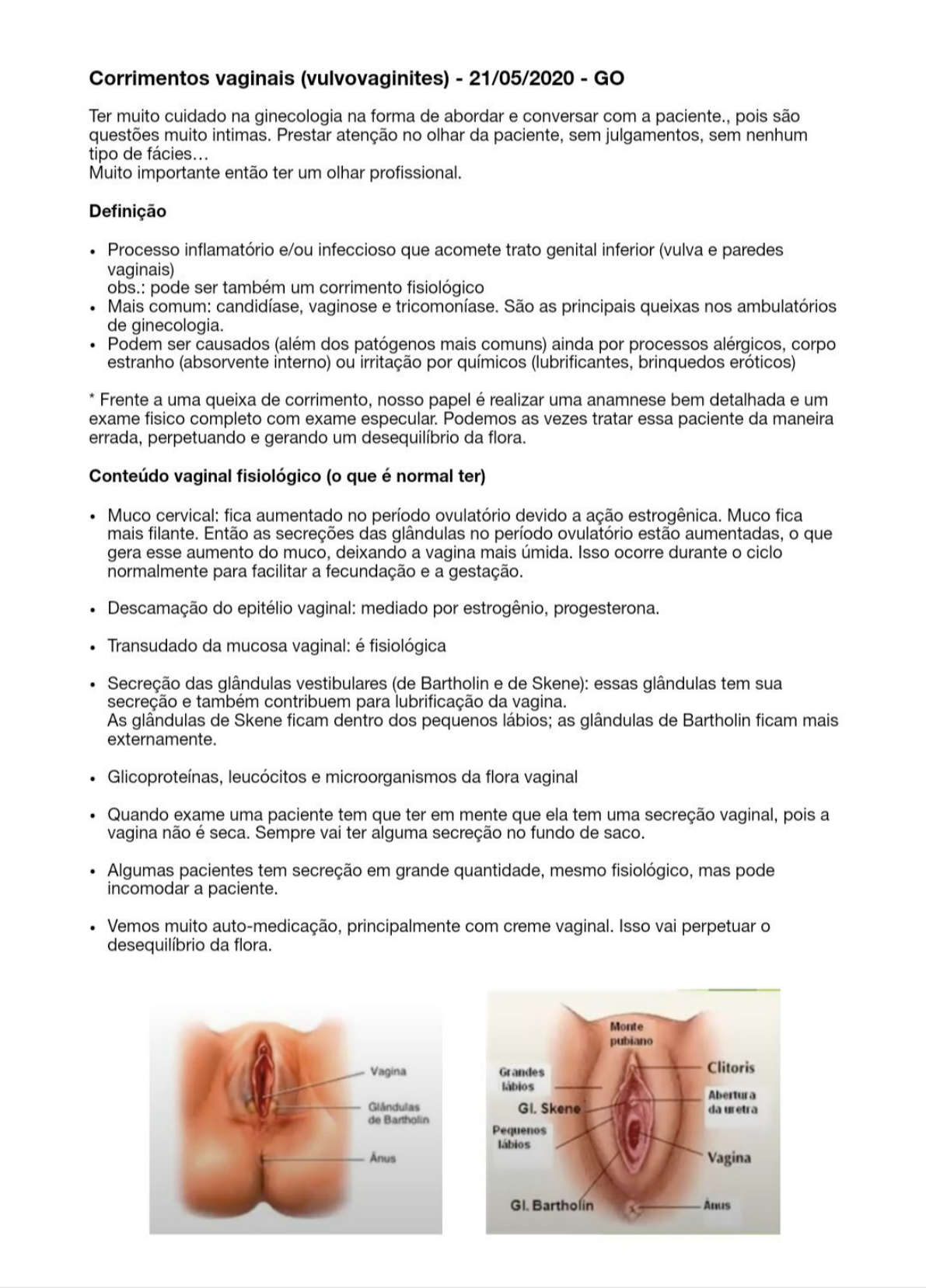 <p>Corrimentos vaginais (vulvovaginites) - 21/05/2020 - GO Ter muito cuidado na ginecologia na forma de abordar e conversar com a paciente., pois são questões muito intimas. Prestar atenção no olhar da paciente, sem julgamentos, sem nenhum tipo de fácies... Muito importante então ter um olhar profissional. Definição Processo inflamatório e/ou infeccioso que acomete trato genital inferior (vulva e paredes vaginais) obs.: pode ser também um corrimento fisiológico Mais comum: candidíase, vaginose e tricomoníase. São as principais queixas nos ambulatórios de ginecologia. Podem ser causados (além dos patógenos mais comuns) ainda por processos alérgicos, corpo estranho (absorvente interno) ou irritação por químicos (lubrificantes, brinquedos eróticos) * Frente a uma queixa de corrimento, nosso papel é realizar uma anamnese bem detalhada e um exame fisico completo com exame especular. Podemos as vezes tratar essa paciente da maneira errada, perpetuando e gerando um desequilíbrio da Conteúdo vaginal fisiológico (o que é normal ter) Muco cervical: fica aumentado no período ovulatório devido a ação estrogênica. Muco fica mais filante. Então as secreções das glândulas no período ovulatório estão aumentadas, o que gera esse aumento do muco, deixando a vagina mais úmida. Isso ocorre durante ciclo normalmente para facilitar a fecundação e a gestação. Descamação do epitélio vaginal: mediado por estrogênio, progesterona. Transudado da mucosa vaginal: é fisiológica Secreção das glândulas vestibulares (de Bartholin e de Skene): essas glândulas tem sua secreção e também contribuem para lubrificação da vagina. As glândulas de Skene ficam dentro dos pequenos lábios; as glândulas de Bartholin ficam mais externamente. Glicoproteínas, leucócitos e microorganismos da flora vaginal Quando exame uma paciente tem que ter em mente que ela tem uma secreção vaginal, pois a vagina não é seca. Sempre vai ter alguma secreção no fundo de saco. Algumas pacientes tem secreção em grande quantidade, mesmo fisiológico, mas pode incomodar a paciente. Vemos muito auto-medicação, principalmente com creme vaginal. Isso vai perpetuar o desequilíbrio da flora. Monte pubiano Vagina Grandes Clitoris lábios Abertura GI. Skene da uretra de Bartholin Pequenos lábios Vagina GI. Bartholin Anus</p><p>Microorganismo da flora vaginal (são comuns de serem encontrados) Aeróbios: mantém o pH da vagina ácido. Lactobacillus (Doderlain, 90% da composição da flora, pH ácido), Staphylococcus, Epedermidis, streptococcus sp, Escherichia coli. Quando temos um desequilíbrio da flora, esses microorganismos podem aumentar e causar uma infecção, podendo mudar o pH da vagina. Anaeróbios facultativos: Gardenerella vaginalis. Causa infecção (vaginose). Não é uma IST, pois já temos essas bactérias no nosso organismo, em pouca quantidade (clue cells - células sinalizadoras/indicadoras). Ficam grudada nas células epiteliais formando as células indicadoras (vai falar melhor sobre isso depois). aumento de gardnerella que leva a vaginose. Anaeróbios obrigatórios: bacteróides, peptostreptococcus, ureaplasma, urealyticum, mycoplasma hominis. Fungos: Candida (G+, TGI e reprodutor feminino, torna-se patogênico em condições especificas). A cândida é um fungo da nossa flora. Em algumas situações especificas (uso de medicamentos, imunocomprometidos), ou em qualquer situação que possa causar desequilíbrio na flora pode-se ter um aumento de cândida causando manifestação clinica de infecção por candida. Obs.: achar em uma lamina de preventivo uma cândida ou gardnerella não quer dizer que é quadro patológico. Características do conteúdo vaginal fisiológico: Pra saber se é patológico tem que saber o que é fisiológico Coloração clara (branca ou transparente) Ausencia de odor Ph ácido (4,0 a 4,5): lactobacillus deixam o pH ácido. Mais abundante no período peri-ovulatório, gestação ou quando há excitação sexual (ação hormonal) Presente normalmente no fórnice vaginal (anterior e posterior) Pode ocorrer nas recém nascidas devido à ação hormonal placentária (hormônio da mãe passa pela placenta pro bebê) logo nos primeiros dias pós nascimento (não é tão comum). Isso é fisiológico e passa assim que os hormônios são depurados. Devido a essa mesma ação hormonal pode acontecer de o bebê ter broto mamário. Mecanismo de defesa do trato genital: barreiras para evitar que tenhamos infecção Imunidade natural: integridade da pele e mucosa, muco cervical, lactobacilos (deixam o ph ácido... a maioria dos patógenos aumentam replicação em ambiente mais alcalino). Se você tem lesões por exemplo, ter a perda de continuidade da pele, fissuras... aumenta muito o risco de entrada de microorganismos. Imunidade celular T e B) Imunidade humoral (imunoglobulinas, IgA, e secretadas pelo muco e parede vaginal) *Quando tem qualquer quebra de qualquer um desses mecanismos de defesa temos o aumento de chance de ter infecção (IST ou desequilíbrio da própria flora) **Qualquer alteração da flora vaginal ou dos mecanismos de defesa pode ser responsável por corrimentos (patológicos).</p><p>Vários exemplos de como podemos ter a quebra do mecanismo de defesa da mucosa vaginal/ trato genital: Flora nativa Quebra na entra em interação dos Alteração da contato com componentes imunidade do superfície da flora diferente do Hospedeiro habitual Antibiótico sistêmico Pós-cirurgia: Reações alérgicas ou local. episiorrafia, Supressão funcional histerectomia. Distúrbios químicos: das células T (drogas Microfissuras água clorada, duchas imunossupressoras, (absorventes internos, vaginais, doenças, caquexia) relação sexual). espermicidas. Supressão Cervicites. Alteração de pH temporária das Maceração da pele por sangue menstrual, células T: gravidez. uso de roupas justas sêmen. ou sintéticas. > Quebra na interação dos componente