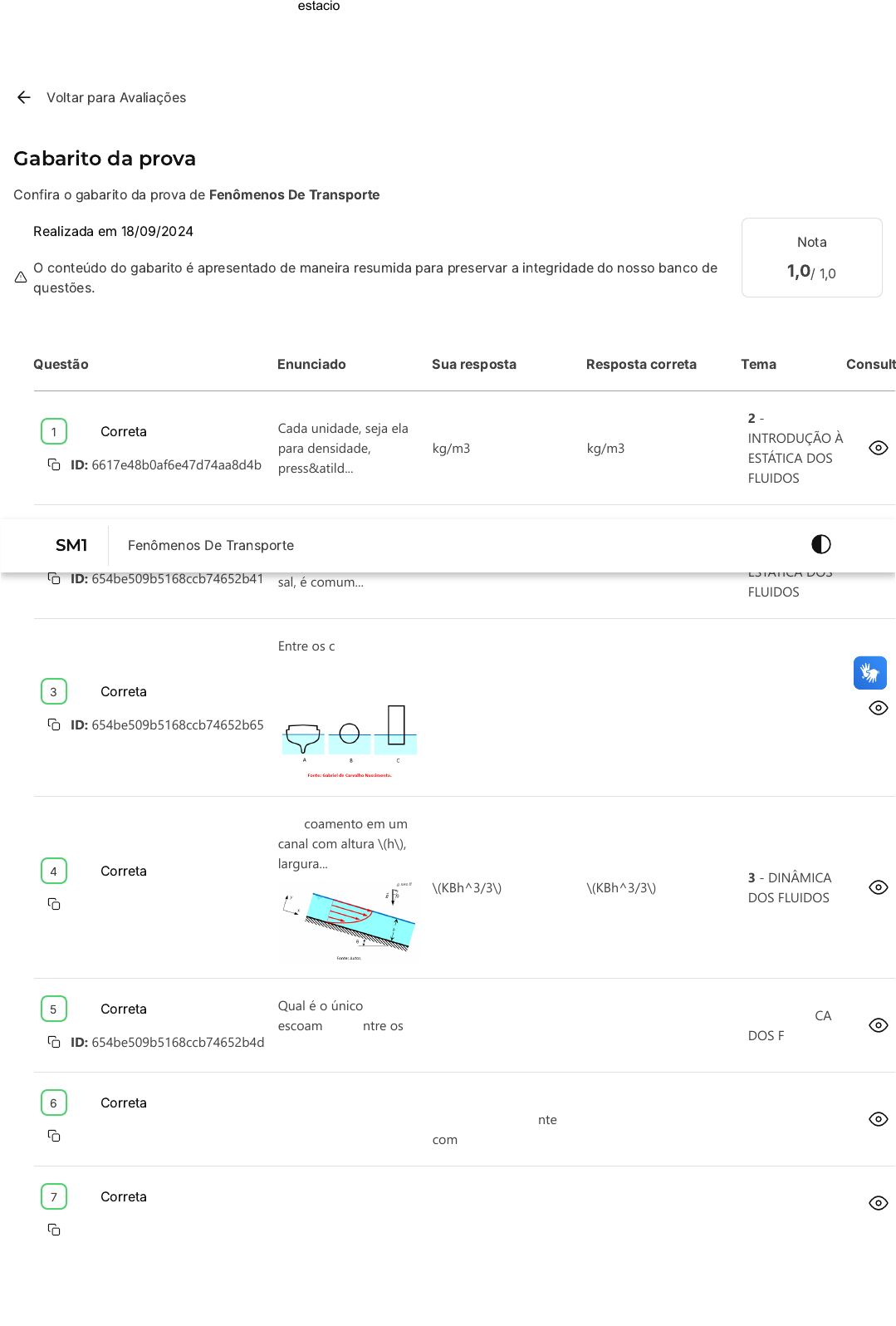 <p>Voltar para Avaliações</p><p>Gabarito da prova</p><p>Confira o gabarito da prova de Fenômenos De Transporte</p><p>Realizada em 18/09/2024</p><p>O conteúdo do gabarito é apresentado de maneira resumida para preservar a integridade do nosso banco de</p><p>questões.</p><p>Nota</p><p>1,0/ 1,0</p><p>Questão Enunciado Sua resposta Resposta correta Tema Consult</p><p>Correta</p><p>ID: 6617e48b0af6e47d74aa8d4b</p><p>Cada unidade, seja ela</p><p>para densidade,</p><p>press&atild...</p><p>kg/m3 kg/m3</p><p>2 -</p><p>INTRODUÇÃO À</p><p>ESTÁTICA DOS</p><p>FLUIDOS</p><p>Correta</p><p>ID: 654be509b5168ccb74652b41</p><p>Na produção de</p><p>petróleo obtido do pré-</p><p>sal, é comum...</p><p>\(20,21 MPa\) \(20,21 MPa\)</p><p>2 -</p><p>INTRODUÇÃO À</p><p>ESTÁTICA DOS</p><p>FLUIDOS</p><p>Correta</p><p>ID: 654be509b5168ccb74652b65</p><p>Entre os corpos da</p><p>Figura a seguir, qual</p><p>correspon...</p><p>A, C e B A, C e B</p><p>2 -</p><p>INTRODUÇÃO À</p><p>ESTÁTICA DOS</p><p>FLUIDOS</p><p>Correta</p><p>ID: 654be509b5168ccb74652b7d</p><p>O escoamento em um</p><p>canal com altura \(h\),</p><p>largura...</p><p>\(KBh^3/3\) \(KBh^3/3\)</p><p>3 - DINÂMICA</p><p>DOS FLUIDOS</p><p>Correta</p><p>ID: 654be509b5168ccb74652b4d</p><p>Qual é o único</p><p>escoamento, entre os</p><p>listados abaix...</p><p>Escoamento provocado</p><p>pela bola de futebol em</p><p>um ch...</p><p>Escoamento provocado</p><p>pela bola de futebol em</p><p>um ch...</p><p>3 - DINÂMICA</p><p>DOS FLUIDOS</p><p>Correta</p><p>ID: 654be509b5168ccb74652b47</p><p>Qual é o único</p><p>escoamento, entre os</p><p>listados abaix...</p><p>Escoamento que ocorre</p><p>ao beber refrigerante</p><p>com ca...</p><p>Escoamento que ocorre</p><p>ao beber refrigerante</p><p>com ca...</p><p>3 - DINÂMICA</p><p>DOS FLUIDOS</p><p>Correta</p><p>ID: 654be509b5168ccb74652cf7</p><p>(CESGRANRIO -</p><p>PETROBRAS -</p><p>Engenheiro de</p><p>Equipament...</p><p>600 600 4 -</p><p>TRANSFERÊNCIA</p><p>DE CALOR</p><p>1</p><p>2</p><p>3</p><p>4</p><p>5</p><p>6</p><p>7</p><p>SM1 Fenômenos De Transporte</p><p>22/09/2024, 20:17 estacio.saladeavaliacoes.com.br/prova/66eb6e766cf2cb9e1efe05b4/gabarito/</p><p>https://estacio.saladeavaliacoes.com.br/prova/66eb6e766cf2cb9e1efe05b4/gabarito/ 1/2</p><p>https://estacio.saladeavaliacoes.com.br/avaliacoes/</p><p>Correta</p><p>ID: 654be509b5168ccb74652ca3</p><p>Qual a quantidade</p><p>máxima de calor</p><p>retirado de um a...</p><p>305.000 kJ 305.000 kJ</p><p>4 -</p><p>TRANSFERÊNCIA</p><p>DE CALOR</p><p>Correta</p><p>ID: 654be509b5168ccb74652c61</p><p>Num ambiente com ar</p><p>seco, é colocada água</p><p>no inter...</p><p>25 segundos 25 segundos</p><p>5 -</p><p>TRANSFERÊNCIA</p><p>DE MASSA</p><p>Correta</p><p>ID: 654be509b5168ccb74652c5b</p><p>800 g de sulfato de</p><p>alumínio, Al2(SO4)3,</p><p>são despe...</p><p>2,1.10-6 2,1.10-6</p><p>5 -</p><p>TRANSFERÊNCIA</p><p>DE MASSA</p><p>8</p><p>9</p><p>10</p><p>Encontrou algum problema?</p><p>Você pode copiar o ID da questão, acessar o Campus Virtual �SIA) e abrir um requerimento.</p><p>22/09/2024, 20:17 estacio.saladeavaliacoes.com.br/prova/66eb6e766cf2cb9e1efe05b4/gabarito/</p><p>https://estacio.saladeavaliacoes.com.br/prova/66eb6e766cf2cb9e1efe05b4/gabarito/ 2/2</p>