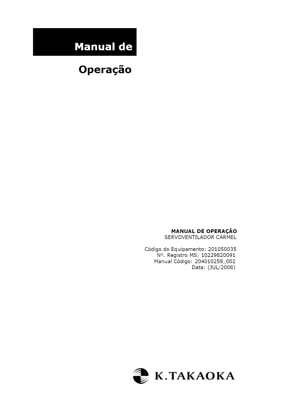 <p>Manual de Operação MANUAL DE OPERAÇÃO SERVOVENTILADOR CARMEL Código do Equipamento: 201050035 Registro MS: 10229820091 Manual Código: 204010259 002 Data: (JUL/2006) K.TAKAOKA</p><p>presente manual de Operação contém as informações necessárias para a correta utilização do Servoventilador Fabricante: Takaoka Indústria e Comércio LTDA Av. Bosque da Saúde, 519 São Paulo - SP CEP: 04142-091 Tel: Fax: Web site: www.takaoka.com.br e-mail: kt@takaoka.com.br CGC: I.E.: 103.735.350.115 Sugestões, dúvidas ou reclamações : Call (11) 5586 1010 Registro do Produto no Ministério da Saúde: Nome Comercial: Servoventilador CARMEL Número do Registro no Ministério da 10229820091 Classificação do Produto: NBR IEC-60601-1/97 (1994) & Errata 1 (1997) & Emenda 1 (1997) - (Equipamento eletromédico - Parte 1: Prescrições Gerais para Segurança) NBR IEC 60601-2-12/2004 (prescrições particulares para segurança de equipamento para ventilação pulmonar em utilização médica Equipamento Classe 1 - Energizado Internamente) NBR IEC 60601-1-2/1997 (Equipamento Eletromédico - Parte 1: Prescrições gerais para segurança - 2. Norma Colateral: Compatibilidade eletromagnética - Prescrições e ensaios) Equipamento Classe 1 - Energizado Internamente Tipo B - - Operação contínua Responsável Técnico: Eng. Mauricio Chiarioni CREA: Registro 5061714921 Código do manual: 204010259_002 3</p><p>Código do manual: 204010259_002 4</p><p>K.TAKAOKA Formulário de Instalação do Produto EQUIPAMENTO: Código: Número de Série: DESCRIÇÃO DE SERIE 1 2 3 4 5 6 7 8 9 10 NOTA FISCAL: Original K.Takaoka [ SIM NÃO Número Nota* Nome Representação INSTITUIÇÃO: Razão Social: C.N.P.J*.: Endereço: Cidade: Estado: CEP: Responsável pelas Informações*: Cargo: Setor: e-mail: (*) Campos Obrigatórios SUA OPINIÃO: 1. A entrega do(s) produto(s) foi feita com pontualidade em relação ao prazo acordado? Sim não 2. O(s) produto(s) e o(s) componente(s) estava(m) de acordo com o pedido? Sim Não 3. A embalagem estava de alguma forma danificada? Sim Não 4. Houve alguma dificuldade na instalação do equipamento? Sim Não 5. O(s) equipamento(s) e componentes está(ão) funcionando de acordo? Sim Não 6. Houve problemas de conexão de componentes, tubos e cabos? Sim Não 7. A nota fiscal está com os seus dados, valores, descrição do produto, quantidade e condição Sim Não de pagamento, corretos? 8. Comente eventual inconveniente ocorrido: Instalação realizada por: Data / / Ass.: (Nome do Técnico) Representação: Data / / Ass: Envie este formulário para o Fax (11) 5589 8072 ou por carta registrada para a K Takaoka ATENÇÃO: A VALIDADE DA GARANTIA TERÁ VIGÊNCIA MEDIANTE A CONFIRMAÇÃO DAS INFORMAÇÕES CONSTANTES NESTE TERMO. ESTE TERMO DEVERÁ SER ENVIADO NUM PRAZO MÁXIMO DE 30 DIAS, CONFORME CONSTA NO MANUAL DE OPERAÇÕES Em caso de dúvida ou para maiores informações contate: SAC (11) 5586 1010 Código do 204010259_002 5</p><p>Código do 204010259_002 6</p><p>ÍNDICE DEFINIÇÕES 10 A EMPRESA 11 1 AVISOS IMPORTANTES 13 2 DESCRIÇÃO GERAL 17 2.1 Monitor de Ventilação 19 3 ESPECIFICAÇÕES TÉCNICAS 20 3.1 Especificações do Monitor de Ventilação 23 4 PRINCÍPIO DE FUNCIONAMENTO 25 4.1 Servo-válvulas de fluxo 25 4.2 Misturador Eletrônico 26 4.3 Válvula eletromagnética 26 4.4 Medição de fluxo e volume 27 4.5 Medição de Oxigênio 27 5 CONTROLES E COMPONENTES 28 5.1 Relação de Componentes 28 5.2 Itens Opcionais 29 5.3 Vista Frontal 30 5.3.1 Monitor LCD 31 5.3.2 Painel de controle 31 5.4 TOUCH 31 5.5 Painel Frontal de Conexões 31 5.6 Vista 33 5.7 Umidificador Aquecido 35 5.8 Válvula Expiratória 36 5.9 Drenos 37 5.10 Nebulizador (opcional) 37 5.11 TGI - Insuflação de Gás Traqueal 38 5.12 Bateria 39 5.13 Base Móvel 39 6 MONTAGEM E PREPARAÇÃO DO CARMEL 40 6.1 Montagem do CARMEL 40 6.2 Alimentação 41 6.3 Circuito Respiratório 42 6.4 Sensor de Fluxo 44 6.5 Célula/sensor de O2 45 6.5.1 Calibração antes do uso do sensor de O2 46 6.5.2 Após a calibração do sensor de O2 46 7 PAINEL DE CONTROLES 48 7.1 Painel de Controle 48 8 Configuração dos Parâmetros Ventilatórios 50 Código do manual: 204010259_002 7</p><p>8.1 Tela de auto teste 50 8.2 Telas de Inicialização 50 8.3 Tela Principal 54 8.4 Mensagens 54 8.5 Funções de monitorização 56 8.6 Janela Gráfica 56 8.7 Tela de tendência (Gráfica) 57 8.8 Banco de dados 58 9 OPERAÇÃO 60 9.1 Procedimentos e testes iniciais 60 9.2 Ajuste de parâmetros ventilatórios 61 10 SISTEMA DE ALARMES 66 10.1 Níveis de Prioridade dos Alarmes 66 11 MODALIDADES DE 70 11.1 Ciclos Mandatórios e Espontâneos 70 11.2 Seleção da Modalidades de Ventilação 71 11.3 VCV - ventilação controlada a volume 71 11.4 PCV - ventilação controlada a pressão 72 11.5 PLV - ventilação limitada a pressão 73 11.6 - ventilação de volume assegurado por controle de pressão 74 11.6.1 de Inicialização - 75 11.7 SIMV/V ventilação mandatória intermitente sincronizada com controle de volume 75 11.8 SIMV/P® - ventilação mandatória intermitente sincronizada com controle de pressão 76 11.9 BIPV® - ventilação espontânea com dois níveis de pressão 77 11.10 CPAP - ventilação com pressão positiva contínua nas vias aéreas 78 11.11 PSV - ventilação com pressão de suporte 78 12 FUNÇÕES ESPECIAIS 80 12.1 Pausa Inspiratória e Pausa Expiratória 80 12.2 Medição de Auto-PEEP 80 12.3 100% de Oxigênio 80 12.4 Suspiro 80 12.5 Medição do Índice de Tobin (iT) 80 12.6 Medição da P0.1 Pressão de Oclusão das Vias Aéreas 80 13 LIMPEZA E ESTERILIZAÇÃO 81 14 MANUTENÇÃO 86 14.1 Bateria interna recarregável 87 14.2 Troca de Fusíveis 87 14.2.1 Instruções para a troca do fusível (embutido na tomada) 87 14.2.2 Instruções para a troca do fusível (individual) 87 15 TROUBLESHOOTING 88 15.1 Mensagem no Display 88 15.2 Ocorrências 89 16 METODOS DE MEDIÇÃO 90 Código do manual: 204010259_002 8</p><p>16.1 Volumes 90 16.2 