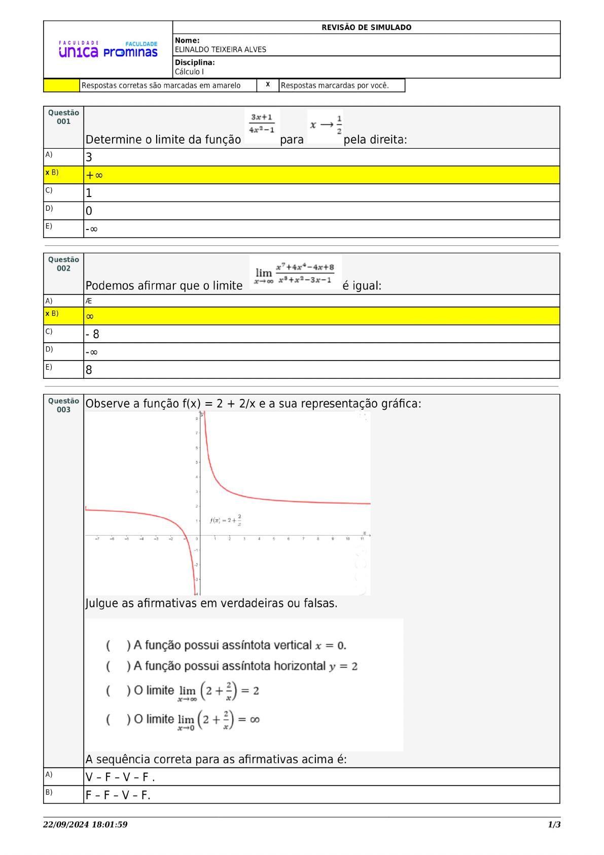 <p>REVISÃO DE SIMULADO FACULDADE Nome: FACULDADE unica prominas ELINALDO TEIXEIRA ALVES Disciplina: Cálculo Respostas corretas são marcadas em amarelo X Respostas marcardas por você. Questão 3x+1 001 1 4x2-1 2 Determine o limite da função para pela direita: A) 3 x B) + 8 C) 1 D) 0 E) -00 Questão 002 lim x-00 Podemos afirmar que o limite é igual: A) AE x B) 8 C) D) E) 8 Questão 003 Observe a função f(x) = 2 + 2/x e a sua representação gráfica: tv 8 5 4 3 2 1 0 8 Julgue as afirmativas em verdadeiras ou falsas. ( ) A função possui vertical ( ) A função possui horizontal y = 2 ( ) limite lim = ( A sequência correta para as afirmativas acima é: A) B) 22/09/2024 18:01:59 1/3</p><p>C) D) x E) Questão 004 3x+5 lim x-4 O valor do limite A) -00 B) AE C) D) 3 E) 8 Questão 005 f(x) = 2x+2 As afirmações abaixo são sobre a função e sua representação gráfica. 7 6 5 4 3 2 1 x -6 -5 -4 -3 -2 -1 1 2 3 4 5 6 7 -1 -2 I. A função possui uma vertical em 1. II. limite lim = 2x+2 III. limite lim = - 1 2x+2 x A) Apenas a afirmativa I está correta. B) Todas as afirmativas estão erradas. C) Apenas a afirmativa III está correta. D) Todas as afirmativas estão corretas E) Apenas a afirmativa está correta. 22/09/2024 18:01:59 2/3</p><p>Questão 006 lim Determine o limite A) 1/2 B) -1/2 0 D) 1 E) -2 Questão A função f(x) = 1-1/x, possui assíntota vertical igual a: 007 A) X = -2 B) X C) D) x E) X = 1 Questão 008 lim 2x+1 x+3 Analise o limite e determine seu valor. A) 2 x B) -2 C) + 8 D) 0 E) -00 22/09/2024 18:01:59 3/3</p>