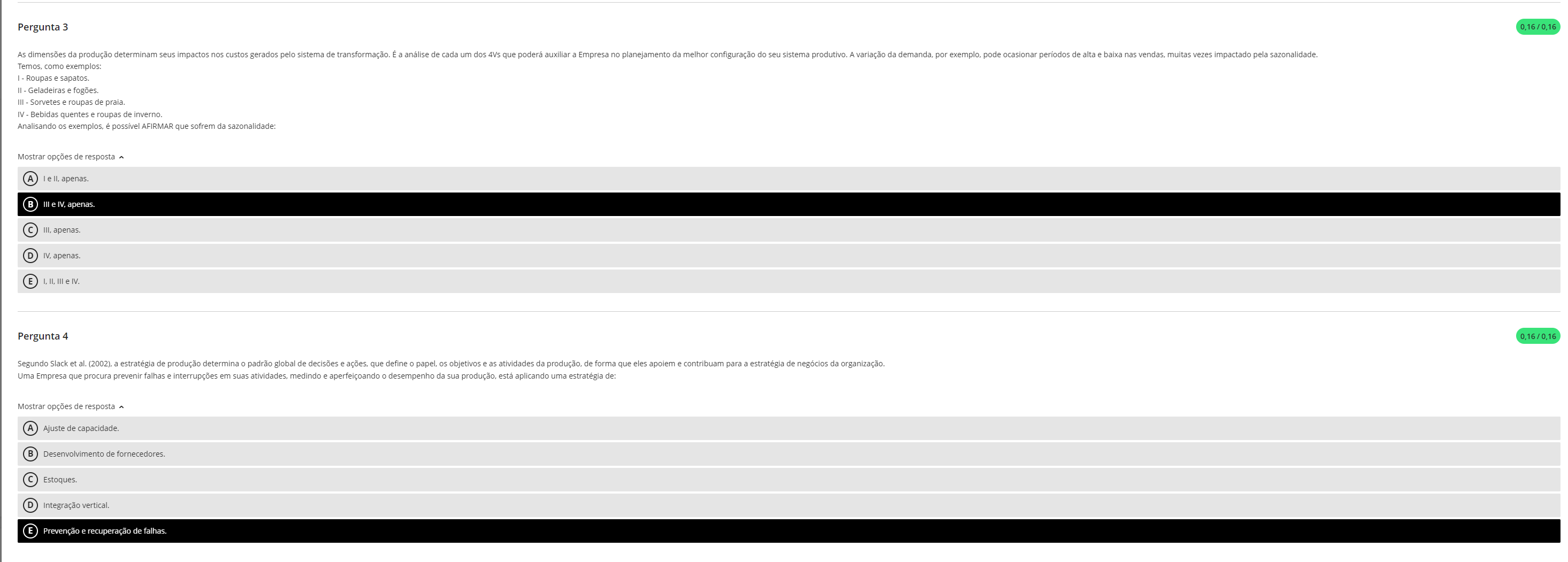 <p>Pergunta 3 As dimensões da produção determinam seus impactos nos custos gerados pelo sistema de transformação. análise de cada um dos 4Vs que poderá auxiliar Empresa no planejamento da melhor configuração do seu sistema produtivo A variação da por exemplo, pode ocasionar períodos de alta baixa nas muitas vezes impactado pela como exemplos: Roupas sapatos. Geladeiras III Sorvetes roupas de praia. IV Bebidas quentes roupas de inverno. Analisando os exemplos, possível AFIRMAR que sofrem da sazonalidade: Mostrar opções de resposta ^ le II, apenas. B apenas. III, apenas. D IV, apenas. E Pergunta 4 0,16/0,16 Segundo Slack et al. (2002) estratégia de produção determina padrão global de decisões ações, que define os objetivos as atividades da produção, de forma que eles apoiem contribuam para estratégia de negócios da organização. Uma Empresa que procura prevenir falhas interrupções em suas medindo e aperfeiçoando desempenho da sua está aplicando uma estratégia de: Mostrar opções de resposta ^ A Ajuste de capacidade. B Desenvolvimento de fornecedores. C D Integração E Prevenção recuperação de falhas.</p>