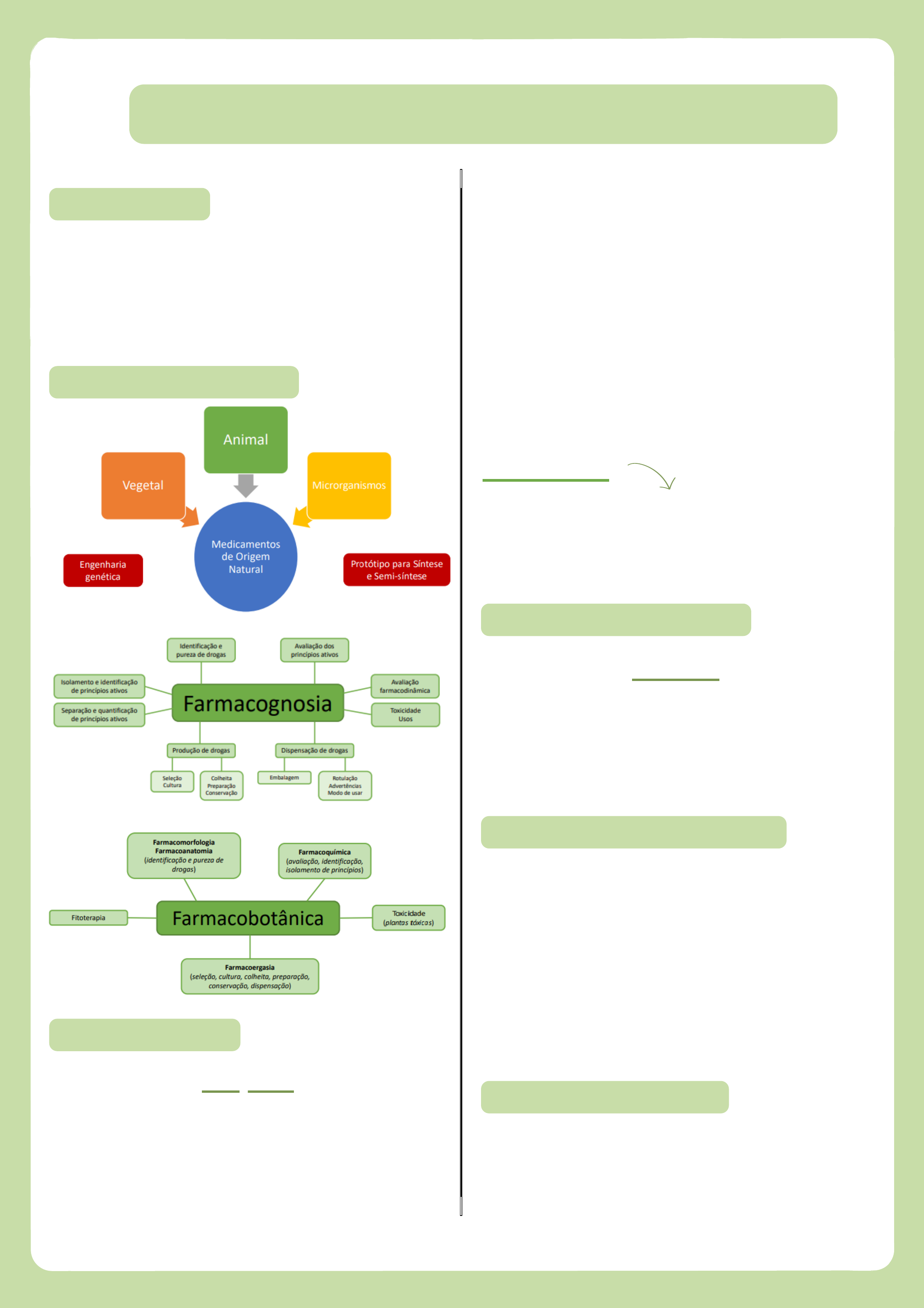<p>INTRODUÇÃO A FARMACOGNOSIA</p><p>Botânica - Etnofarmacologia - Controle de</p><p>qualidade - Biologia marinha - Microbiologia -</p><p>Fitoquímica - Fitoterapia - Farmacologia -</p><p>Farmácia Clínica - Agronomia - Química medicinal</p><p>- Farmacotécnica</p><p>INTRODUÇÃO</p><p>PRODUTOS NATURAIS</p><p>ORIGEM ANIMAL</p><p>> Origem grega</p><p>• Pro: em favor</p><p>• Polis: cidade</p><p>> Substância que as abelhas produzem a partir da</p><p>coleta de resina de plantas próximas de suas</p><p>colmeias</p><p>Própolis</p><p>> Composição</p><p>• 50 a 55% de resinas e bálsamos</p><p>• 30 a 40% de cera</p><p>• 5 a 10% de óleos voláteis</p><p>• 5% de pólen</p><p>• 5% de diversos materiais (orgânicos e minerais)</p><p>> Brasil</p><p>• Própolis verde</p><p>• Baccharis dracunculifolia (alecrim do campo)</p><p>Flavonoides, Ácidos aromáticos, Aminoácidos,</p><p>Terpenos, Minerais e Vitaminas</p><p>Cicatrizante - Antifúngico - Leishimanicida -</p><p>Antiviral - Hepatoprotetor - Imunoestimulante -</p><p>Antioxidante - Anti-inflamatório - Antimicrobiano -</p><p>Antitumoral</p><p>Atua como:</p><p>Insulina</p><p>ENGENHARIA GENÉTICA</p><p>> Década de 80 – insulina humana produzida por</p><p>DNA recombinante</p><p>> Gene humano - Escherichia coli - Insulina - Uso</p><p>Protótipo para semi-síntese</p><p>> Nome popular: vinca de gato, boa noite</p><p>• Vinca de Madagascar</p><p>> Catharantus roseus</p><p>> Vincristina a partir da vimblastina</p><p>• oxidação crómica controlada</p><p>•via microbiológica (N-dimetilação por</p><p>Streptomyces albogriseolus</p><p>Protótipo para síntese</p><p>• Nome popular: papoula</p><p>• Papaver somniferum</p><p>• Ópio: 10% de morfina e 2% de codeína</p><p>Antitumoral</p><p>Analgésico</p><p>INTRODUÇÃO A FARMACOGNOSIA</p><p>PRODUTOS NATURAIS - ORIGEM</p><p>VEGETAL</p><p>DESENVOLVIMENTO DE MEDICAMENTOS</p><p>Folha de Ginkgo biloba - Droga vegetal -</p><p>Derivado vegetal - Fitoterápico -</p><p>Ginkgolídeo B</p><p>CONCEITOS</p><p>Terapêutica caracterizada pelo uso de plantas</p><p>medicinais em suas diferentes formas</p><p>farmacêuticas, sem a utilização de substância</p><p>ativas isoladas, ainda que de origem vegetal.</p><p>FITOTERAPIA</p><p>PLANTA MEDICINAL</p><p>Qualquer espécie vegetal, cultivada ou não,</p><p>utilizada com propósitos terapêuticos.</p><p>PLANTA MEDICINAL FRESCA</p><p>Refere-se à planta medicinal usada logo após a</p><p>colheita/coleta sem passar por qualquer processo</p><p>de secagem</p><p>EXEMPLO: Foeniculum vulgare Funcho</p><p>DROGA VEGETAL</p><p>Planta medicinal, ou suas partes, que contenham</p><p>as substâncias responsáveis pela ação terapêutica,</p><p>após processos de coleta/colheita, estabilização,</p><p>quando aplicável, e secagem, podendo estar na</p><p>forma íntegra, rasurada, triturada ou pulverizada.</p><p>DERIVADO VEGETAL</p><p>Produto da extração da planta medicinal fresca ou</p><p>da droga vegetal, que contenha as substâncias</p><p>responsáveis pela ação terapêutica, podendo</p><p>ocorrer na forma de extrato, óleo fixo e volátil, cera,</p><p>exsudato e outros</p><p>MEDICAMENTO FITOTERÁPICO</p><p>Produto obtido de matéria-prima ativa vegetal,</p><p>exceto substâncias isoladas, com finalidade</p><p>profilática, curativa ou paliativa, incluindo</p><p>medicamento fitoterápico e produto tradicional</p><p>fitoterápico, podendo ser simples, quando o ativo é</p><p>proveniente de uma única espécie vegetal</p><p>medicinal, ou composto, quando o ativo é</p><p>proveniente de mais de uma espécie vegetal.</p><p>É caracterizado pelo conhecimento da eficácia e</p><p>dos riscos de seu uso, assim como pela</p><p>reprodutibilidade e constância de sua qualidade.</p><p>Aspectos tecnológicos, controle de</p><p>qualidade, segurança e eficácia do produto.</p><p>MEDICAMENTO TRADICIONAL F.</p><p>Não há exigência em relação à realização dos</p><p>ensaios pré-clínicos e clínicos, no entanto a</p><p>segurança e efetividade são alicerçadas no longo</p><p>histórico de utilização demonstrado em</p><p>documentação técnico�científica, sem evidências</p><p>conhecidas ou informadas de risco à saúde do</p><p>usuário e que seja caracterizado pela constância</p><p>de sua qualidade.</p><p>POR QUE AS PLANTAS PRODUZEM PRINCÍPIOS</p><p>ATIVOS?</p><p>INTRODUÇÃO A FARMACOGNOSIA</p><p>FITOCOMPLEXO</p><p>Conjunto de todas as substâncias, originadas</p><p>do metabolismo primário ou secundário,</p><p>responsáveis, em conjunto, pelos efeitos</p><p>biológicos de uma planta medicinal ou de seus</p><p>derivados.</p><p>FITOFÁRMACO</p><p>Medicamentos da biodiversidade de origem</p><p>vegeta, são substâncias purificadas e isoladas</p><p>a partir de matéria-prima vegetal com estrutura</p><p>química definida e atividade farmacológica.</p><p>Utilizados como ativos em medicamentos com</p><p>propriedade profilática, paliativa ou curativa.</p><p>PRINCÍPIO ATIVO (P.A)</p><p>Substância ou classe química, quimicamente</p><p>caracterizada com propriedade farmacológicas</p><p>determinadas</p><p>> Competição entre plantas</p><p>> Sinalizadores químicos que permitem a</p><p>planta responder a estímulos ambientais</p><p>> Defesa contra herbívoros e patógenos</p><p>> Proteção contra radiação solar e estresse</p><p>oxidativo</p><p>MARCADOR</p><p>Substância ou classe de substâncias (ex.:</p><p>alcaloides, flavonoides, ácidos graxos, etc.)</p><p>utilizada como referência no controle da</p><p>qualidade da matéria-prima vegetal e do</p><p>fitoterápico, preferencialmente tendo correlação</p><p>com o efeito terapêutico.</p><p>> O marcador pode ser do tipo ativo, quando</p><p>relacionado com a atividade terapêutica.</p><p>> Ou analítico, quando não demonstrada, até o</p><p>momento, sua relação com a atividade</p><p>terapêutica do fitocomplexo.</p><p>Epífitas, parasitas, possuem papel ecológico e</p><p>fazem o monitoramento am