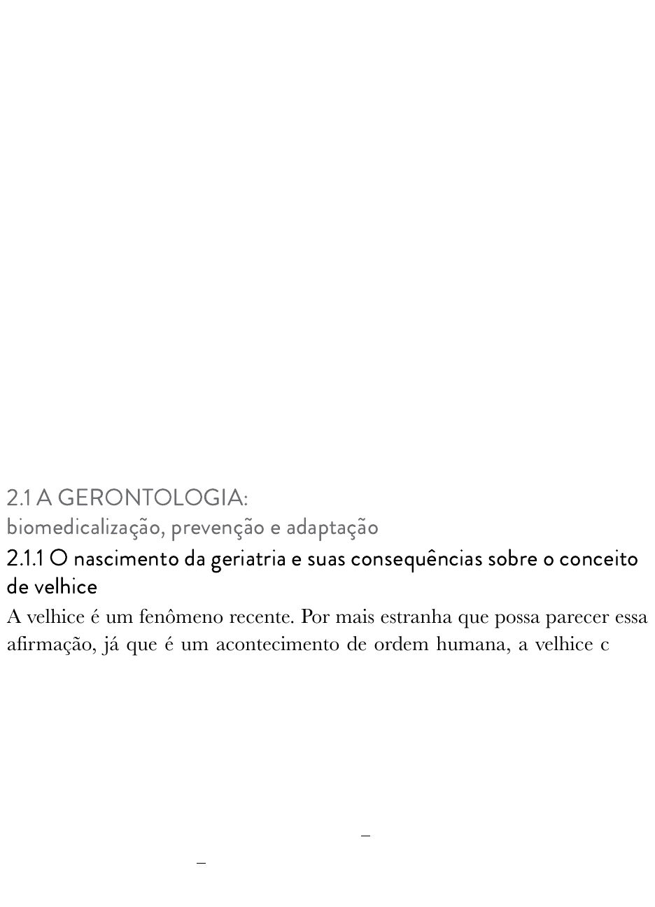 <p>2</p><p>O CONCEITO DE VELHICE:</p><p>da gerontologia à psicanálise</p><p>São muitos os olhares que se pode dedicar à velhice. Cada um deles, antes</p><p>de ser apenas escolhas de diversos discursos sobre a velhice, é determinante</p><p>do próprio objeto de estudo, e, ao definir posições particulares, constitui</p><p>delineamentos éticos, políticos e metodológicos que produzem intervenções</p><p>clínicas e efeitos terapêuticos diferenciados.</p><p>2.1 A GERONTOLOGIA:</p><p>biomedicalização, prevenção e adaptação</p><p>2.1.1 O nascimento da geriatria e suas consequências sobre o conceito</p><p>de velhice</p><p>A velhice é um fenômeno recente. Por mais estranha que possa parecer essa</p><p>afirmação, já que é um acontecimento de ordem humana, a velhice como</p><p>categoria populacional é herdeira dos avanços da medicina. A velhice, como</p><p>acontecimento significativo em termos populacionais, deve-se ao aumento</p><p>da duração média de vida das populações e ao aumento da expectativa de</p><p>vida dos indivíduos. A duração média de vida amplia-se graças aos</p><p>controles epidemiológicos e à consequente diminuição de doenças</p><p>infecciosas; ao controle da mortalidade infantil; e à melhora nas condições</p><p>ambientais, de higiene e de alimentação17. O aumento de expectativa de</p><p>vida dos indivíduos18 ocorreu porque os danos provocados pelo</p><p>envelhecimento foram minimizados por meio de tratamentos e medidas</p><p>preventivas oportunas. Assim, não só os indivíduos passaram a viver mais</p><p>anos na velhice, como também houve um aumento expressivo da</p><p>quantidade de idosos na sociedade.</p><p>O nascimento de um olhar técnico-médico para as especificidades da</p><p>velhice só surgiu no final do século XVIII e durante o século XIX,</p><p>sobretudo na França, quando a percepção da doença e do corpo</p><p>envelhecido constituiu-se como um saber pré-geriátrico referido como um</p><p>discurso sobre a senescência19.</p><p>Nicola20 em seus Fundamentos da geriatria e gerontologia, explica que:</p><p>Até a poucas décadas, as ciências da senilidade e da velhice quase se</p><p>fundiam no conceito de terminação irreversível não se separando com</p><p>clareza das clínicas do adulto, medicinas e cirurgias bem definidas que</p><p>desconheciam quase totalmente os fenômenos da involução, em</p><p>coincidência com uma certa noção social da inutilidade do velho, estorvo</p><p>familiar e social inalienável, mas cujo fim próximo não atraía muito a</p><p>atenção dos cientistas, a não ser como breves apontamentos sem</p><p>interesse notável pela patologia e terapêutica.</p><p>Assim, os médicos do século XVIII e início do século XIX não viam os</p><p>velhos como uma categoria separada de pacientes, requerendo tratamento</p><p>específico. A maioria dos clínicos prescrevia para os velhos basicamente o</p><p>mesmo que era prescrito para pessoas mais jovens, pois nem para o</p><p>diagnóstico nem para a terapia consideravam-se as diferenças de idade21. Os</p><p>médicos acreditavam que a debilidade da saúde não era um mal</p><p>amenizável, mas uma característica essencial do processo de</p><p>envelhecimento. O adoecimento seria um esperado e inevitável aspecto</p><p>dessa época da vida e poucos eram os que se dedicavam a novos</p><p>tratamentos para os velhos. Uma das teorias da época referente à</p><p>senescência era o “vitalismo”, em que</p><p>[...] o corpo era concebido como tendo uma quantidade limitada de</p><p>vitalidade dada ao indivíduo ao nascer e que era utilizada para o</p><p>crescimento e desenvolvimento. À medida que este suprimento diminuía</p><p>o corpo já na idade adulta, era capaz de se manter até a energia ser</p><p>gasta, quando decairia lentamente22.</p><p>Entretanto, ao longo do século XIX, um pequeno grupo de médicos</p><p>franceses, entre eles Bichat, Brouissais, Charcot e Louis, começou a</p><p>modificar essa visão tradicional sobre a velhice. Esses médicos propuseram</p><p>uma nova maneira de entender os pacientes idosos, não os considerando</p><p>apenas conforme a idade ou diminuição da energia vital, mas avaliando</p><p>suas condições fisiológicas e anatômicas singulares. Embora o interesse</p><p>desses pesquisadores não tenha se voltado para os estudos da velhice, seus</p><p>pacientes eram, em sua grande maioria, idosos. Definiu-se, a partir desses</p><p>autores, a base clínica para a senescência23.</p><p>Nesse momento histórico, o saber sobre a velhice confundiu-se com a</p><p>história da Medicina. As mudanças de paradigmas podem ser</p><p>exemplificadas pelas pesquisas de Bichat e, em seguida, de Charcot. Bichat</p><p>delineou os princípios do vitalismo moderno, e sua maior contribuição para</p><p>o estudo da velhice consistia na ideia da anatomia baseada em uma teoria</p><p>dos tecidos. A doença teria origem nos tecidos, e em seguida,</p><p>comprometeria os órgãos. Ao definir as doenças pelo exercício da anatomia</p><p>patológica, a Medicina passou a buscar os seus sinais na superfície do corpo,</p><p>o qual, portanto, tornou-se um sistema de significados. O discurso sobre a</p><p>senescência tratava de diferenciar o corpo envelhecido do corpo jovem. A</p><p>doença e a morte seriam inerentes à vida, e a vida dos tecidos seria a</p><p>própria vida em miniatura24. O conceito de morte, a partir de Bichat, foi</p><p>então relativizado. A morte transformou-se em um processo lento, parcial e</p><p>progressivo, como pequenas mortes que ocorreriam no decorrer de toda a</p><p>vida. O corpo envelhecido seria, portanto, um corpo morrendo. O saber</p><p>sobre as especificidades da velhice associava os anos de vida não somente ao</p><p>enfraquecimento e declínio geral, mas a condições corporais específicas da</p><p>idade. A importância dessas novas leituras sobre a vida, o corpo e a morte</p><p>inaugurou o desenvolvimento de um 