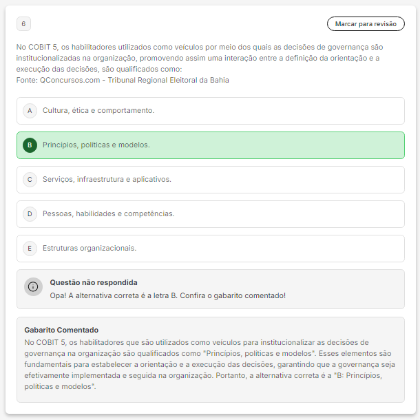 <p>6 Marcar para revisão No COBIT 5, os habilitadores utilizados como por meio dos quais as decisões de governança são institucionalizadas na promovendo assim uma interação entre a definição da orientação e a execução das decisões, são qualificados como: Fonte: QConcursos.com - Tribunal Regional Eleitoral da Bahia A Cultura, ética e B Principios, e modelos. Serviços, infraestrutura e aplicativos. D Pessoas, habilidades e E Estruturas organizacionais. Questão não respondida Opa! A alternativa correta é a letra B. Confira gabarito comentado! Gabarito Comentado No COBIT 5, os habilitadores que são utilizados como veículos para institucionalizar as decisões de governança na organização são qualificados como "Principios, politicas e Esses elementos são fundamentais para estabelecer a orientação e a execução das decisões, garantindo que a governança seja efetivamente implementada e seguida na organização. Portanto, a alternativa correta é a "B: e</p>
