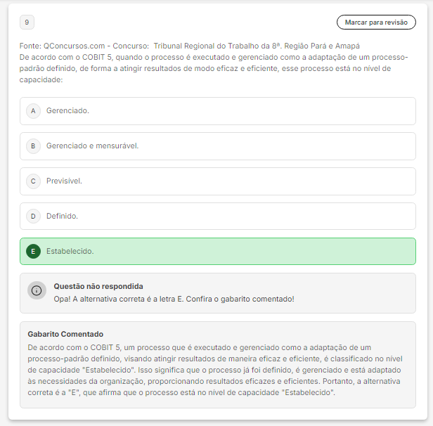 <p>9 Marcar para revisão Fonte: QConcursos.com - Concurso: Tribunal Regional do Trabalho da Região Pará e Amapa De acordo com COBIT quando processo é executado e gerenciado como a adaptação de um processo- padrão definido, de forma a atingir resultados de modo eficaz e eficiente, esse processo está no nivel de capacidade: A B Gerenciado e C D E Questão não respondida A alternativa correta é a letra E. Confira gabarito comentado! Gabarito Comentado De acordo com COBIT 5, um processo que é executado e gerenciado como a adaptação de um processo-padrão definido, visando atingir resultados de maneira eficaz e é classificado no nível de capacidade "Estabelecido". Isso significa que processo já foi definido, é gerenciado e está adaptado às necessidades da proporcionando resultados eficazes e eficientes. Portanto, a alternativa correta é a que afirma que processo está no nivel de capacidade "Estabelecido".</p>