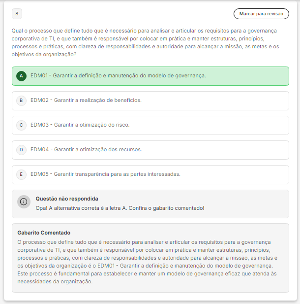 <p>8 Marcar para revisão Qual processo que define tudo que é necessário para analisar e articular os requisitos para a governança corporativa de TI, e que é responsável por colocar em prática e manter estruturas, processos e práticas, com clareza de responsabilidades e autoridade para alcançar a missão, as metas e os objetivos da organização? A EDM01 - Garantir a definição e manutenção do modelo de governança. B EDM02 - Garantir a realização de C EDM03 - Garantir a otimização do risco. D EDM04 - a otimização dos E EDM05 - Garantir transparência para as partes Questão não respondida Opa! A alternativa correta é a letra A. Confira gabarito comentado! Gabarito Comentado O processo que define tudo que é necessário para analisar e articular os requisitos para a governança corporativa de e que também é responsável por colocar em prática e manter estruturas, principios, processos e com clareza de responsabilidades e autoridade para alcançar a missão, as metas e os objetivos da organização é EDM01 Garantir a definição e manutenção do modelo de governança. Este processo é fundamental para estabelecer e manter um modelo de governança eficaz que atenda às necessidades da organização.</p>