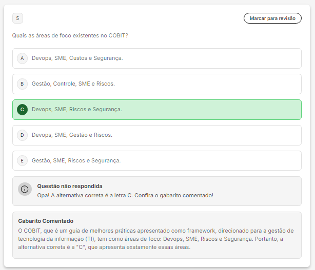<p>5 Marcar para revisão Quais as áreas de foco existentes no COBIT? A Devops, SME, Custos e Segurança. B Gestão, SME e Riscos. Devops, SME, Riscos e Segurança. D Devops, SME, Gestão e E Gestão, SME, Riscos e Segurança. Questão não respondida A alternativa correta é a letra C. Confira gabarito comentado! Gabarito Comentado COBIT, que é um guia de melhores práticas apresentado como direcionado para a gestão de tecnologia da informação (TI), tem como áreas de foco: Devops, SME, Riscos e Segurança. Portanto, a alternativa correta é a "C", que apresenta exatamente essas</p>