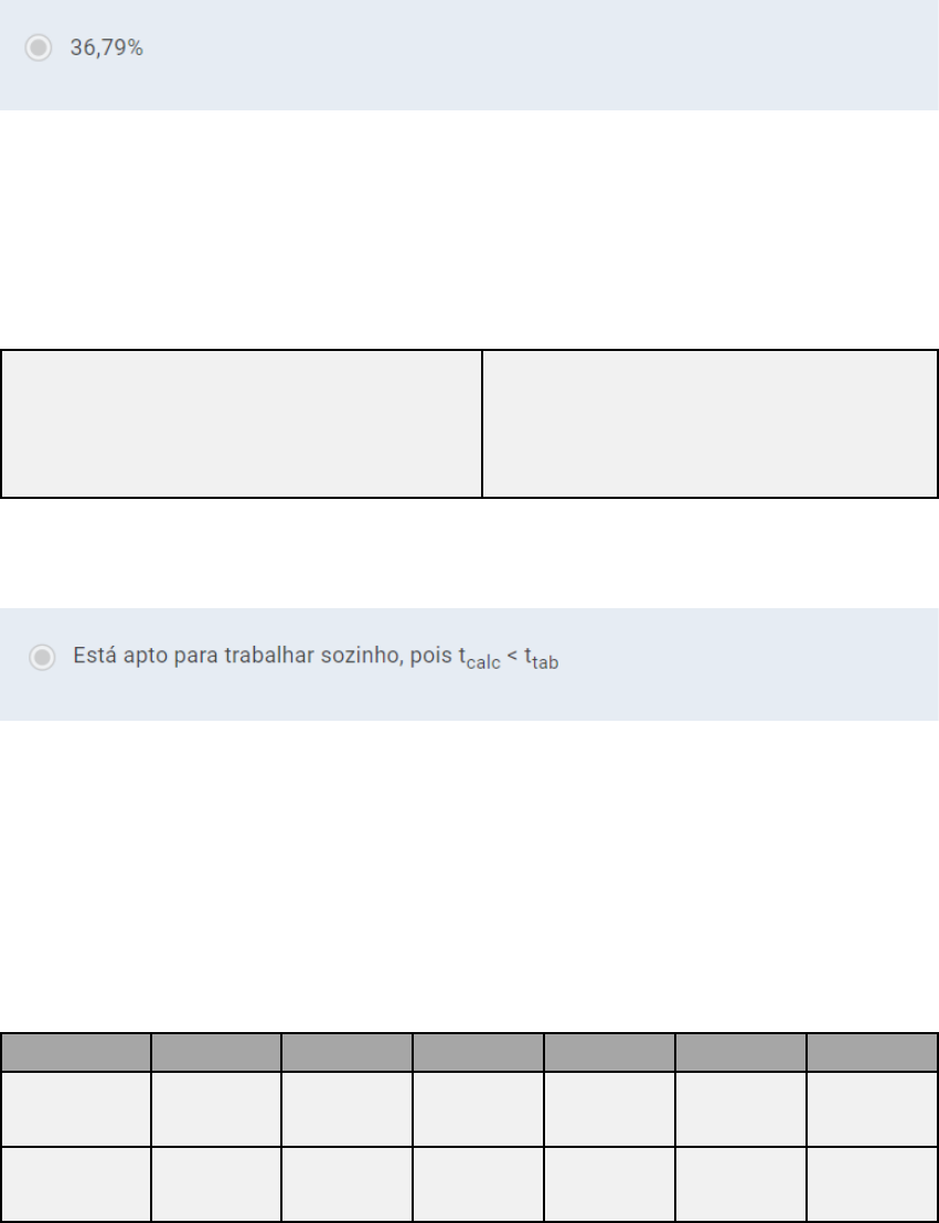 <p>1) Em uma empresa, no setor de atendimento ao cliente por telefone, a duração de</p><p>ligações telefônicas é de 10 minutos, em média, e tem uma distribuição exponencial.</p><p>Num determinando momento, há apenas um telefone disponível, e alguém começa a</p><p>usá-lo imediatamente antes de você. Nessas condições podemos afirmar que a</p><p>probabilidade de que você precise esperar mais que 10 minutos é de:</p><p>2) Em um laboratório de análises clínicas, um estagiário será contratado para trabalhar</p><p>sozinho quando seus resultados não discordarem estatisticamente dos resultados de</p><p>uma analista experiente, em um nível de confiabilidade de 95%.</p><p>Os resultados de nitrogênio na ureia do sangue são mostrados a seguir:</p><p>Resultados encontrados pelo estagiário</p><p>Média: 14,5 mg/dL</p><p>Desvio-padrão: 0,5 mg/dL</p><p>6 amostras</p><p>Resultados encontrados pela analista</p><p>Média: 13,9 mg/dL</p><p>Desvio-padrão: 0,4 mg/dL</p><p>5 amostras</p><p>Nessas condições, o teste de hipóteses revela se o estagiário está apto para trabalhar</p><p>sozinho? Assinale a alternativa correta.</p><p>3) Um vendedor trabalhou comercializando um determinado produto, em sete bairros</p><p>residenciais de uma mesma cidade, em um mesmo período do ano. O diretor comercial</p><p>decidiu verificar se o desempenho do vendedor oscilava em virtude do bairro trabalhado,</p><p>ou seja, se as diferenças eram significativas. De acordo com esse estudo, o diretor</p><p>comercial poderia elaborar uma estratégia para cada bairro ou manter uma para todas.</p><p>Para isso, elaborou a tabela a seguir:</p><p>BAIRRO A B C D E TOTAL</p><p>Vendas</p><p>observadas</p><p>9 11 25 20 15 80</p><p>Valores</p><p>esperados</p><p>16 16 16 16 16 80</p><p>Tabela - Vendas em bairros residenciais de um município</p><p>Nessas condições, com nível de significância de 5%, podemos concluir que haverá</p><p>necessidade de se elaborar uma nova estratégia de vendas, visto que as cidades C e</p><p>D têm um total de vendas superior à esperada? Assinale a alternativa correta.</p><p>4) Uma empresa de montagem de computadores fez um levantamento em sua linha de</p><p>montagem e constatou que o número de defeitos observados em uma amostra de cem</p><p>computadores apresentou a seguinte distribuição de frequências:</p><p>Tabela - Defeitos observado na montagem de computadores</p><p>Nessas condições, utilizando o teste do qui-quadrado, verifique se a frequência do</p><p>número de defeitos é a mesma, independentemente da quantidade.</p><p>5) Uma empresa produz vários artigos artesanais. Considere que o peso de um dos</p><p>artigos artesanais produzidos seja normalmente distribuído (isto é, possui uma</p><p>distribuição normal), apresentando uma média de 20 gramas e com desvio-padrão de</p><p>4 gramas. Nessas condições, qual a probabilidade de que uma unidade, selecionada</p><p>ao acaso, tenha pesos entre 16 e 22 gramas? Assinale a alternativa correta.</p><p>6 ) O professor de Estatística, analisando as notas de uma de suas turmas, verificou</p><p>que as notas respeitam uma distribuição normal, com média igual a 60 e desvio-</p><p>padrão igual a 10.</p><p>Nessas condições, podemos afirmar que a probabilidade de um aluno, selecionado ao</p><p>acaso, ter uma nota menor que 40 é de:</p><p>7) Com o período das chuvas, muitas árvores caem, e a interrupção de energia</p><p>elétrica acontece com mais frequência. Suponha que, em um determinado bairro, a</p><p>interrupção de energia elétrica ocorra segundo uma distribuição de Poisson, com</p><p>média de uma por mês (4 semanas).</p><p>Nessas condições, qual é a probabilidade de que haja interrupção de energia, dado</p><p>que uma já ocorreu, em um intervalo de menos de uma semana? Assinale a</p><p>alternativa correta.</p><p>Defeito(s) 1 2 3 4 5 6</p><p>Frequências 31 28 26 29 35 31</p><p>8) Em um hospital, na ala de neonatal, com a finalidade de estudar a influência da dieta</p><p>alimentar no ganho de peso de prematuros, um grupo de recém-nascidos (com pesos</p><p>entre 1500 g e 2000 g) foi dividido em dois grupos de cinco crianças, submetido a dietas</p><p>diferentes. Na tabela a seguir, estão representados o ganho médio diário, em gramas.</p><p>Sabe-se que a variância das dietas A, e B são, respectivamente: 14,30 e 47,20. Sabe-</p><p>se também que os dados são provenientes de populações que possuem distribuição</p><p>normal e são independentes.</p><p>A B</p><p>22 42</p><p>31 30</p><p>31 28</p><p>26 26</p><p>27 25</p><p>Tabela - Dietas submetidas aos recém-nascidos</p><p>Nessas condições, teste a igualdade de médias, considerando somente as dietas A e</p><p>B, com α = 0,05.</p><p>9) O gestor de uma fazenda quer controlar sua produção de ovelhas de leite. Para</p><p>controlar a homogeneidade de produção de ovelhas leiteiras, semanalmente são</p><p>colhidas as amostras. A produção de uma leva X foi acompanhada por 9 dias, enquanto</p><p>a de uma leva Y, por 6 dias, conforme tabela. Sabe-se que a distribuição da produção</p><p>de leite em cada semana é proveniente de uma distribuição normal.</p><p>X 10,3 15,0 8,0 7,4 15,5 12,3 12,4 8,9 10,7</p><p>Y 8,8 9,4 8,5 10,5 12,2 9,5</p><p>Tabela - Produção de leite</p><p>Nessas condições, podemos concluir que houve alteração na variabilidade? Assinale a</p><p>alternativa correta.</p><p>10) Um laboratório farmacêutico descobriu uma nova droga para o tratamento de uma</p><p>determinada doença. Para avaliar esse novo tratamento, foi feito um ensaio clínico. Dos</p><p>50 pacientes com novo tratamento, 36 se curaram, e, dos 45 tratados com a terapia</p><p>antiga, 29 se curaram.</p><p>Nessas condições, usando significância de 99%, podemos afirmar que o novo</p><p>tratamento é significativamente melhor que o anterior? Assinale a alternativa correta.</p>