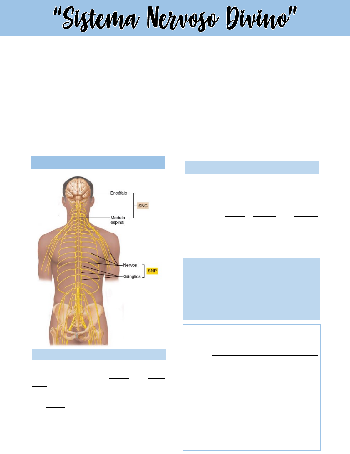 1 @jumorbeck ↠ O sistema nervoso é o principal sistema de controle e comunicação do corpo. Cada pensamento, ação, instinto e emoção refletem a sua atividade. Suas células comunicam-se por meio de sinais elétricos, que são rápidos e específicos e, normalmente, produzem respostas quase imediatas (MARIEB, 7ª ed.). ↠ Com apenas 2 kg de peso, cerca de 3% do peso corporal total, o sistema nervoso é um dos menores, porém mais complexos, dos 11 sistemas corporais. Esta rede intrincada de bilhões de neurônios e de um número ainda maior de células da neuróglia está organizada em duas subdivisões principais: o sistema nervoso central e o sistema nervoso periférico (TORTORA, 14ª ed.). Morfologia do sistema nervoso central e periférico SISTEMA NERVOSO CENTRAL (SNC) ↠ O sistema nervoso central, ou parte central do sistema nervoso, (SNC) é formado pelo encéfalo e pela medula espinal, que ocupam o crânio e o canal vertebral, respectivamente (MARIEB, 7ª ed.). ↠ O encéfalo é a parte do SNC que está localizada no crânio e contém cerca de 85 bilhões de neurônios. A medula espinal conecta-se com o encéfalo por meio do forame magno do occipital e está envolvida pelos ossos da coluna vertebral. A medula espinal possui cerca de 100 milhões de neurônios (TORTORA, 14ª ed.). ↠ O encéfalo e a medula espinal são contínuos entre si no forame magno (SEELY, 10ª ed.). ↠ O SNC é o centro de integração e comando do sistema nervoso, pois recebe sinais sensitivos, interpreta- os e determina as respostas motoras com base em experiências pregressas, reflexos e condições atuais (MARIEB, 7ª ed.). ↠ O SNC processa muitos tipos diferentes de informações sensitivas. Também é a fonte dos pensamentos, das emoções e das memórias. A maioria dos sinais que estimulam a contração muscular e a liberação das secreções glandulares se origina no SNC (TORTORA, 14ª ed.). Encéfalo ↠ O encéfalo é a parte do sistema nervoso central (SNC) que está contida no interior da cavidade craniana (SEELY, 10ª ed.). Os anatomistas costumam classificar o encéfalo em quatro partes: tronco encefálico (bulbo, ponte e mesencéfalo), cerebelo, diencéfalo e telencéfalo (cérebro), composto de dois hemisférios cerebrais (MARIEB, 7ª ed.). ↠ O encéfalo humano adulto médio pesa aproximadamente 1.500 g (MARIEB, 7ª ed.). As funções do encéfalo variam de atividades comuns (porém essenciais) de manutenção da vida até funções neurais mais complexas. O encéfalo controla a frequência cardíaca, a frequência respiratória e a pressão arterial - e mantém o ambiente interno por meio do controle da divisão autônoma do sistema nervoso e do sistema endócrino. Sobretudo, o encéfalo executa tarefas de alto nível - aquelas associadas a inteligência, consciência, memória, integração sensório-motora, emoção, comportamento e socialização (MARIEB, 7ª ed.). BÔNUS Para entender a terminologia utilizada para as principais divisões do encéfalo adulto, será útil compreender o seu desenvolvimento embriológico. O encéfalo e a medula espinal são derivados do tubo neural, que por sua vez se origina do ectoderma. A parte anterior do tubo neural se expande, junto com o tecido da crista neural, desenvolvendo constrições que determinam o aparecimento de três regiões chamadas de vesículas encefálicas primárias: prosencéfalo, mesencéfalo e rombencéfalo. Tanto o prosencéfalo quanto o rombencéfalo se subdividem, formando as vesículas encefálicas secundárias. O prosencéfalo dá origem ao telencéfalo e ao diencéfalo; o rombencéfalo, ao metencéfalo e ao mielencéfalo (TORTORA, 14ª ed.). As diversas vesículas encefálicas originam as seguintes estruturas no adulto: (TORTORA, 14ª ed.). • O telencéfalo forma o cérebro e os ventrículos laterais APG 01 2 @jumorbeck • O diencéfalo dá origem ao tálamo, ao hipotálamo, ao epitálamo e ao terceiro ventrículo • O mesencéfalo forma estrutura de mesmo nome e o aqueduto do mesencéfalo • O metencéfalo dá origem à ponte, ao cerebelo e à parte superior do quarto ventrículo • O mielencéfalo forma o bulbo (medula oblonga) e a parte inferior do quarto ventrículo. ↠ O tronco encefálico é contínuo com a medula espinal e é composto pelo bulbo, pela ponte e pelo mesencéfalo. Posteriormente ao tronco encefálico se encontra o cerebelo. Superiormente ao tronco encefálico se localiza o diencéfalo, formado pelo tálamo, pelo hipotálamo e pelo epitálamo. Apoiado no diencéfalo está o telencéfalo (cérebro), a maior parte do encéfalo (TORTORA, 14ª ed.). Tronco encefálico ↠ O tronco encefálico conecta a medula espinal ao restante do encéfalo (SEELY, 10ª ed.). ↠ A mais caudal das quatro partes principais do encéfalo é o tronco encefálico. Da posição caudal para a rostral, as três regiões do tronco encefálico são o bulbo, a ponte e o mesencéfalo (MARIEB, 7ª ed.). Cada região tem aproximadamente 2,5 cm de comprimento e, juntas, correspondem a apenas 25% da massa encefálica total. Situado na fossa do crânio posterior, na parte basilar do osso occipital, o tronco encefálico tem quatro funções gerais: (MARIEB, 7ª ed.). • Age como uma via de passagem para todos os tratos fibrosos que vão do cerebelo até a medula espinal. • Participa ativamente da inervação da face e da cabeça; 10 a 12 pares de nervos craniais conectam-se a ele. • Produz comportamentos rigidamente programados e automáticos, necessários para a sobrevivência. • Integra os reflexos auditivos e visuais. O tronco encefálico é responsável por várias funções essenciais. Lesões a pequenas áreas frequentemente resultam em morte, já que muitos reflexos vitais são integrados no tronco encefálico (SEELY, 10ª ed.). ↠ O tronco encefálico tem o mesmo plano estrutural da medula espinal, com substância branca externa circundando uma região interna de substância cinzenta. No entanto, os núc