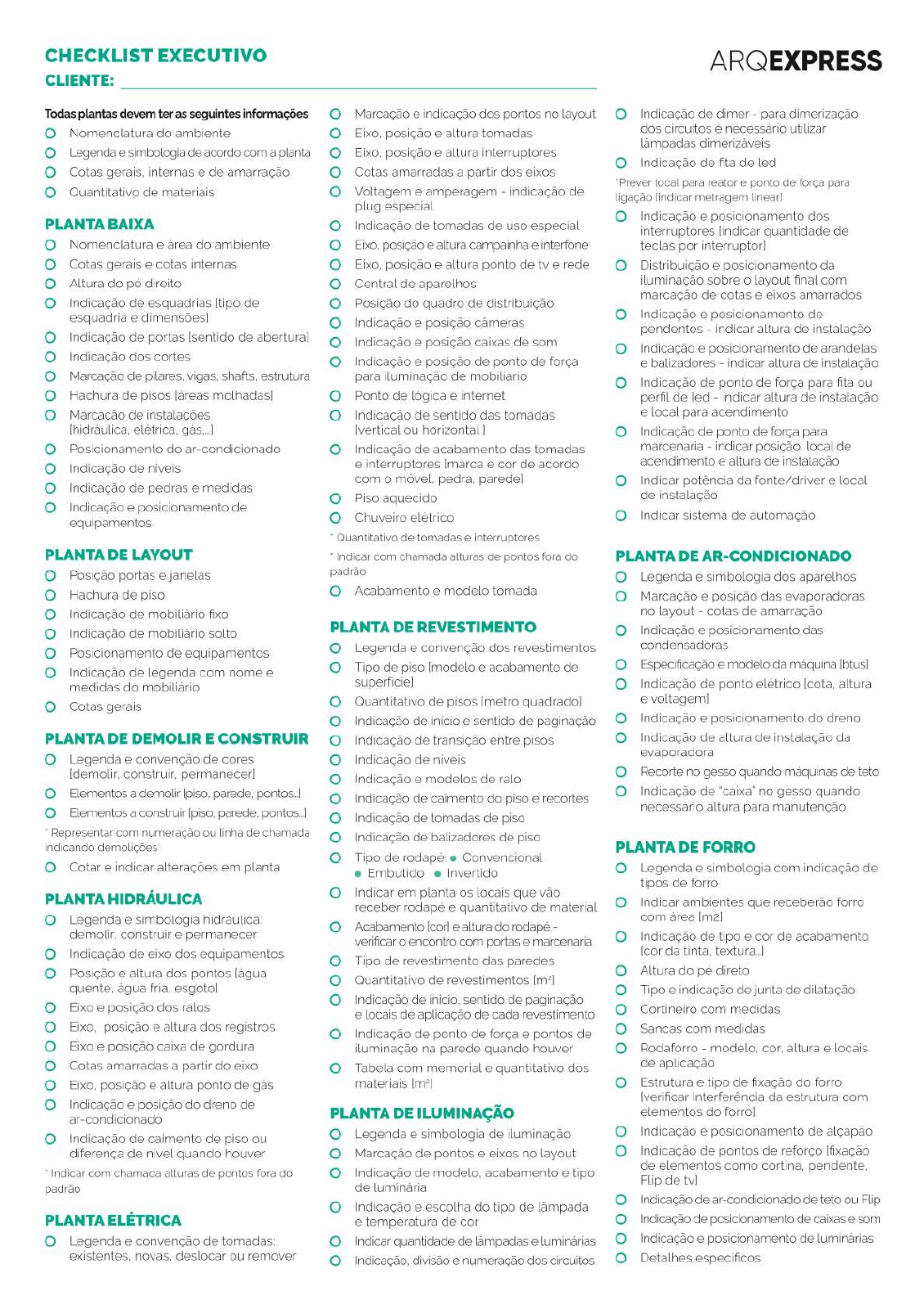 <p>CHECKLIST EXECUTIVO ARQEXPRESS CLIENTE: Todas plantas devem ter as seguintes informações Marcação e indicação dos pontos no layout Indicação de dimer para dimerização Nomenclatura do ambiente Eixo, posição e altura tomadas dos circuitos é necessário utilizar dimerizáveis Legenda e simbologia de acordo com a planta Eixo, posição e altura interruptores Indicação de fita de led Cotas internas e de amarração Cotas amarradas a partir dos eixos 'Prever local para reator e ponto de força para Quantitativo de materiais Voltagem e amperagem indicação de ligação metragem plug especial PLANTA BAIXA Indicação e posicionamento dos Indicação de tomadas de uso especial interruptores quantidade de Nomenclatura e área do ambiente Eixo, posição e altura campainha e interfone teclas por interruptor] Cotas gerais e cotas internas Eixo, posição e altura ponto de tv e rede Distribuição e posicionamento da Altura do direito Central de aparelhos iluminação sobre layout final com marcação de cotas e eixos amarrados Indicação de esquadrias [tipo de Posição do quadro de distribuição esquadria e Indicação e posicionamento de Indicação e posição câmeras pendentes indicar altura de instalação Indicação de portas Isentido de abertural Indicação e posição caixas de som Indicação e posicionamento de arandelas Indicação dos cortes Indicação e posição de ponto de força e balizadores indicar altura de instalação Marcação de vigas, estrutura para iluminação de mobiliário Indicação de ponto de força para fita ou Hachura de pisos láreas Ponto de lógica e internet perfil de led indicar altura de instalação Marcação de instalações Indicação de sentido das tomadas e local para acendimento elétrica, [vertical ou horizontal Indicação de ponto de força para Posicionamento do ar-condicionado Indicação de acabamento das tomadas marcenaria indicar local de Indicação de niveis e interruptores [marca e cor de acordo acendimento e altura de instalação com pedra, Indicar potência da fonte/driver e local Indicação de pedras e medidas Piso aquecido de instalação Indicação e posicionamento de Chuveiro elétrico Indicar sistema de automação equipamentos Quantitativo de tomadas e interruptores PLANTA DE LAYOUT Indicar com chamada alturas de pontos fora do PLANTA DE AR-CONDICIONADO Posição portas e janelas padrão Legenda e simbologia dos aparelhos Hachura de piso Acabamento e modelo tomada Marcação e posição das evaporadoras Indicação de mobiliário fixo no layout cotas de amarração Indicação de mobiliário solto PLANTA DE REVESTIMENTO Indicação e posicionamento das Posicionamento de equipamentos Legenda e convenção dos revestimentos condensadoras Indicação de legenda com nome e Tipo de piso [modelo e acabamento de Especificação e modelo da máquina [btus] medidas do mobiliário Indicação de ponto elétrico [cota, altura Quantitativo de pisos e Cotas gerais Indicação de e sentido de paginação Indicação e posicionamento do dreno PLANTA DE DEMOLIR E CONSTRUIR Indicação de transição entre pisos Indicação de altura de instalação da Legenda e convenção de cores Indicação de evaporadora permanecer] Recorte no gesso quando máquinas de teto Indicação e modelos de ralo Elementos a demolir pontos... Indicação de "caixa" no gesso quando Indicação de caimento do piso e recortes Elementos a construir parede, necessário altura para manutenção Indicação de tomadas de piso Representar com numeração ou linha de chamada Indicação de balizadores de piso indicando demolições PLANTA DE FORRO Tipo de Convencional Cotar e indicar alterações em planta Embutido Invertido Legenda e simbologia com indicação de tipos de forro PLANTA HIDRÁULICA Indicar em planta os locais que vão receber e quantitativo de material Indicar ambientes que receberão forro Legenda e simbologia com área [m2] Acabamento [cor] e altura do construir e permanecer verificar encontro com portas e marcenaria Indicação de tipo e de acabamento Indicação de eixo dos equipamentos da tinta, Tipo de revestimento das paredes Posição e altura dos pontos Altura do pé direto Quantitativo de revestimentos água fria. Tipo e indicação de junta de dilatação Indicação de inicio, sentido de paginação Eixo e posição dos ralos e locais de aplicação de cada revestimento Cortineiro com medidas Eixo, posição e altura dos registros Indicação de ponto de força e pontos de Sancas com medidas Eixo e posição caixa de gordura iluminação na parede quando houver Rodaforro modelo, cor, altura e locais Cotas amarradas a partir do eixo Tabela com memorial e quantitativo dos de aplicação Eixo, posição e altura ponto de gás materiais Estrutura e tipo de fixação do forro interferência da estrutura com Indicação e posição do dreno de PLANTA DE ILUMINAÇÃO elementos do forrol ar-condicionado Legenda e simbologia de iluminação Indicação e posicionamento de Indicação de caimento de piso ou diferença de nivel quando houver Marcação de pontos e eixos no layout Indicação de pontos de reforço [fixação de elementos como cortina, pendente, Indicar com chamada alturas de pontos fora do Indicação de acabamento e tipo padrão de luminária Flip de tvl Indicação e escolha do tipo de Indicação de ar-condicionado de teto ou Flip PLANTA ELÉTRICA e temperatura de con Indicação de posicionamento de caixas e som Legenda e convenção de tomadas: Indicar quantidade de e Indicação e posicionamento de luminárias deslocar ou remover divisão e numeração dos circuitos Detalhes especificos</p>