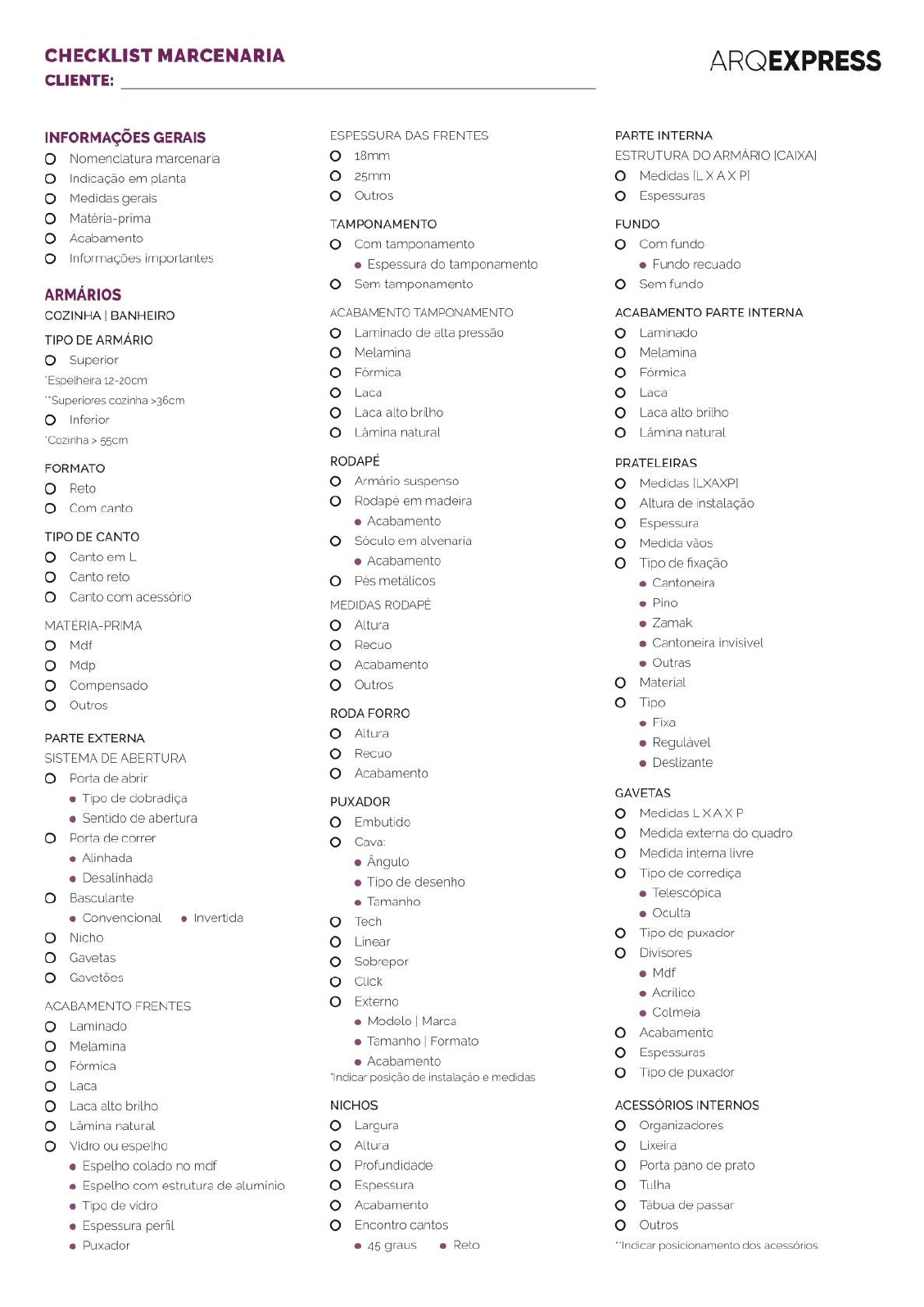<p>CHECKLIST MARCENARIA ARQEXPRESS CLIENTE: INFORMAÇÕES GERAIS ESPESSURA DAS FRENTES PARTE INTERNA Nomenclatura marcenaria 18mm ESTRUTURA DO ARMÁRIO [CAIXA] Indicação em planta 25mm Medidas Medidas gerais Outros Espessuras Matéria-prima TAMPONAMENTO FUNDO Acabamento Com tamponamento Com fundo Informações importantes Espessura do tamponamento Fundo recuado Sem tamponamento Sem fundo ARMÁRIOS COZINHA BANHEIRO ACABAMENTO TAMPONAMENTO ACABAMENTO PARTE INTERNA TIPO DE ARMÁRIO Laminado de alta pressão Laminado Melamina Melamina Superior 12-20cm Laca Laca cozinha >36cm Laca alto brilho Laca alto brilho Inferior natural natural 'Cozinha > 55cm FORMATO PRATELEIRAS Reto Armário suspenso Medidas [LXAXP] Com canto em madeira Altura de instalação Acabamento Espessura TIPO DE CANTO Sóculo em alvenaria Medida vãos Canto em L Acabamento Tipo de fixação Canto reto Pés metálicos Cantoneira Canto com acessório MEDIDAS Pino MATÉRIA-PRIMA Altura Zamak Mdf Recuo Cantoneira invisivel Mdp Acabamento Outras Compensado Outros Material Outros Tipo RODA FORRO Fixa PARTE EXTERNA Altura Regulável SISTEMA DE ABERTURA Recuo Deslizante Porta de abrir Acabamento Tipo de GAVETAS PUXADOR Sentido de abertura Medidas LXAXP Embutido Porta de correr Medida externa do quadro Cava: Alinhada Medida interna livre Desalinhada Tipo de corrediça Tipo de desenho Basculante Tamanho Convencional Invertida Oculta Tech Nicho Tipo de puxador Linear Gavetas Divisores Sobrepor Gavetões Mdf Click Acrilico ACABAMENTO FRENTES Externo Colmeia Laminado Modelo Marca Acabamento Melamina Tamanho Formato Espessuras Acabamento posição de instalação e medidas Tipo de puxador Laca Laca alto brilho NICHOS ACESSÓRIOS INTERNOS natural Largura Organizadores Vidro ou espelho Altura Lixeira Espelho colado no mdf Profundidade Porta pano de prato Espelho com estrutura de Espessura Tulha Tipo de vidro Acabamento de passar Espessura perfil Encontro cantos Outros Puxador 45 graus Reto posicionamento dos acessórios</p><p>CHECKLIST MARCENARIA ARQEXPRESS ILUMINAÇÃO Tipo de tomada Espessura do tamponamento Caixa 4X2 Sim Não Sem tamponamento Botão Encaixe: TIPO DE ILUMINAÇÃO Retangular Reto Fita de led Indicação de recorte 45 graus Perfil de led Eixo e posição Spot ACABAMENTO TAMPONAMENTO ILUMINAÇÃO Marca natural Modelo TIPO DE ILUMINAÇÃO Fórmica Fita de led Local para reator Melamina Perfil de led Laminado INTERRUPTOR Spot Laca Botão na marcenaria Arandela Laca alto brilho Tecla na marcenaria Modelo Caixa Altura de instalação PUXADOR Cava RECORTES ACIONAMENTO ILUMINAÇÃO Medida Registros Local para acendimento Tipo de cava Gás Local para reator Embutido Elétrica Temperatura de cor Externo Hidráulica Marca Modelo Acabamento Linear Outros Frente passante recortes para acessos e instalações MESA DE CABECEIRA Click COTAS MEDIDAS Sobrepor Cotas gerais Largura TOMADAS Cotas por módulo "Considerar 10cm de folga entre a mesa e colchão Com tomadas Altura Altura "Alinhar com colchão ou então 10cm mais alta ou Parte superior Largura mais baixa Lateral Profundidade Profundidade Caixa de tomadas Espessuras 40cm ou mais Sem tomadas Cotas internas Cotas Vãos internos livres PARTE INTERNA ESTRUTURAS Distribuição CABECEIRA Suspensa Acabamentos Tipo de fixação Detalhes MEDIDAS Apoiada Divisores Largura Até chão minima 10cm > que O tamanho do colchão Com ROUPEIRO "Marcação de emenda quando > 2730mm Estrutura em serralheria Altura FORMATO 50cm > que colchão PARTE EXTERNAS Reto de emenda quando > 1750mm FRENTES Com canto Profundidade Porta da parede para respiro >10mm MEDIDA Gaveta Espessura Altura Com chave Sem chave Buinha/Negativo Largura Nicho Afastamento Profundidade ACABAMENTO - FRENTES Divisão dos módulos MATERIAL natural Lâmina natural TIPO DE CANTO Mdf Canto em L Melamina Laca Canto reto Laminado Estofada Canto morto Laca DETALHE Laca alto brilho ESTUTURA DO ARMÁRIO Lisa Vidro/espelho Laterais até chão Ripada Colado no mdf Lateriais ocultas Em placas Estrutura em aluminio Sobre base recuada Outros Puxador SISTEMA DE ABERTURA TOMADAS TAMPONAMENTO Porta de abrir Modelo e acabamento Com tamponamento Porta de correr</p><p>CHECKLIST MARCENARIA ARQEXPRESS Boiserie Porta cinto Nicho Estrutura Porta gravata Gavetas Detalhamento Cofre Gavetões Vidro ou espelho Tulha Porta escamoteável Espelho colado no mdf Outros Sem portas Espelho com estrutura de aluminio PRATELEIRAS Tipo de vidro PORTA DE ABRIR Medidas Espessura perfil Sentido de abertura Espessura Puxador Tipo de dobradiça Altura de instalação Reta ACABAMENTO TAMPONAMENTO Altura livre Curva Laminado Tipo de fixação Super curva Melamina Puxador Especiais Tipo de prateleira Laca Fixa PORTA DE CORRER Laca alto brilho Regulável Interna natural Deslizante Sustentando na base Suspensa PUXADOR CALCEIRO Externa Embutido Pronto Sustentando na base Cava: Sob medida Suspensa Tipo de cava Cabideiro Coplanar Tamanho CABIDEIRO Pino-guia Cabideiro fixo nas laterais Medida PORTAS Cabideiro fixo no teto Linear Largura Cabideiro iluminado Sobrepor Altura Cabideiro flexivel Externo Espessura Acabamento acessórios Modelo/marca Detalhe especial Cromado Tamanho Modelo de puxador Branco Acabamento Acabamento Preto medida e posição de instalação Sentido de abertura Outros PARTE INTERNA PARTE EXTERNA ESTRUTURA DO ARMÁRIO GAVETAS TAMPONAMENTO Medidas [LXAXP] Medidas Com tamponamento Espessura Altura Espessura do tamponamento Divisória interna Sem tamponamento FUNDO Acrílico Com fundo Mdf Fundo recuado Colmeia Com Sem Sem fundo Altura do Tipo de puxador Indicação de recortes Cava Recuo Acabamento ACABAMENTOS Embutido Laminado de alta pressão Recorte RODA FORRO Melamina Externo Com Sem Medida do roda forro CORREDICA Laca Recuo Laca alto brilho alinhamento com roda forro existente Oculta Lâmina natural ACABAMENTO PORTAS/FRENTES ILUMINAÇÃO NO ARMÁRIO DIVISÃO INTERNA Sim Não Laminado Prateleiras Melamina Calceiro TIPO DE ILUMINAÇÃO Fórmica Cabideiro Fita de led L