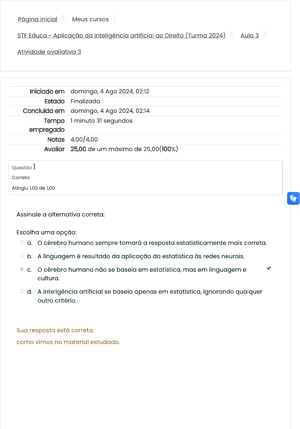 <p>Página inicial Meus cursos STF Educa - Aplicação da inteligência artificial ao Direito (Turma 2024) Aula 3 Atividade avaliativa 3 Iniciado em domingo, 4 Ago 2024, 02:12 Estado Finalizada Concluída em domingo, 4 Ago 2024, 02:14 Tempo 1 minuto 31 segundos empregado Notas 4,00/4,00 Avaliar 25,00 de um máximo de 25,00(100%) Questão 1 Correto Atingiu 1,00 de 1,00 a alternativa correta: Escolha uma opção: a. cérebro humano sempre tomará a resposta estatisticamente mais correta. b. A linguagem é resultado da aplicação da estatística às redes neurais. C. cérebro humano não se baseia em estatística, mas em linguagem e cultura. d. A inteligência artificial se baseia apenas em estatística, ignorando qualquer outro critério. Sua resposta está correta. como vimos no material</p><p>Questão 2 Correto Atingiu 1,00 de 1,00 a alternativa incorreta: Escolha uma opção: a. A linguagem gráfica explica boa parte do desenvolvimento das relações humanas. b. Storytelling é a capacidade do ser humano de contar histórias e estabelecer uma cultura própria. C. Para a inteligência artificial atingir o ponto da inteligência humana, seria necessário que ela entendesse o que é e como se deve estabelecer uma cultura d. A inteligência artificial é sinônimo de análise estatística. Sua resposta está correta. Há tipos distintos de inteligências artificiais. A análise preditiva é outra delas, por exemplo.</p><p>Questão 3 Correto Atingiu 1,00 de 1,00 Analise as assertivas: A) A inteligência artificial está ligada diretamente a análise preditiva, oferecendo sempre apenas uma resposta. B) As redes neurais humanas são resultado do desenvolvimento cultural. Escolha uma opção: a. A é verdadeira e B é falsa. b. A é falsa e B é verdadeira. C. A e B são falsas. d. A e B são verdadeiras. Sua resposta está correta. o diferencial da análise preditiva é justamente a existência de mais de uma resposta, numa analogia ao cérebro humano. desenvolvimento cultural é parte fundamental do avanço nas redes neurais humanas. Questão 4 Correto Atingiu 1,00 de 1,00 No direito a análise preditiva pode ser utilizada para todas as alternativas abaixo, exceto: Escolha uma opção: a. Auxiliar na produção de provas. b. Auxiliar na aferição de capacidade cognitiva do sujeito. C. Estabelecer padrões de atuação na produção de provas. d. Julgar um processo-crime. Sua resposta está correta. estamos ainda muito distantes de um julgamento satisfatório por um robô. Não há ainda como substituir um julgador humano de maneira</p><p>Atividade anterior Material de estudo - Aula 3 Seguir para... Próxima atividade Material de estudo - Aula 4 Contato ead@stf.jus.br Portal www.stf.jus.br Política de Privacidade</p>