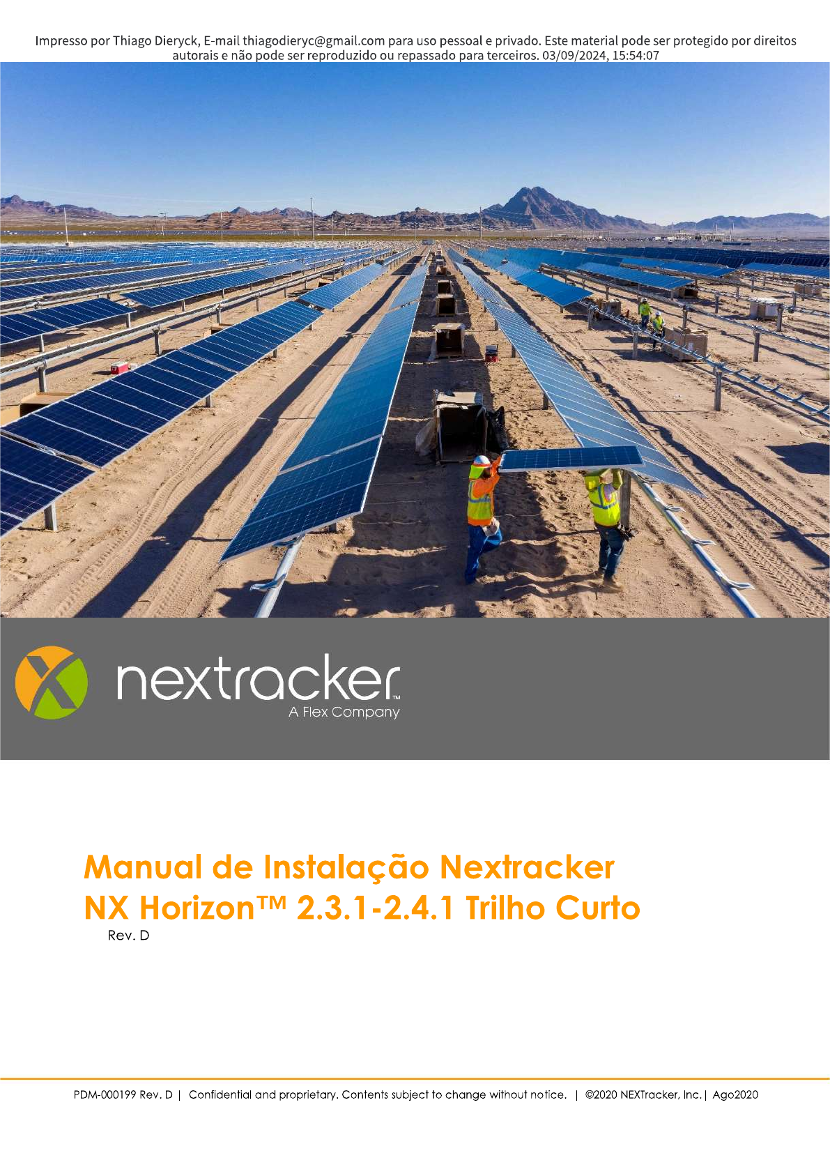 <p>Impresso por Thiago Dieryck, E-mail thiagodieryc@gmail.com para uso pessoal e privado. Este material pode ser protegido por direitos autorais e não pode ser reproduzido ou repassado para terceiros. 03/09/2024, 15:54:07 A Flex Company Manual de Instalação Nextracker NX Horizon TM 2.3.1-2.4.1 Trilho Curto Rev. D PDM-000199 Rev. D I Confidential and proprietary. Contents subject to change without notice. NEXTracker, Inc. Ago2020</p><p>Impresso por Thiago Dieryck, E-mail thiagodieryc@gmail.com para uso pessoal e privado. Este material pode ser protegido por direitos autorais e não pode ser reproduzido ou repassado para terceiros. 03/09/2024, 15:54:07 A Flex Company Manual de Instalação Nextracker NX Horizon TM 2.3.1-2.4.1 Trilho Curto Prefácio 4 Sobre este Manual 4 Segurança 4 Limitações de Escopo 4 Como Usar Este Manual 5 Apontamentos 5 Especificações dos Módulos 5 Aterramento 6 Resumo da Operação do Tracker 6 Classificações do Tracker 6 Tamanho dos Rebites Cegos 7 Ferramentas Necessárias para Montagem 9 Procedimento de Marcação de Torque 10 Tarefa A Instalação dos Piers 12 Instalar Pier do Motor 12 A2. Instalar Pier de Matriz 12 Tarefa B - Instalação do Slew Drive 13 B1. Instalar Suporte do Slew Drive no Pier do Motor 13 B2. Instalar Slew Drive Assembly 13 Tarefa - Montagem do Motor no Slew Drive 15 Tarefa D - Instalação do Bearing Housing Assembly (BHA) 17 Tarefa E - Instalação do Tubo de Torque 20 E1. Acomple Tubo de Torque ao Slew Drive Assembly 20 E2. Instalação do Tubo de Torque 21 E3. os Trilho do Módulo no BHA 22 Tarefa F - Alinhar e Travar a Fileira 30 F1. Alinhe os tubos de torque e fixe (trave) a fileira 30 F2. Fixar ou rebitar os fixadores 30 Tarefa G - Instalação dos Amortecedores 33 G1. Instalar Parafuso U para Montagem Superior do Amortecedor 33 G2. Suporte do Amortecedor Inferior no Pier 35 G3. Instalar Amortecedor nos Suportes de Amortecedor 37 G4. Todas as fileiras: Coloque a Tampa no Tubo de Torque Tarefa H Instalação dos Trilhos de Módulo 42 H1. Instalar os primeiros trilhos de módulo 42 PDM-000199 Rev. D Confidential and proprietary. Contents subject to change without notice. ©2020 NEXTracker, Inc. I 08/20</p><p>Impresso por Thiago Dieryck, E-mail thiagodieryc@gmail.com para uso pessoal e privado. Este material pode ser protegido por direitos autorais e não pode ser reproduzido ou repassado para terceiros. 03/09/2024, 15:54:07 Manual de Instalação Nextracker NX 2.3.1-2.4.1 Trilho Curto 3 H2. Instalar os Trilhos de Módulo 43 Tarefa - Montagem do Módulo 47 11. Instalar os Módulos 47 Fiação do Módulo 48 Tarefa J - Ajustando as Fileiras 51 Tarefa K - Instalação do SPO 52 K1. Instalar Painel de SPC e SPC no Suporte 52 K2. Fiação do 60 Check List Mecânico 64 Comissionamento 68 Operação e Manutenção 69 Principais Definições 70 Revisões para esse Manual 71 PDM-000199 Rev. D Confidential and proprietary. Contents subject to change without notice. NEXTracker, Inc. 08/20</p><p>Impresso por Thiago Dieryck, E-mail thiagodieryc@gmail.com para uso pessoal e privado. Este material pode ser protegido por direitos autorais e não pode ser reproduzido ou repassado para terceiros. 03/09/2024, 15:54:07 Manual de Instalação Nextracker NX HorizonTM 2.3.1-2.4.1 Trilho Curto 4 Prefácio Sobre este Manual Este é Manual de Instalação do Nextracker NX Horizon 2.3.1-2.4.1 Trilho Curto. É aplicado para todos os projetos 2.3.1: 2.3.9 e 2.4.1. Ele apresenta os requisitos e instruções detalhados de instalação, lembretes de segurança, etapas importantes e outras informações; os melhores meios e métodos de trabalho podem ser determinados pelo instalador. Segurança As seguintes notas, avisos e itens críticos aparecem ao longo deste manual: ! NOTA: Esta caixa contém informações que tornam a montagem dos componentes da Nextracker mais rápida e fácil. AVISO: Esta caixa alerta leitor para uma condição que pode levar a consequências críticas. CRÍTICO: Esta caixa fornece informações urgentes e importantes. Desconsiderar isso pode levar a danos ao equipamento, ferramentas ou componentes; podendo ! comprometer a garantia da Nextracker. Essas informações anotam etapas cruciais para a instalação de componentes, de modo que atendam aos requisitos de qualidade. SEGURANÇA E MEIO AMBIENTE: Esta caixa fornece informações importante para ! segurança dos operadores durante a montagem e cuidados com Meio Ambiente. Desconsiderar isso pode levar a ferimentos devido a acidentes e até perda de vida. Além das melhores práticas gerais de construção, USO apropriado de equipamentos de proteção individual (EPI) é essencial ao manusear componentes pesados e equipamentos que possam ser pressurizados com fluido hidráulico ou ar. A proteção dos olhos e a proteção auricular devem fazer parte do EPI. A adesão às instruções de segurança de todos os fornecedores de terceiros também é recomendada. Por favor, esteja ciente dos perigos resultantes de projéteis, movimento repetitivo, ruído, vibração e outros aspectos do USO de ferramentas hidráulicas, pneumáticas e elétricas. Limitações de Escopo Este é um manual geral que cobre um produto Nextracker; configurações específicas do projeto são abordadas em outro lugar. Por favor, veja Construction Set e a Part Number Reference List para detalhes específicos do projeto. PDM-000199 Rev. D Confidential and proprietary. Contents subject to change without notice. NEXTracker, Inc. 08/20</p><p>Impresso por Thiago Dieryck, E-mail thiagodieryc@gmail.com para uso pessoal e privado. Este material pode ser protegido por direitos autorais e não pode ser reproduzido ou repassado para terceiros. 03/09/2024, 15:54:07 Manual de Instalação Nextracker NX HorizonTM 2.3.1-2.4.1 Trilho Curto 5 Como Usar Este Manual Apontamentos Este manual guia a instalação da linha de produtos Nextracker NX Ele faz referência a documentação relacionada ao produto; é uma das famílias de docume