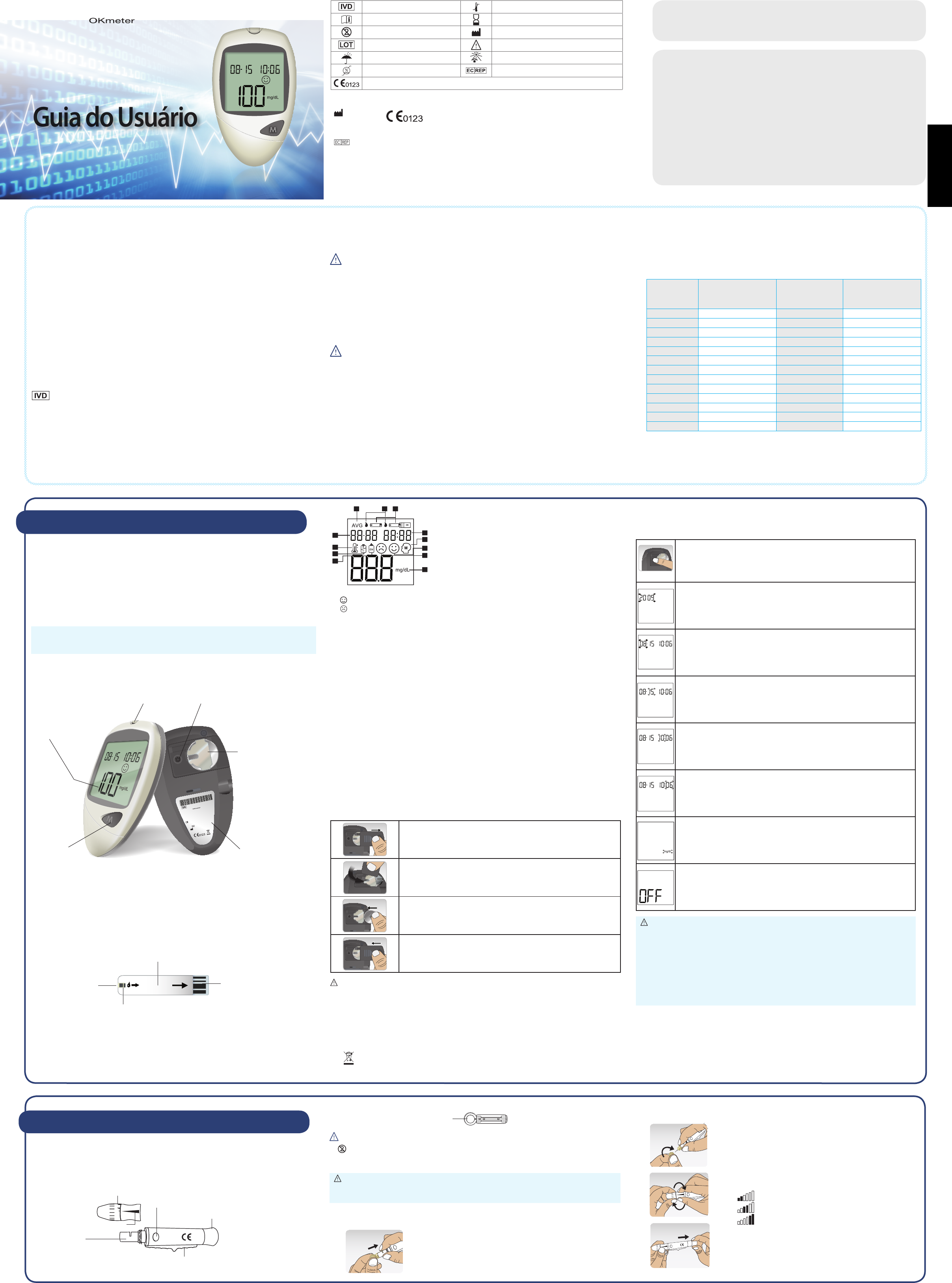<p>LADO</p><p>LANCETA</p><p>Informações Importantes sobre o Lancetador e as Lancetas</p><p>1. A lanceta serve para uso único.</p><p>2. Mantenha o lancetador sempre limpo.</p><p>3. Cuidado ao remover e descartar a lanceta utilizada.</p><p>IMPORTANTE: O medidor e o lancetador servem para um único paciente.</p><p>NÃO compartilhe com ninguém, nem mesmo com outros familiares!</p><p>NÃO use em vários pacientes!</p><p>Antes de Começar</p><p>"Leia cuidadosamente as instruções de uso antes de realizar o teste. Autoteste para</p><p>monitoramento de glicose no sangue, sem fins de diagnósticos"</p><p>As seguintes precauções de segurança básicas devem ser sempre tomadas.</p><p>1. Sugerimos supervisão quando o dispositivo for usado em crianças ou pessoas</p><p>portadoras de necessidades especiais.</p><p>2. Não use tiras de teste e soluções de controle que não sejam fornecidas pelo</p><p>fabricante.</p><p>3. O autoteste não substitui as consultas regulares com seu médico. Antes de</p><p>utilizar o autoteste, leia o manual do usuário ou procure um profissional da saúde</p><p>qualificado.</p><p>4. Evite realizar seu teste próximo a aparelhos, equipamentos elétricos ou</p><p>eletrônicos que sejam fontes de radiação eletromagnética, pois podem interferir</p><p>no bom funcionamento do medidor.</p><p>5. GUARDE ESTE GUIA DO USUÁRIO COM VOCÊ.</p><p>Indicação de Uso</p><p>O Sistema de Monitoramento de Glicose Sanguínea OKmeter Match II foi</p><p>projetado para medir a concentração de glicose em sangue total. É indicado para</p><p>monitoramento de glicose e pode ser usado tanto por usuários com diabetes de</p><p>neonatos a adultos quanto por profissionais de saúde, em ambiente domiciliar ou em</p><p>instituições de saúde. Este produto é indicado para diagnóstico de uso in vitro.</p><p>Princípio de Ação</p><p>Tecnologia: amperometria.</p><p>A glicose presente nas amostras sanguíneas reage com os compostos químicos</p><p>1. Conhecendo Seu Sistema</p><p>O Sistema de Monitoramento de Glicemia OKmeter Match II.</p><p>O OKmeter Match II utiliza tecnologia de ponta no monitoramento da glicose</p><p>sanguínea (amperometria) para oferecer um teste fácil, confortável e preciso.</p><p>O sistema necessita de apenas 0.7μL (sete décimos de microlitro) de amostra</p><p>sanguínea para completar o teste em apenas 5 segundos.</p><p>O sistema OKmeter Match II consiste em:</p><p>1. Medidor de Glicemia OKmeter Match II</p><p>2. Tira de Teste de Glicemia OKmeter Match II</p><p>Importante: Use apenas tiras de teste e soluções de controle OKmeter Match II</p><p>com seu medidor OKmeter Match II. Usar outras tiras de teste e solução controle</p><p>com este medidor pode produzir resultados imprecisos.</p><p>existentes na tira e produzem uma corrente elétrica. A intensidade da corrente</p><p>produzida muda conforme a quantidade de glicose presente no sangue. O medidor</p><p>OKmeter Match II mede a intensidade da corrente e exibe o resultado convertido em</p><p>nível de glicose no sangue.</p><p>Precauções</p><p>1. O teste venoso só deve ser feito por um profissional. Não tente fazer em casa!</p><p>2. O usuário não deve tomar nenhuma decisão de relevância médica sem antes</p><p>consultar seu médico.</p><p>3. Ligue imediatamente para seu médico, se tiver sintomas que não sejam compatíveis</p><p>com os resultados do teste de glicemia.</p><p>4. Altitudes acima de 3.402 metros (11.161 pés) podem afetar os resultados do teste.</p><p>5. Temperaturas fora do intervalo de 10 °C a 40 °C podem afetar os resultados do</p><p>teste. Não realize o teste se a temperatura estiver fora deste intervalo.</p><p>INFORMAÇÕES IMPORTANTES DE SAÚDE</p><p>1. Utilize apenas amostras de sangue total arterial, venoso ou capilar para testar a</p><p>glicemia. Os resultados não serão precisos se utilizados com amostras de plasma</p><p>ou soro.</p><p>2. Desidratação grave e perda excessiva de água podem causar resultados errados</p><p>(abaixo do real). Se você acredita estar desidratado procure seu médio ou um</p><p>pronto atendimento imediatamente.</p><p>3. Resultados inferiores a 60 mg/dL *1 indicam glicemias baixas (hipoglicemia).</p><p>Resultados superiores a 240 mg/dL *2 indicam glicemias altas (hiperglicemia). Se</p><p>seus resultados estiverem abaixo de 60 mg/dL ou acima de 240 mg/dL, repita o</p><p>teste e, se os resultados permanecerem inalterados consulte seu médico ou procure</p><p>um pronto atendimento imediatamente.</p><p>4. Podem ocorrer resultados imprecisos em indivíduos gravemente hipotensos ou em</p><p>pacientes em choque. Podem ocorrer resultados baixos e imprecisos em indivíduos</p><p>em estado hiperglicêmico hiperosmolar, com ou sem cetose.</p><p>5. Contagem anormal de glóbulos vermelhos (níveis de hematócritos abaixo de 20%</p><p>ou superiores a 60%) podem causar resultados falsos.</p><p>6. Concentrações elevadas no sangue de ácido úrico, bilirrubina ou por tratamentos</p><p>terapêuticos com ácido ascórbico, acetaminofeno podem alterar os resultados dos</p><p>testes. Abaixo segue tabela com as concentrações máximas das substâncias para</p><p>que não afetem os resultados dos testes de glicemia.</p><p>Composto Concentrações mais altas</p><p>do que os valores a seguir</p><p>podem causar resultados</p><p>imprecisos</p><p>Composto Concentrações mais altas</p><p>do que os valores a seguir</p><p>podem causar resultados</p><p>imprecisos</p><p>Acetaminofeno 8,0 mg/dL (0,53 mmol/L) Hidroxiureia 3,0 mg/dL (0,39 mmol/L)</p><p>Ácido ascórbico 5,0 mg/dL (0,28 mmol/L) Ibuprofeno 50 mg/dL (2,42 mmol/L)</p><p>Aspirina 60 mg/dL (3,33 mmol/L) Icodextrina 13 mg/dL (0,01 mmol/L)</p><p>Bilirrubina 90 mg/dL (1,54 mmol/L) L-dopa 10 mg/dL (0,51 mmol/L)</p><p>Colesterol 500 mg/dL (12,9 mmol/L) Maltose 900 mg/dL (26,3 mmol/L)</p><p>Creatinina 5,0 mg/dL (0,44 mmol/L) Metildopa 3,0 mg/dL (0,13 mmol/L)</p><p>Dopamina 2,0 mg/dL (0,11 mmol/L) Iodeto de Pralidoxime 25 mg
