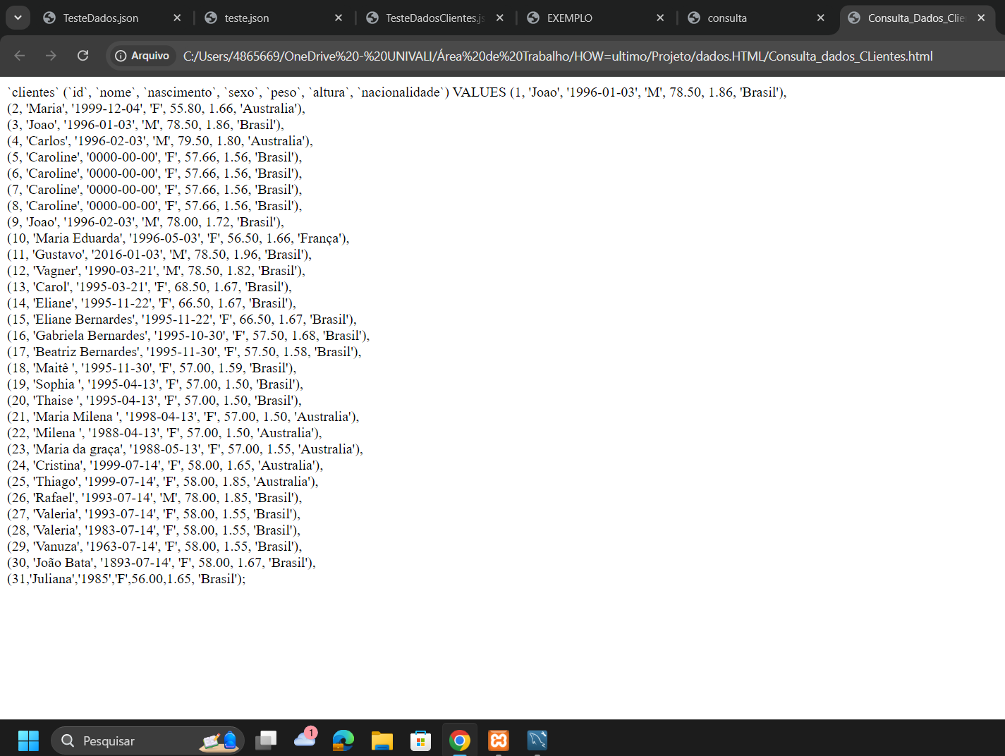 <p>TesteDados.json teste.json TesteDadosClientes.js EXEMPLO consulta Consulta_Dados_Clie C Arquivo (`id`, `sexo`, VALUES (1, 'Joao', '1996-01-03', 'M', 78.50, 1.86, 'Brasil'), (2, 'Maria', '1999-12-04', 'F', 55.80, 1.66, 'Australia'), (3, 'Joao', '1996-01-03', 'M', 78.50, 1.86, 'Brasil'), (4, 'Carlos', '1996-02-03', 'M', 79.50, 1.80, 'Australia'), (5, '0000-00-00', 'F', 57.66, 1.56, 'Brasil'), (6, 'Caroline', 'F', 57.66, 1.56, 'Brasil'), (7, 'Caroline', 'F', 57.66, 1.56, 'Brasil'), (8, 'Caroline', 'F', 57.66, 1.56, 'Brasil'), (9, 'Joao', '1996-02-03', 'M', 78.00, 1.72, 'Brasil'), (10, Eduarda', '1996-05-03', 'F', 56.50, 1.66, (11, 'Gustavo', 'M', 78.50, 1.96, 'Brasil'), (12, 'Vagner', '1990-03-21', 'M', 78.50, 1.82, 'Brasil'), (13, 'Carol', 'F', 68.50, 1.67, 'Brasil'), (14, 'Eliane', 'F', 66.50, 1.67, 'Brasil'), (15, Bernardes', '1995-11-22', 'F', 66.50, 1.67, (16, 'Gabriela Bernardes', '1995-10-30', 'F', 57.50, 1.68, 'Brasil'), (17, 'Beatriz Bernardes', 'F', 57.50, 1.58, 'Brasil'), (18, ', '1995-11-30', 'F', 57.00, 1.59, (19, 'F', 57.00, 1.50, (20, 'Thaise '1995-04-13', 'F', 57.00, 1.50, (21, 'Maria Milena ', 'F', 57.00, 1.50, (22, 'F', 57.00, 1.50, (23, 'Maria da graça', '1988-05-13', 'F', 57.00, 1.55, (24, 'F', 58.00, 1.65, (25, '1999-07-14', 'F', 58.00, 1.85, (26, 'Rafael', '1993-07-14', 'M', 78.00, 1.85, 'Brasil'), (27, 'Valeria', '1993-07-14', 'F', 58.00, 1.55, (28, 'Valeria', '1983-07-14', 'F', 58.00, 1.55, 'Brasil'), (29, 'Vanuza', '1963-07-14', 'F', 58.00, 1.55, 'Brasil'), (30, 'João Bata', '1893-07-14', 'F', 58.00, 1.67, 'Brasil'), 'Brasil');</p>