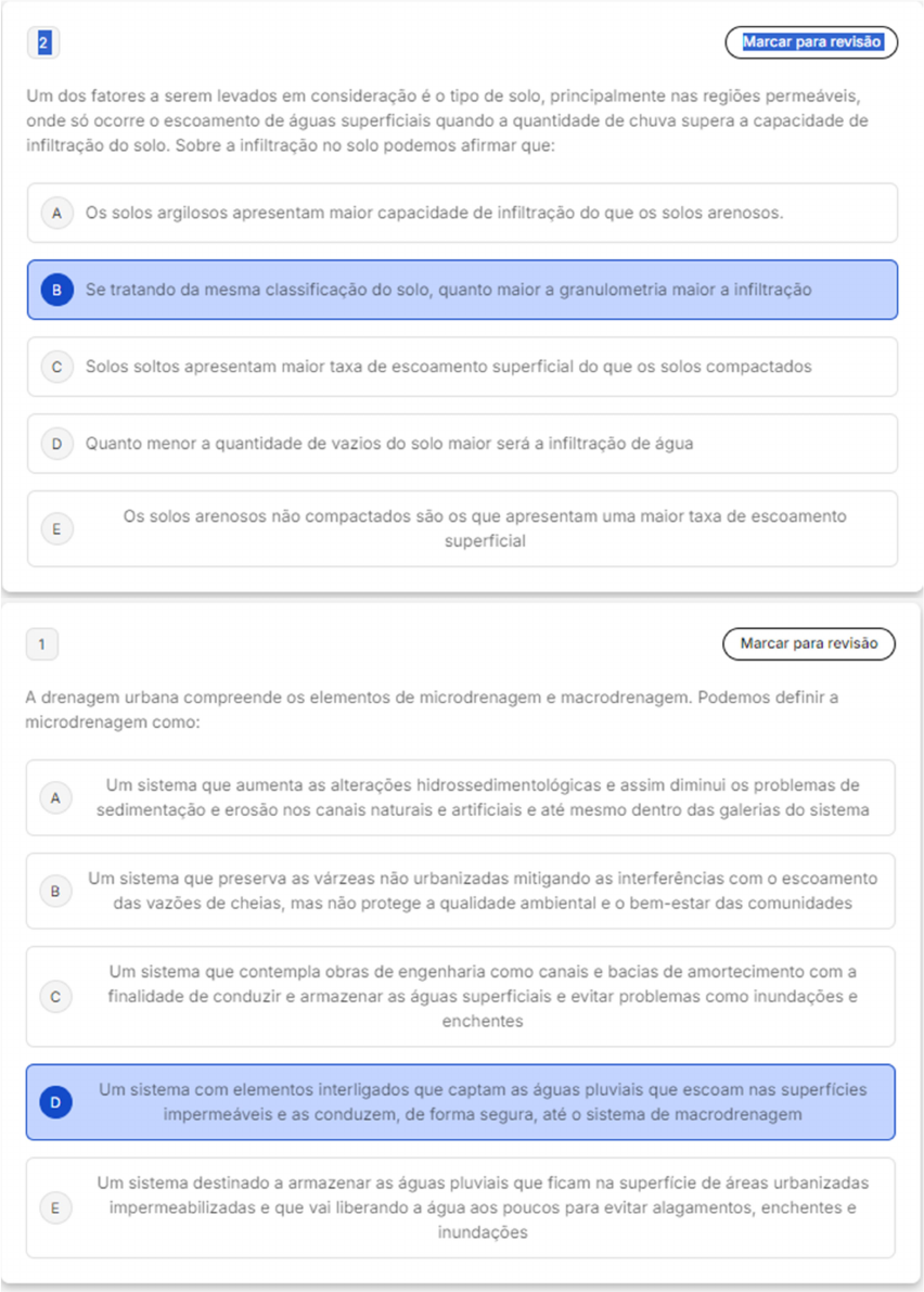 <p>2 Marcar para revisão Um dos fatores a serem levados em consideração é tipo de solo, principalmente nas regiões permeáveis, onde só ocorre escoamento de águas superficiais quando a quantidade de chuva supera a capacidade de infiltração do solo. Sobre a infiltração no solo podemos afirmar que: A Os solos argilosos apresentam maior capacidade de infiltração do que os solos arenosos. Se tratando da mesma classificação do solo, quanto maior a granulometria maior a infiltração Solos soltos apresentam maior taxa de escoamento superficial do que os solos compactados D Quanto menor a quantidade de vazios do solo maior será a infiltração de água Os solos arenosos não compactados são os que apresentam uma maior taxa de escoamento E superficial 1 Marcar para revisão A drenagem urbana compreende os elementos de microdrenagem e macrodrenagem. Podemos definir a microdrenagem como: Um sistema que aumenta as alterações e assim diminui os problemas de A sedimentação e erosão nos canais naturais e artificiais e até mesmo dentro das galerias do sistema Um sistema que preserva as várzeas não urbanizadas mitigando as interferências com O escoamento B das vazões de cheias, mas não protege a qualidade ambiental e bem-estar das comunidades Um sistema que contempla obras de engenharia como canais e bacias de amortecimento com a C finalidade de conduzir e armazenar as águas superficiais e evitar problemas como inundações e enchentes Um sistema com elementos interligados que captam as águas pluviais que escoam nas superfícies D impermeáveis e as conduzem, de forma segura, até sistema de macrodrenagem Um sistema destinado a armazenar as águas pluviais que ficam na de áreas urbanizadas E impermeabilizadas e que vai liberando a água aos poucos para evitar alagamentos, enchentes e inundações</p><p>3 Marcar para revisão A macrodrenagem é sistema de drenagem urbana formado por elementos com capacidade de receber a precipitação em volume superior ao captado e transportado pelos sistemas de Marque a opção abaixo que contenha apenas elementos de macrodrenagem: A Boca coletora, galeria e poço de visita B Sarjeta, meio fio e boca coletora C Canal natural, bacia de detenção e sarjeta D Canal natural, canal artificial e bacia de detenção. E Canal artificial, poço de visita e meio fio 4 Marcar para revisão A intensidade das chuvas pode ser determinada através das curvas IDF A Figura abaixo apresenta curvas IDF. Intensidade (mm/hr) 50 45 40 35 30 25 20 15 10 10 anos 5 anos anos 0 0 2 4 6 8 10 12 ano Duração (hr) Marque a opção que apresenta, aproximadamente, a intensidade em de uma curva de 4 horas de duração com retorno de 5 anos. A 3 B 6 9 D 12</p><p>5 Marcar para revisão As bacias ou reservatórios de amortecimento são muito utilizadas nos sistemas de drenagem urbana e têm como objetivo principal O armazenamento das águas superficiais que escoam durante de chuvas. Analise as afirmativas apresentadas abaixo a respeito delas: I. A água armazenada nas bacias de amortecimento podem ser utilizadas para irrigação, abastecimento de água público e industrial e para recreação. II. As bacias de amortecimento captam as águas superficiais das áreas urbanas. III. No reservatório de detenção a remoção de poluentes é maior do que nos reservatórios de retenção. IV. Os reservatórios em linha são construídos ao longo do curso Estão corretas: A Apenas as afirmativas I e IV. B Apenas as afirmativas II e III D Apenas as afirmativas II, III e IV E As afirmativas I, II, III e IV</p><p>6 Marcar para revisão Os diagramas de pressões de um clapotis em parede vertical são formados pelas oscilações de clapotis e são baseados na teoria da A figura abaixo ilustra diagrama de pressões de um clapotis em paramento vertical. Marque a opção que apresenta a definição correta dos elementos 1, 2 e 3, respectivamente: 1 C N.A G E Pressão Pressão máximo máximo Pressão Pressão 2 B D 3 3 3 3 h A Altura da onda, pressão intermediária, carga C Pressão variação da altura da onda, clapotis. D Altura da onda, pressão período da onda. E Crista do clapotis, pressão termos de carga.</p><p>7 Marcar para revisão Para iniciar a construção de uma obra portuária é necessário a apresentação de vários documentos, dentre eles memorial descritivo e de condicionantes Abaixo são apresentadas informações a respeito destes documentos: I. No memorial descritivo é desejável constar informações sobre os objetivos do projeto, estudo de soluções alternativas, a descrição da solução adotada e os dados do local. II. Ao memorial descritivo deve-se anexar os estudos sobre marés, correntes e ventos; estudos da geologia e geotécnica do solo de fundação e da dinâmica III. Os planos de segurança e saúde dos operários; plano de controle da qualidade; sistemas de gestão ambiental; estudos e cuidados arqueológicos e de gestão de também devem ser anexados ao memorial descritivo. IV. Nos condicionantes ambientais deve-se definir as frentes de trabalho em função da época de criação ou de passagem de espécies marinhas e aves em rota migratória. Assinale a alternativa que indica as afirmativas corretas. A I, II e III, apenas. B I, e IV, apenas. C II, III e IV, apenas. D I, III e IV, apenas. E I, II, III e IV.</p><p>8 Marcar para revisão Os canais de acesso portuário podem ser externos quando expostos à ação das ondas, e internos quando abrigados. A figura abaixo ilustra um canal de acesso de mão dupla. Marque a opção que apresenta a definição correta dos elementos 1, 2 e 3, respectivamente: 1 2 2 3 3 Eixo do canal A Faixa de manobra, distância de passagem, squat. C Squat, faixa de manobra, distância de passagem. D Distância de passagem, faixa de manobra e folga com margem. E Folga com a margem, faixa de manobra, distância de passagem.</p><p>9 Marcar para revisão As obras para a implantação de abrigos portuárias podem ter a finalid