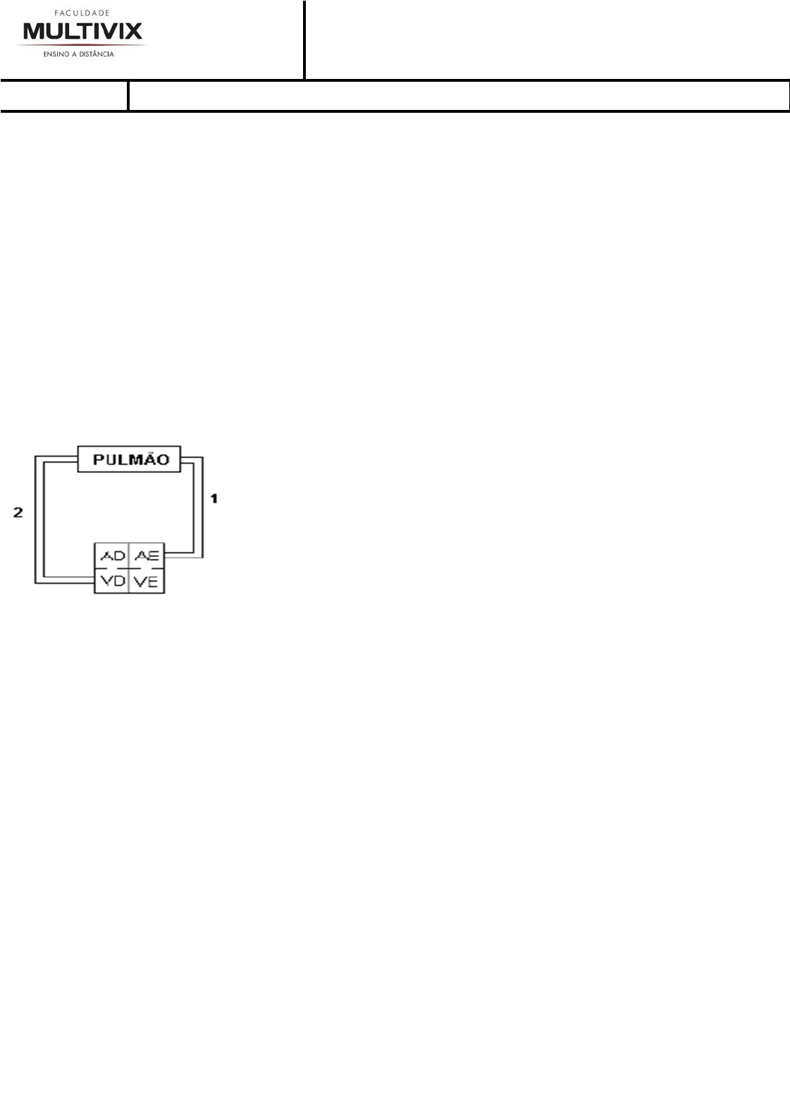 <p>ANATOMIA HUMANA</p><p>Prof.ª. GÉSSICA DE SÁ SOTO</p><p>ALUNO (A):</p><p>1- Assinale a alternativa que completa corretamente as lacunas do texto referente ao esquema abaixo, que representa a pequena circulação.</p><p>O vaso sanguíneo de número 1 chama-se ____________________________ e transporta sangue ______________. O vaso sanguíneo de número 2 chama-se __________________ e transporta sangue ________________.</p><p>a) artéria aorta - arterial - veia pulmonar - venoso</p><p>b) artéria pulmonar - arterial - veia pulmonar - venoso</p><p>c) veia cava - venoso - artéria aorta - arterial</p><p>d) veia pulmonar - arterial - artéria pulmonar - venoso</p><p>e) veia cava - venoso - artéria pulmonar – arterial</p><p>2- Sobre as artérias, é INCORRETO afirmar:</p><p>a) A artéria coronária alimenta o músculo cardíaco e lhe fornece sangue arterial, mesmo de seu lado direito.</p><p>b) Toda artéria conduz sangue arterial impulsionado pela contração cardíaca e direcionado pelas válvulas cardíacas.</p><p>c) A perda de elasticidade das artérias pode acarretar alterações na pressão mínima e máxima e sobrecarregar o coração.</p><p>d) É considerado fator favorecedor da aterosclerose o excesso de partículas LDL, que transportam grandes quantidades de colesterol no plasma sanguíneo.</p><p>3- Nas opções abaixo, estão relacionadas cavidades cardíacas e vasos sanguíneos.</p><p>Assinale aquela que reúne cavidades e vasos nos quais, o sangue encontrado é sempre sangue arterial.</p><p>a) ventrículo esquerdo, aorta e artéria pulmonar.</p><p>b) aurícula esquerda, veia pulmonar e aorta.</p><p>c) ventrículo direito, artéria pulmonar e aorta.</p><p>d) aurícula direita, veia cava e veia pulmonar.</p><p>e) ventrículo direito, veia pulmonar e artéria pulmonar.</p><p>4- O coração funciona como uma bomba. Nos mamíferos, o sangue com baixo teor de oxigênio é enviado aos pulmões. Por outro lado, o sangue oxigenado nos pulmões é mandado para os vários setores do organismo.</p><p>Assinale a opção correta entre as abaixo apresentadas:</p><p>a) O sangue que sai do ventrículo esquerdo é enviado aos pulmões para a oxigenação.</p><p>b) O átrio direito recebe sangue das veias cavas e o envia para o organismo.</p><p>c) As veias pulmonares levam o sangue oxigenado para o átrio esquerdo.</p><p>d) O ventrículo direito recebe o sangue oxigenado e o envia para o organismo.</p><p>e) A aorta sai do ventrículo direito e transporta sangue oxigenado.</p><p>5- Válvulas que impedem o refluxo da circulação podem existir:</p><p>a) apenas em artérias</p><p>b) apenas em veias</p><p>c) em artérias e vasos linfáticos</p><p>d) em veias e artérias</p><p>e) em veias e vasos linfáticos</p><p>6- No esquema abaixo é correto dizer que:</p><p>a) a estrutura 1 é a artéria aorta e conduz sangue arterial a partir do ventrículo direito.</p><p>b) ao nível da estrutura 9, o sangue perde CO2 e recebe O2, no fenômeno da hematose.</p><p>c) a estrutura 2 é a artéria pulmonar e traz sangue arterial dos pulmões para o coração.</p><p>d) a estrutura 4 faz parte da pequena circulação.</p><p>e) na estrutura 5 começa a grande circulação.</p><p>7- No coração humano, as válvulas tricúspide e mitral estão localizadas, respectivamente:</p><p>a) entre o átrio esquerdo e o ventrículo esquerdo e entre o átrio direito e o ventrículo direito</p><p>b) entre o átrio direito e o átrio esquerdo e entre o ventrículo direito e o ventrículo esquerdo</p><p>c) entre a artéria aorta e o ventrículo esquerdo e entre a artéria pulmonar e o ventrículo direito</p><p>d) entre o átrio direito e o ventrículo direito e entre o átrio esquerdo e o ventrículo esquerdo</p><p>e) entre o átrio direito e a veia cava superior e entre o átrio direito e a veia cava inferior.</p><p>8- "Por meio de I, o sangue II chega ao coração e sai deste para os tecidos por meio da III". No trecho acima, I, II e III, podem ser preenchidas, correta e respectivamente, por:</p><p>a) Artérias pulmonares, pobre em oxigênio e veia aorta.</p><p>b) Artérias pulmonares, rico em oxigênio e veia aorta.</p><p>c) Veias pulmonares, pobre em oxigênio e artéria aorta.</p><p>d) Veias pulmonares, rico em oxigênio e artéria aorta.</p><p>e) Artérias e veias, rico em oxigênio e veia aorta.</p><p>9- Analise as afirmações relacionadas ao coração humano e à circulação:</p><p>I. O coração apresenta internamente quatro cavidades, dois átrios que se comunicam entre si e dois ventrículos que também se comunicam entre si.</p><p>II. A valva esquerda do coração é a mitral ou bicúspide, e a direita é a tricúspide.</p><p>III. No lado esquerdo do coração circula unicamente sangue arterial.</p><p>IV. No átrio direito desembocam as veias pulmonares, e no esquerdo as veias cavas.</p><p>Estão corretas:</p><p>a) todas.</p><p>b) apenas II, III e IV.</p><p>c) apenas II e III.</p><p>d) apenas I, II e III.</p><p>e) apenas I e IV.</p><p>10- Em relação ao sistema circulatório humano, são feitas as seguintes afirmativas:</p><p>I- No coração, o sangue que penetra no átrio esquerdo é arterial e chega através das veias pulmonares.</p><p>II- O coração envia sangue venoso aos pulmões através das artérias pulmonares, que saem do ventrículo esquerdo.</p><p>III- Através da artéria aorta, o sangue chega ao ventrículo esquerdo de onde é distribuído para todo o corpo.</p><p>Indique a alternativa correta:</p><p>a) todas são verdadeiras.</p><p>b) somente I e II são verdadeiras.</p><p>c) somente II e III são verdadeiras.</p><p>d) somente I é verdadeira.</p><p>e) somente II é verdadeira.</p><p>11- Em relação à circulação humana, é incorreto afirmar:</p><p>a) Todo vaso que sai do coração é artéria.</p><p>b) Todo vaso que chega ao coração é veia.</p><p>c) Todo sangue que chega ao coração é sangue venoso.</p><p>d) O sangue rico em oxigênio é o arterial.</p><p>e) O sangue venoso passa do átrio dir