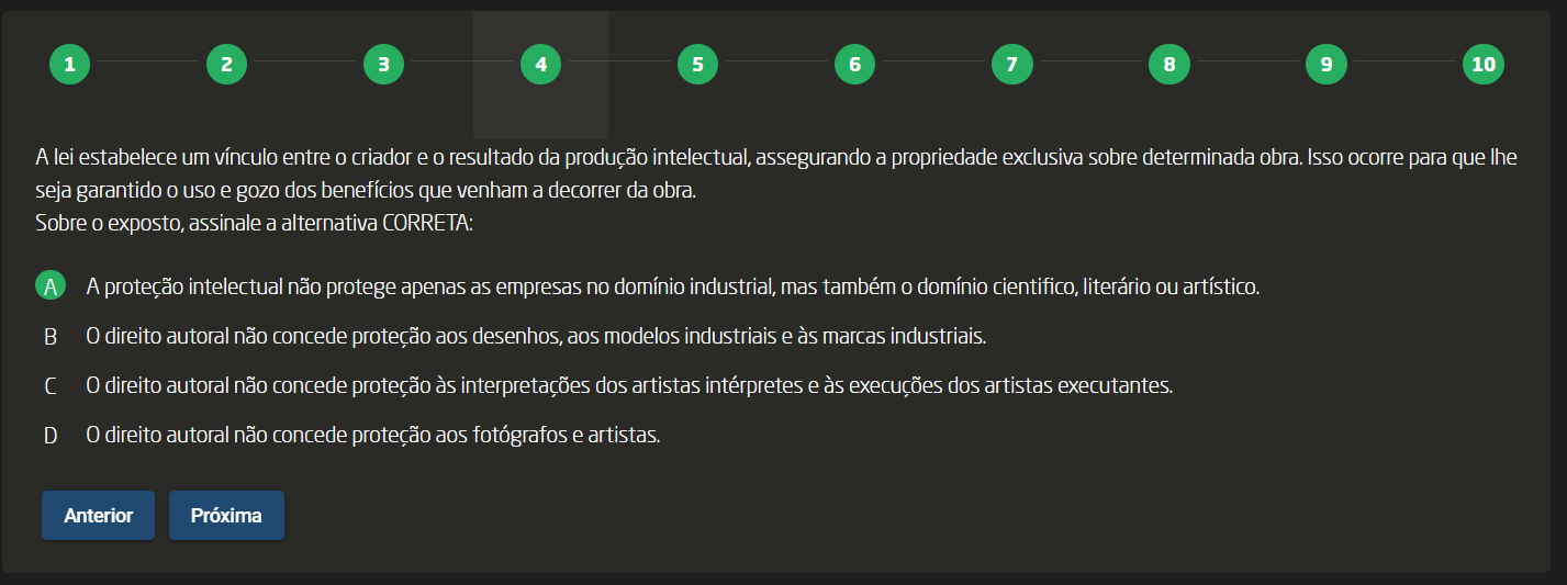 <p>1 3 4 5 6 7 8 9 10 A lei estabelece um vínculo entre criador e resultado da produção intelectual, assegurando a propriedade exclusiva sobre determinada obra. Isso ocorre para que lhe seja garantido uso e gozo dos benefícios que venham a decorrer da obra. Sobre exposto, assinale a alternativa CORRETA: A A proteção intelectual não protege apenas as empresas no domínio industrial, mas também domínio cientifico, literário ou artístico. B direito autoral não concede proteção aos desenhos, aos modelos industriais e às marcas industriais. direito autoral não concede proteção às interpretações dos artistas intérpretes e às execuções dos artistas executantes. D 0 direito autoral não concede proteção aos fotógrafos e artistas. Anterior Próxima</p>