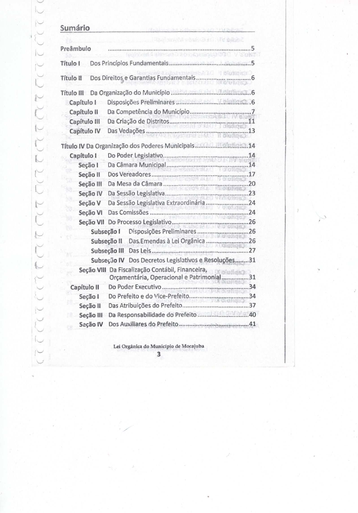 <p>Sumário Preâmbulo 5 Título I Dos Princípios Fundamentais 5 Título Dos Direitos e Garantias Fundamentais 6 Título III Da Organização do Município 6 Capítulo I Disposições Preliminares 6 Capítulo II Da Competência do Município 7 Capítulo III Da Criação de Distritos 11 Capítulo IV Das Vedações 13 Título IV Da Organização dos Poderes Municipais 14 Capítulo I Do Poder Legislativo 14 Seção I Da Câmara Municipal 14 Seção Dos Vereadores 17 Seção III Da Mesa da Câmara 20 Seção IV Da Sessão Legislativa 23 Seção V Da Sessão Legislativa Extraordinária 24 Seção VI Das Comissões 24 Seção VII Do Processo Legislativo 26 Subseção I Disposições Preliminares 26 Subseção Das.Emendas à Lei Orgânica 26 Subseção III Das Leis 27 Subseção IV Dos Decretos Legislativos e Resoluções 31 Seção VIII Da Fiscalização Contábil, Financeira, Orçamentária, Operacional e Patrimonial 31 Capítulo II Do Poder Executivo 34 Seção I Do Prefeito e do Vice-Prefeito 34 Seção II Das Atribuições do Prefeito 37 Seção III Da Responsabilidade do Prefeito 40 Seção IV Dos Auxiliares do Prefeito 41 Lei Orgânica do Município de Mocajuba 3</p><p>Seção V Do Conselho Municipal 42 Seção VI Da Guarda Municipal 43 Título V Da Organização do Governo Municipal 44 Capítulo I Do Planejamento Municipal 44 Capítulo II Da Administração Municipal 44 Capítulo III Das Obras e Serviços Municipais 45 Capítulo IV Dos Bens Municipais 47 Capítulo V Dos Servidores Municipais 48 Título Da Administração Financeira 53 Capítulo I Dos Tributos Municipais 53 Capítulo Das Limitações do Poder de Tributar 54 Capítulo III Do Orçamento 55 Título VII Da Ordem Econômica e Financeira 59 Capítulo I Da Atividade Econômica 59 Capítulo II Da Política Urbana 62 Capítulo III Da Política Rural 64 Capítulo IV Da Política de Desenvolvimento Rural 64 Capítulo V Da Política Agrícola e Fundiária 65 Capítulo VI Dos Transportes 68 Capítulo Da Saúde e do Saneamento 69 Capítulo VIII Da Educação 72 Capítulo IX Da Família, Da Criança, Do Adolescente, Do Idoso e Do Deficiente 74 Capítulo X Da Mulher 74 Capítulo XI Da Cultura 75 Capítulo XII Do Desporto 77 Capítulo XIII Do Meio Ambiente 78 Capítulo XIV Da Assistência Social 81 Título VIII Das Disposições Gerais 81 Ato das Disposições Constitucionais Transitórias 82 Lei Orgânica do Município de Mocajuba 4</p><p>PREÂMBULO povo de Mocajuba, por seus representantes, reunidos em Assem- bleia Municipal Constituinte, com voltado para a Democracia, re- jeitando todas as formas de discriminação e assegurando exercício dos direitos sociais e a liberdade, a segurança, bem-estar, desen- volvimento, a igualdade e a justiça como valores supremos de uma socieda- de fraterna e solidária dentro de uma ordem econômica injusta e invoca a bênção e a proteção de Deus e promulga a seguinte Lei Orgânica do Município de Mocajuba, esperando que ela seja instrumento de puz e progresso pard o povo mocajubense. TÍTULO DOS PRINCÍPIOS FUNDAMENTAIS Art. 1° - o Município de Mocajuba, Estado do Pará, integra, como pessoa jurídica de direito público interno, no pleno uso de sua autonomia política, administrativa e financeira, a República Federativa do Brasil, como participante do Estado democrático de direito, comprometendo-se a res- valorizar e promover seus fundamentos básicos: I - a soberania; - - a cidadania; III a dignidade da pessoa humana; IV - os valores sociais do trabalho e da livre iniciativa; V - o pluralismo político. Parágrafo único. Todo poder emana do povo, que o exerce por meio de representantes eleitos, nos termos das Constituições da República, do Estado e deste Município. Art. 2° Fica instituído como data cívica, o Dia do Município, comemo- rado no dia seis de julho. Art. 3° - Constituem, em cooperação com a União e o Estado, objeti- vos fundamentais do Município: - constituir uma sociedade livre, justa e solidária; II - garantir o desenvolvimento municipal, estadual e nacional; Lei Orgânica do Município de Mocajuba 5</p><p>III - erradicar a pobreza e a marginalização e reduzir as desigualdades sociais; IV - promover o bem de todos, sem preconceitos de origem, raça, sexo, cor, idade e quaisquer outras formas de discriminação; V garantir a efetivação dos direitos humanos, individuais e sociais. Parágrafo único. o Município buscará a integração e a cooperação com a União, os Estados e os demais municípios para a consecução dos seus objetivos fundamentais. TÍTULO DOS DIREITOS E GARANTIAS FUNDAMENTAIS Art. - A dignidade do homem é intangível. Respeitá-la e protegê-la é obrigação de todo poder público. § 1° Um direito fundamental em caso algum pode ser violado. § Os direitos fundamentais constituem direito de aplicação ime- diata e direta. Art. 5° Todos são iguais perante a Lei, sem distinção de qualquer na- tureza, garantindo-se aos brasileiros e aos estrangeiros residentes no Mu- nicípio, a inviolabilidade do direito à vida, à liberdade, à igualdade, à segu- rança, à propriedade, nos termos do artigo da Constituição da República Federativa do Brasil. Art. 6° - São direitos sociais: o direito à educação, ao trabalho, à cultu- ra, à moradia, à assistência, à proteção, à maternidade, à gestante, à infân- cia, ao ideso e ao deficiente físico, ao lazer, ao meio ambiente, à saúde e à segurança que significam uma existência digna. TÍTULO III DA ORGANIZAÇÃO DO MUNICÍPIO CAPÍTULO DISPOSIÇÕES PRELIMINARES Art. o Município reger-se-á por esta Lei Orgânica, respeitando os princípios e preceitos estabelecidos na Constituição Federal e Estadual. Art. 8° São poderes do Município, independentes e harmônicos en- tre si, o Legislativo e Executivo. Lei Orgânica do Município de Mocajuba 6</p><p>É vedada a delegação de atribuições entre os § - o cidadão investido na função de um destes, não ode exercer a