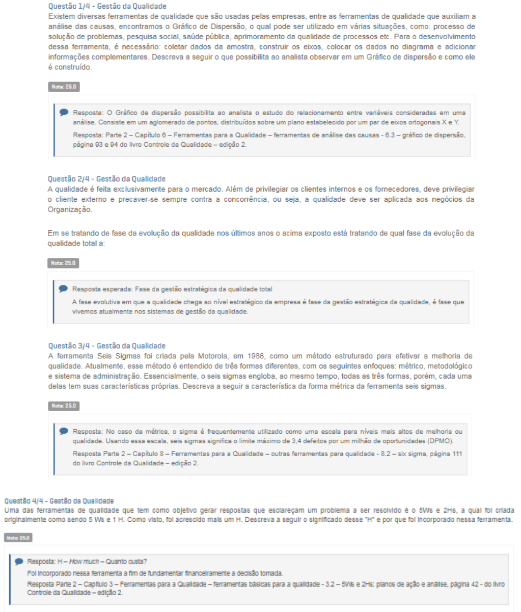 <p>Questão 1/4 Gestão da Qualidade Existem diversas ferramentas de qualidade que são usadas pelas empresas, entre as ferramentas de qualidade que auxiliam a análise das causas, encontramos Gráfico de qual pode ser utilizado em várias situações, como: processo de solução de problemas, pesquisa saúde aprimoramento da qualidade de processos etc. Para desenvolvimento dessa ferramenta, é coletar dados da construir os colocar os dados no diagrama e adicionar informações Descreva a seguir que possibilita ao analista observar em um Gráfico de dispersão e como ele é Resposta: Gráfico de dispersão analists estudo do relacionamento entre variáveis consideradas em uma Consiste em um aglomerado de distribuídos sobre um plano estabelecido por um par de eixos ortogonais X e Resposta: Parte 2 Capítulo 6 Ferramentas para a Qualidade ferramentas de análise das causas - 6.3 gráfico de página 93 e 94 do livro Controle da Qualidade edição 2. Questão 2/4 Gestão da Qualidade A qualidade é feita exclusivamente para Além de privilegiar os clientes internos e os deve privilegiar cliente externo e precaver-se sempre contra a ou seja, a qualidade deve ser aplicada aos negócios da Em se tratando de fase da evolução da qualidade nos anos acima exposto está tratando de qual fase da evolução da qualidade total a: 25.0 Resposta esperada: Fase da gestão estratégica da qualidade total A fase evolutiva em que qualidade chega nível estratégico empresa é fase da gestão estratégica da é fase que vivemos atualmente nos sistemas de gestão Questão 3/4 Gestão da Qualidade A ferramenta Seis Sigmas foi criada pela Motorola em como um método estruturado para efetivar a melhoria de Atualmente, esse método é entendido de três formas com os seguintes enfoques: metodológico e sistema de Essencialmente, o seis sigmas engloba, ao mesmo tempo, todas as três cada uma delas tem suas características Descreva a seguir a característica da forma métrica da ferramenta seis 25.0 Resposta: No caso da é frequentemente utilizado como uma para níveis mais altos de melhoria ou Usando essa seis sigmas significa limite máximo de 3.4 defeitos por um milhão de oportunidades (DPMO). Resposta Parte 2 Capítulo 8 Ferramentas para Qualidade outras ferramentas para qualidade 8.2 six página 111 do livro Controle da Qualidade edição 2. Questão 4/4 Gestão de Qualidade Uma das ferramentas de qualidade que tem como objetivo gerar respostas que esclareçam um problema a ser resolvido e 0 5Ws e a qual fol criada originalmente como sendo 5 Ws e 1 H. Como acrescido um H. Descreva a seguir 0 significado desse "H" e por que incorporado nessa 25.0 H How much - Quanto custa? Fol incorporado nessa ferramenta a fim de fundamentar financeiramente a decisão Resposta Parte 2 Capitulo 3 Ferramentas para a Qualidade ferramentas básicas para a qualidade 3.2 e de ação e página 42 do Controle da Qualidade edição 2.</p>