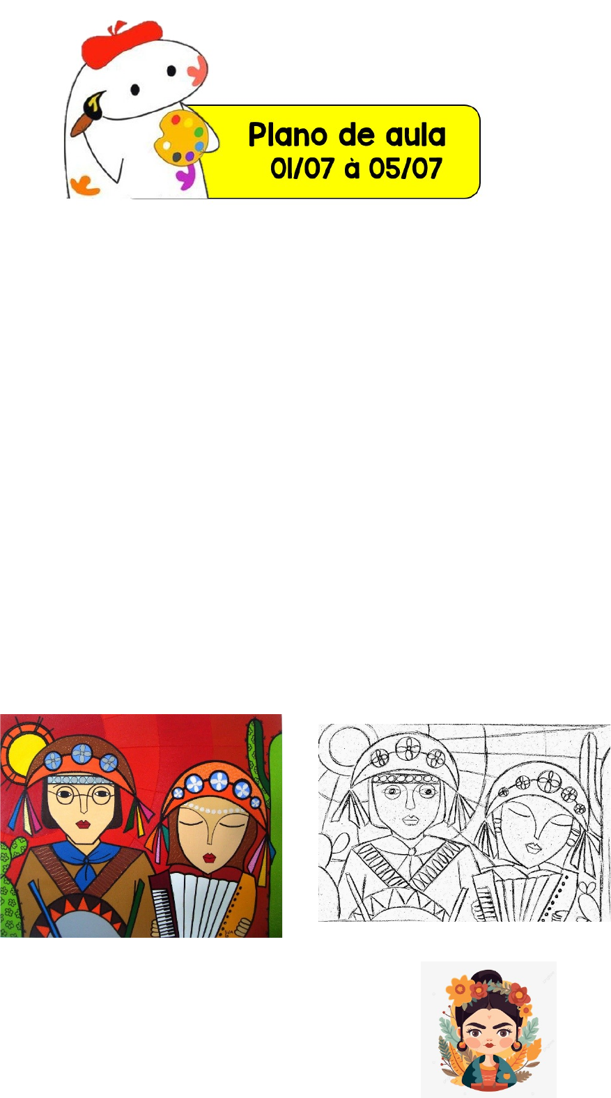 <p>TURMA: 1°ano ao 5° ano</p><p>Unidade temática: Artes visuais</p><p>Objetos de conhecimento: Matrizes estéticas e culturais - Cangaço</p><p>Conteúdo: Expressões artísticas no espaço urbano (elementos da festa junina nordestina)</p><p>Habilidades: (EF15AR03) Reconhecer e analisar a influência de distintas matrizes estéticas e culturais das artes visuais nas manifestações artísticas das culturas locais, regionais e nacionais.</p><p>Objetivos: Conhecer as diversas expressões artísticas em artes visuais encontradas no seu dia-a-dia, para reconhecer a importância da arte como um meio de comunicação, de transformação social e de acesso à cultura, respeitando as diferenças e o diálogo de distintas culturas, etnias e línguas percebendo ser um importante exercício para a cidadania, como também o resgate social para exercer a cidadania através de ações concretas, solidárias e participativas em beneficio a melhoria da convivência social da turma.</p><p>Metodologia: Apresentação da referência do Cangaço nordestino e como essa cultura interfere na tradicional festa junina. Disponibilização da foto de Lampião e Maria Bonita como os percussores desse movimento. Proposta de pintura desses símbolos realizando a releitura da obra de Romero Brito.</p><p>image1.png</p><p>image2.jpeg</p><p>image3.jpeg</p><p>image4.png</p>