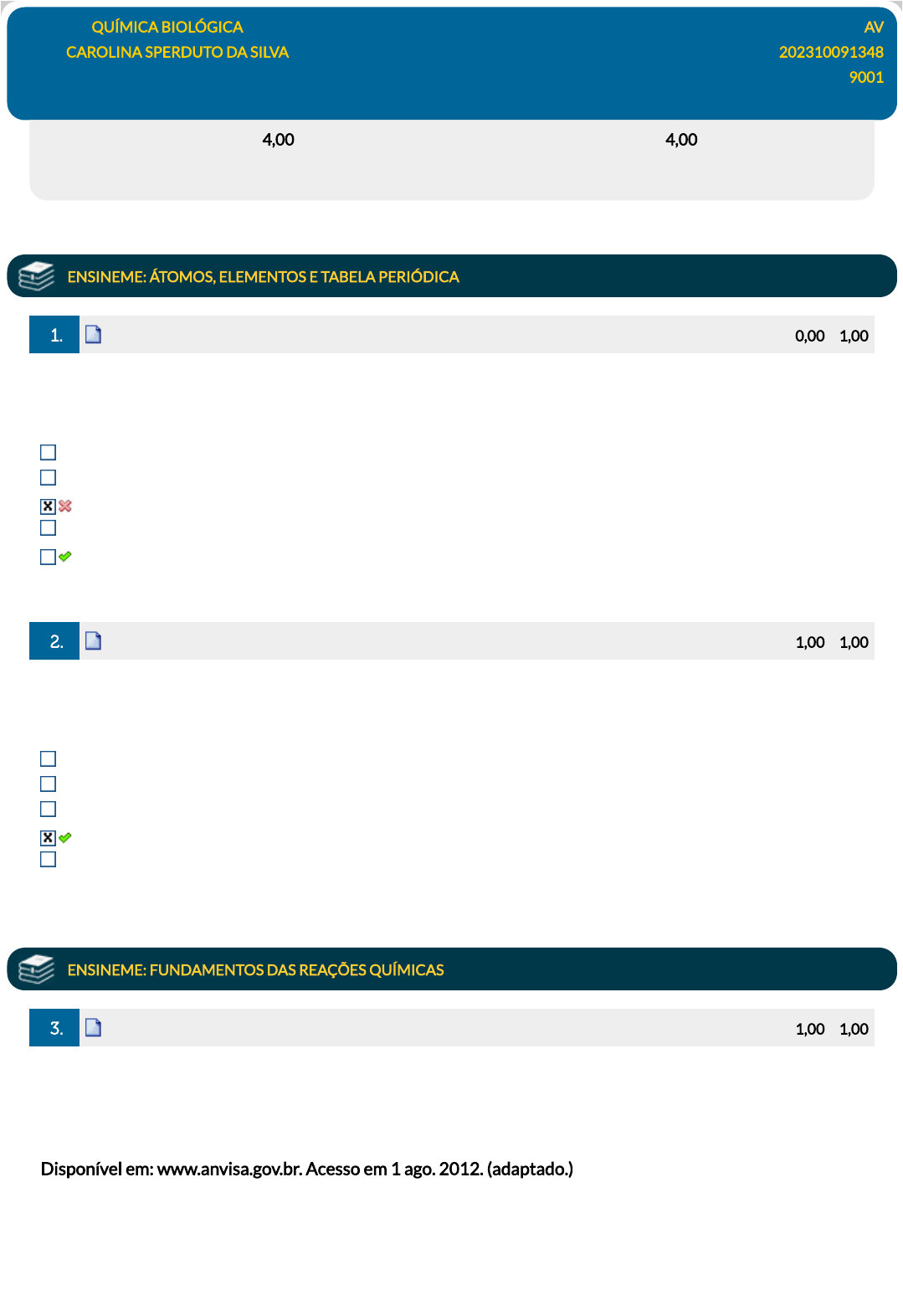 <p>Disciplina: QUÍMICA BIOLÓGICA AV</p><p>Aluno: CAROLINA SPERDUTO DA SILVA 202310091348</p><p>Turma: 9001</p><p>DGT0942_AV_202310091348 (AG) 23/10/2023 18:31:08 (F)</p><p>Avaliação: 4,00 pts Nota SIA: 4,00 pts</p><p>Dispositivo liberado pela Matrícula 202310091348 com o token 118212 em 23/10/2023 18:21:35.</p><p>ENSINEME: ÁTOMOS, ELEMENTOS E TABELA PERIÓDICA</p><p>1. Ref.: 7792581 Pontos: 0,00 / 1,00</p><p>(FAVIP PE/2012) O cálcio é o elemento da rigidez e da construção: é o cátion dos ossos do nosso esqueleto, das</p><p>conchas dos moluscos, do concreto, da argamassa e da pedra calcária das nossas construções. Sabendo que o átomo</p><p>de cálcio tem número atômico 20 e número de massa 40, é correto a�rmar que o cátion Ca2+ tem:</p><p>18 nêutrons</p><p>Con�guração eletrônica igual à do íon K + (Z = 19).</p><p>18 prótons</p><p>20 elétrons</p><p>Con�guração eletrônica 1s 2 2s 2 2p 6 3s 2 3p 6 4s 2.</p><p>2. Ref.: 4119302 Pontos: 1,00 / 1,00</p><p>Um átomo Y, com número de massa igual a 128, é isótopo dos átomos Z e W, cujos números atômicos são</p><p>respectivamente, 4X + 12 e 2X + 32. Assim, o número atômico e o número de neutros do átomo Y são</p><p>respectivamente:</p><p>76 e 10.</p><p>10 e 128.</p><p>10 e 52.</p><p>76 e 52.</p><p>128 e 52.</p><p>ENSINEME: FUNDAMENTOS DAS REAÇÕES QUÍMICAS</p><p>3. Ref.: 4020292 Pontos: 1,00 / 1,00</p><p>O brasileiro consome em média 500 miligramas de cálcio por dia, quando a quantidade recomendada é o</p><p>dobro. Uma alimentação balanceada é a melhor decisão para evitar problemas no futuro, como a</p><p>osteoporose, uma doença que atinge os ossos. Ela se caracteriza pela diminuição substancial de massa óssea,</p><p>tornando os ossos frágeis e mais suscetíveis a fraturas.</p><p>Disponível em: www.anvisa.gov.br. Acesso em 1 ago. 2012. (adaptado.)</p><p>Considerando-se o valor de para a constante de Avogadro e a massa molar do cálcio igual a</p><p>40 g/mol, qual a quantidade mínima diária de átomos de cálcio a ser ingerida para que uma pessoa supra suas</p><p>necessidades?</p><p>6 × 1023 mol−1</p><p>javascript:alert('C%C3%B3digo da quest%C3%A3o: 7792581.');</p><p>javascript:alert('C%C3%B3digo da quest%C3%A3o: 7792581.');</p><p>javascript:alert('C%C3%B3digo da quest%C3%A3o: 4119302.');</p><p>javascript:alert('C%C3%B3digo da quest%C3%A3o: 4119302.');</p><p>javascript:alert('C%C3%B3digo da quest%C3%A3o: 4020292.');</p><p>javascript:alert('C%C3%B3digo da quest%C3%A3o: 4020292.');</p><p>4. Ref.: 4020297 Pontos: 0,00 / 1,00</p><p>Os calcários são rochas sedimentares que, na maioria das vezes, resultam da precipitação de carbonato de</p><p>cálcio na forma de bicarbonatos. Podem ser encontrados no mar, em rios, lagos ou no subsolo (cavernas).</p><p>Eles contêm minerais com quantidades acima de 30% de carbonato de cálcio (aragonita ou calcita). Quando</p><p>o mineral predominante é a dolomita (CaMg{CO } ou CaCO .MgCO ), a rocha calcária é denominada</p><p>calcário dolomítico. A calcite (CaCO ) é um mineral que se pode formar a partir de sedimentos químicos,</p><p>nomeadamente íons de cálcio e bicarbonato, como segue:</p><p>cálcio + bicarbonato → CaCO (calcite) + H O (água) + CO</p><p>O giz, que é calcário poroso de coloração branca formado pela precipitação de carbonato de cálcio com</p><p>microrganismos e a dolomita, que é um mineral de carbonato de cálcio e magnésio. Os principais usos do</p><p>calcário são: produção de cimento Portland, produção de cal (CaO), correção do pH do solo na agricultura,</p><p>fundente em metalurgia, como pedra ornamental. O óxido de cálcio, cal virgem, é obtido por meio do</p><p>aquecimento do carbonato de cálcio (calcário), conforme reação a seguir.</p><p>CaCO → CaO + O</p><p>Em contato com a água, o óxido de cálcio forma hidróxido de cálcio, de acordo com a reação:</p><p>CaO + H O → Ca(OH)</p><p>Considere que uma amostra de 50 g de calcário contenha 10 g de carbonato de cálcio, que a obtenção do</p><p>óxido de cálcio é de 50% do carbonato de cálcio e que todo óxido de cálcio se transforma em hidróxido de</p><p>cálcio. Considere, ainda, os dados:</p><p>O (A = 16), Ca (A = 40), H (A = 1), C (A = 12)</p><p>Com base nessas informações, caso uma indústria de transformação necessite da fabricação de 740</p><p>toneladas de hidróxido de cálcio, quantas toneladas do calcário serão necessárias para essa produção?</p><p>1000</p><p>100</p><p>2000</p><p>10000</p><p>560</p><p>ENSINEME: INTRODUÇÃO À QUÍMICA</p><p>5. Ref.: 4020287 Pontos: 0,00 / 1,00</p><p>Muitas substâncias consideradas tóxicas têm aplicações terapêuticas quando utilizadas em mínimas doses.</p><p>Exemplo dessa propriedade é o �úor. Embora considerado muito venenoso, é um bom fármaco contra as</p><p>cáries. Para Paracelsus (1493-1541) "a dose certa diferencia o veneno do remédio". De acordo com o</p><p>Ministério da Saúde, o limite máximo de �úor na água para consumo humano é de 1,5 mg/L.</p><p>7, 5.1023</p><p>1, 5.1025</p><p>1, 5.1022</p><p>4, 8.1025</p><p>7, 5.1021</p><p>3 2 3 3</p><p>3</p><p>3 2 2</p><p>3 2</p><p>2 2</p><p>javascript:alert('C%C3%B3digo da quest%C3%A3o: 4020297.');</p><p>javascript:alert('C%C3%B3digo da quest%C3%A3o: 4020297.');</p><p>javascript:alert('C%C3%B3digo da quest%C3%A3o: 4020287.');</p><p>javascript:alert('C%C3%B3digo da quest%C3%A3o: 4020287.');</p><p>Quantos mililitros de água seriam necessários para preparar uma solução, de acordo com o limite máximo</p><p>permitido, contendo 400 μg de �úor?</p><p>2,7x 10-2.</p><p>2,7 x 1-1.</p><p>2,7 x 100.</p><p>2,7 x 101.</p><p>2,7 x 102.</p><p>6. Ref.: 4023288 Pontos: 0,00 / 1,00</p><p>A alquimia - mistura de arte, ciência e magia precursora da química ¿ elencou como objetivos a busca do</p><p>elixir da longa vida e da pedra �losofal que permitiria a transformação de metais comuns em ouro.</p><p>Inobstante o ins