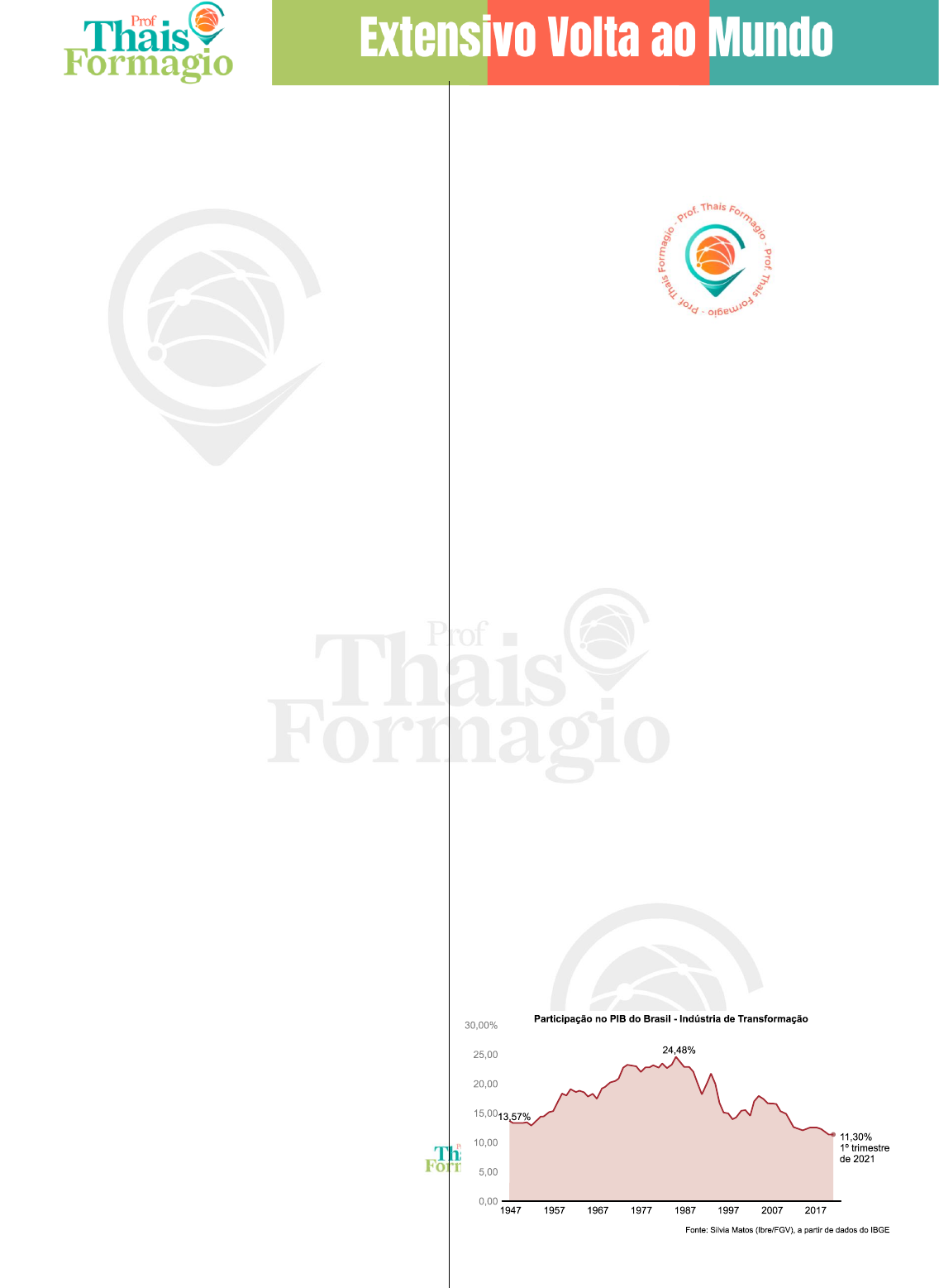 <p>www.profthaisformagio.com.br</p><p>Página 1 de 7 Aviso Legal: Os materiais e conteúdos disponibilizados pela Profª Thais Formagio são protegidos por direitos de propriedade intelectual (Lei nº 9.610/1998). É vedada a utilização</p><p>para fins comerciais, bem como a cessão dos materiais a terceiros, a título gratuito ou não, sob pena de responsabilização civil e criminal nos termos da legislação aplicável.</p><p>Lista 11B- Indústria brasileira</p><p>1. (Unicamp 2020) Até hoje, a formação das classes médias esteve</p><p>ligada à expansão da indústria e à elevação de seus níveis de</p><p>produtividade. Historicamente, a indústria permitiu estruturar a</p><p>representação política e sindical das categorias mais desfavorecidas</p><p>da população em torno dos interesses que afetavam as grandes</p><p>massas de trabalhadores. Já no contexto atual, marcado por um</p><p>mundo menos industrializado e orientado para uma economia em que</p><p>os serviços tendem a ser mais fragmentados e frequentemente</p><p>artesanais ou informais, os interesses comuns dos trabalhadores são</p><p>evidentemente muito mais difíceis de emergir. Considerando este</p><p>quadro, a desindustrialização prematura dos países do Hemisfério</p><p>Sul (com exceção do Leste Asiático) não é muito favorável a uma</p><p>consolidação democrática.</p><p>(Adaptado de Pierre Veltz, La société hyper-industrielle. Le nouveau</p><p>capitalisme productif. Paris: Éditions du Seuil, 2017, p. 16.)</p><p>Com base no texto e em seus conhecimentos, responda às questões.</p><p>a) Que decreto-lei garantiu os principais direitos trabalhistas na Era</p><p>Vargas e por que a menor presença de uma classe trabalhadora</p><p>na indústria enfraquece os processos democráticos na</p><p>contemporaneidade?</p><p>b) Indique e explique qual foi a principal mudança estrutural ocorrida</p><p>na economia brasileira nas duas últimas décadas.</p><p>2. (Unesp 2023) O Polo Industrial de Camaçari (BA) transformou a</p><p>economia baiana, que antes tinha uma base econômica</p><p>essencialmente agrária. Localizado na região metropolitana de</p><p>Salvador, é um dos maiores complexos industriais integrados do</p><p>Hemisfério Sul e desempenha papel importante no setor produtivo</p><p>desse estado.</p><p>(https://g1.globo.com, 12.10.2019. Adaptado.)</p><p>A implantação do Polo Industrial de Camaçari está inserida no</p><p>contexto</p><p>a) da desconcentração industrial, com o deslocamento de</p><p>investimentos produtivos para áreas menos desenvolvidas do</p><p>país.</p><p>b) das zonas francas, com a redução de impostos de importação e</p><p>exportação para garantir a competição de preços.</p><p>c) do Programa de Aceleração do Crescimento, com políticas</p><p>econômicas focadas em infraestrutura para melhorar as rodovias.</p><p>d) da política de substituição de importações, com investimentos na</p><p>produção de bens de capital à população urbana.</p><p>e) da Segunda Revolução Industrial, com investimentos em pesquisa</p><p>e tecnologia para solucionar a obsolescência programada.</p><p>3. (Uem 2023) Sobre a distribuição espacial das atividades</p><p>econômicas no Brasil, assinale o que for correto.</p><p>01) Investimentos em infraestrutura de energia, em transportes e em</p><p>telecomunicações favoreceram a desconcentração espacial da</p><p>indústria no país.</p><p>02) Do início do século XX até a década de 1930, a Região Sudeste</p><p>foi responsável por mais da metade do valor da produção</p><p>industrial nacional.</p><p>04) A criação da Superintendência da Zona Franca de Manaus</p><p>(Suframa) reforçou a concentração espacial do parque industrial</p><p>nacional.</p><p>08) A distribuição espacial das atividades comerciais e de serviços</p><p>pelo território apresenta um padrão oposto ao da distribuição da</p><p>população.</p><p>16) O comércio atacadista de alimentos está espacialmente</p><p>concentrado nos grandes e médios centros urbanos do país.</p><p>4. (Albert Einstein - Medicina 2023) Podemos extrair da expressão</p><p>“guerra fiscal” a disputa praticada pelos entes federativos, por meio</p><p>de ações concorrenciais extremas e não cooperativas no que diz</p><p>respeito à gestão de suas políticas públicas, de modo a favorecer</p><p>empresas interessadas em investir ou transferir investimentos para</p><p>suas bases territoriais. Na “guerra fiscal”, os entes federativos</p><p>concedem benefícios fiscais, financeiros e de infraestrutura às</p><p>empresas.</p><p>(https://ipojur.com.br. Adaptado.)</p><p>Considerando o excerto, a expressão “guerra fiscal” estimula</p><p>a) o avanço das privatizações.</p><p>b) o processo de gentrificação.</p><p>c) a industrialização tardia.</p><p>d) a centralização da rede urbana.</p><p>e) a desconcentração industrial.</p><p>5. (Pucpr 2023) Observe o gráfico abaixo e responda a seguir.</p><p>www.profthaisformagio.com.br</p><p>Página 2 de 7 Aviso Legal: Os materiais e conteúdos disponibilizados pela Profª Thais Formagio são protegidos por direitos de propriedade intelectual (Lei nº 9.610/1998). É vedada a utilização</p><p>para fins comerciais, bem como a cessão dos materiais a terceiros, a título gratuito ou não, sob pena de responsabilização civil e criminal nos termos da legislação aplicável.</p><p>Um conceito adequado para o fenômeno evidenciado no gráfico</p><p>refere-se à</p><p>a) Metropolização.</p><p>b) Urbanização.</p><p>c) Migração pendular.</p><p>d) Ruralização.</p><p>e) Desindustrialização.</p><p>6. (Uea 2023) Analise a tabela que destaca as cinco primeiras</p><p>posições ocupadas pelos estados brasileiros com relação à produção</p><p>do setor industrial.</p><p>A importância da indústria para os estados</p><p>Posiçã</p><p>o</p><p>Com mais</p><p>estabelecimento</p><p>s</p><p>industriais em</p><p>2020</p><p>Maior</p><p>