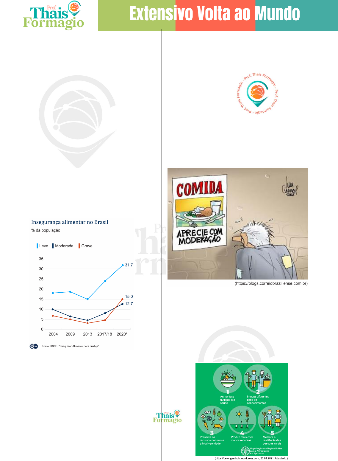 <p>www.profthaisformagio.com.br</p><p>Página 1 de 6 Aviso Legal: Os materiais e conteúdos disponibilizados pela Profª Thais Formagio são protegidos por direitos de propriedade intelectual (Lei nº 9.610/1998). É vedada a utilização</p><p>para fins comerciais, bem como a cessão dos materiais a terceiros, a título gratuito ou não, sob pena de responsabilização civil e criminal nos termos da legislação aplicável.</p><p>Lista 13B- Agricultura: Sistemas agrícolas</p><p>1. (Unicamp 2023) “Acontece, porém, que a verdade sobre a fome</p><p>incomoda os governos e fere as suscetibilidades patrióticas e, por</p><p>isso mesmo, são frequentemente vedadas ao grande público, pelas</p><p>respectivas censuras políticas. (...) Será a calamidade da fome um</p><p>fenômeno natural, inerente à própria vida, uma contingência</p><p>irremovível como a morte? Ou será a fome uma praga social criada</p><p>pelo próprio homem?”</p><p>(CASTRO, Josué de. Geopolítica da Fome. Rio de Janeiro: Casa do</p><p>Estudante do Brasil, 2ª ed., 1953.)</p><p>“Vivemos em um país que produz muito alimento e tem muita gente</p><p>passando fome. Para além do escândalo ético, isso é uma aberração</p><p>em termos de organização econômica e social. No plano moral, beira</p><p>o criminoso: são 33 milhões de pessoas famintas, enquanto</p><p>exportamos e produzimos mais de três quilos, só de grãos, por</p><p>pessoa por dia.”</p><p>(DOWBOR, Ladislau. Fome, uma decisão política e corporativa. In:</p><p>CAMPELLO, Tereza; BORTOLETTO, Ana Paula (orgs.). Da fome à</p><p>fome: diálogos com Josué de Castro. São Paulo: Elefante, 2022, p.</p><p>181.)</p><p>a) Para Josué de Castro, há poucos debates sobre a fome. Por que a</p><p>questão da fome é ocultada dos debates contemporâneos? A</p><p>insegurança alimentar é uma questão moral e política? A partir</p><p>dos textos, justifique suas respostas.</p><p>b) Cite um aspecto histórico e um social que explicam a existência da</p><p>fome no Brasil. Analise, a partir do gráfico, o que houve com a</p><p>questão da insegurança alimentar no país, desde o início do</p><p>século XXI.</p><p>2. (Fcmscsp 2023) Avalie a charge de Ivan Cabral de 2008.</p><p>A charge retrata um problema socioeconômico brasileiro que tem</p><p>como uma de suas causas</p><p>a) a produção monocultora voltada para exportação.</p><p>b) a política do pleno emprego nas áreas urbanas.</p><p>c) o predomínio da agricultura familiar no espaço rural.</p><p>d) a elevada capacidade de produção agropecuária.</p><p>e) o processo de estatização das indústrias alimentícias.</p><p>3. (Famerp 2023) Analise a imagem.</p><p>www.profthaisformagio.com.br</p><p>Página 2 de 6 Aviso Legal: Os materiais e conteúdos disponibilizados pela Profª Thais Formagio são protegidos por direitos de propriedade intelectual (Lei nº 9.610/1998). É vedada a utilização</p><p>para fins comerciais, bem como a cessão dos materiais a terceiros, a título gratuito ou não, sob pena de responsabilização civil e criminal nos termos da legislação aplicável.</p><p>A imagem indica os benefícios da técnica agrícola sustentável</p><p>denominada</p><p>a) adubação química.</p><p>b) terraceamento.</p><p>c) agroecologia.</p><p>d) plantio indireto.</p><p>e) monocultura.</p><p>4. (Acafe 2023) A Geografia da Saúde é um campo de conhecimento</p><p>que se desenvolveu ao longo do século XX e que, no Brasil, tem</p><p>como referência Josué de Castro, mundialmente, conhecido por seus</p><p>estudos a respeito da fome como fator de saúde pública, atrelado às</p><p>características geográficas. As relações entre Geografia e saúde,</p><p>diante da Pandemia de COVID-19, do processo de globalização e da</p><p>temática da imunização coletiva contra diversas doenças, ganharam</p><p>destaque. A respeito da temática, assinale a alternativa INCORRETA.</p><p>a) A globalização, com o crescente fluxo de pessoas e outros</p><p>organismos vivos entre diferentes lugares, apresenta-se como</p><p>uma preocupação específica, que aproxima a Geografia dos</p><p>temas relacionados à saúde.</p><p>b) A questão alimentar, um tema que pode ser visto não apenas sob</p><p>a ótica da falta de alimentos, mas também a respeito da qualidade</p><p>da alimentação, causa consequências importantes e duradouras</p><p>para a saúde humana.</p><p>c) Com a chamada Revolução Verde que modernizou a</p><p>agropecuária, sobretudo, após a Segunda Guerra Mundial, a fome</p><p>deixou de ser um problema social e de saúde pública.</p><p>d) A proliferação de vetores de doenças como o mosquito Aedes</p><p>aegypti pode estar relacionada a temas caros à Geografia, como o</p><p>planejamento urbano e a preservação ambiental.</p><p>5. (Pucrj 2023) Os sistemas agroflorestais (SAFs) visam ao equilíbrio</p><p>entre os interesses econômicos e a sustentabilidade ambiental,</p><p>buscando melhor relação sociedade-natureza, como no exemplo da</p><p>a) produção de bens primários, com a preservação de espécies</p><p>nativas.</p><p>b) densificação demográfica, com a redução da geração de resíduos</p><p>sólidos.</p><p>c) ruralização da produção agropecuária, com o aumento da</p><p>produtividade agrícola.</p><p>d) ampliação da produtividade no campo, com a redução do tempo</p><p>de cultivo dos solos.</p><p>e) substituição de espécies nativas, com a introdução de outras mais</p><p>rentáveis comercialmente.</p><p>TEXTO PARA A PRÓXIMA QUESTÃO:</p><p>A partir da década de 1950, os Estados Unidos e a ONU</p><p>incentivaram a implantação de mudanças na estrutura fundiária e nas</p><p>técnicas agrícolas em vários dos então chamados países</p><p>subdesenvolvidos, muitos dos quais ex-colônias recém-</p><p>independentes. [...] O Conjunto de mudanças técnicas na produção</p><p>agropecuária – proposta aos países pobres para resolver o problema</p><p>da fome – ficou co