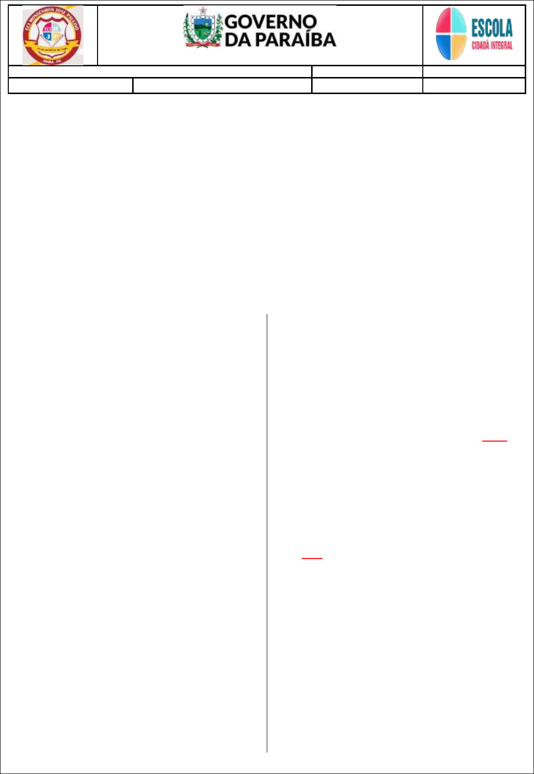 <p>SUASSUNA, Ariano. Auto da Compadecida. – 34º ed. - Rio de Janeiro: Agir, 1999.</p><p>O objetivo principal deste livro é tratar sobre as aventuras cômicas de dois nordestinos, João Grilo e Chicó, que são os</p><p>personagens centrais da peça. De início, vê-se que João Grilo é o que se aproveita da estupidez dos ricos e do clero</p><p>para exercer sua esperteza e sempre consegue levar a melhor. Chicó é o covarde e mentiroso. João Grilo depois que</p><p>consegue convencer o padre a enterrar o cão do padeiro, e vender um gato à mulher adúltera do patrão, tenta enganar</p><p>o cangaceiro Severino, mas é morto pelo homem que trabalha para o cangaceiro. Em seguida, todos são mortos, menos</p><p>Chicó, que sai de cena para rezar pelo amigo. João Grilo vai parar no tribunal celeste e não aceita as acusações do</p><p>diabo (Encourado) diante de Manuel (Cristo) e chama por Nossa Senhora (Compadecida). Depois, com toda sua</p><p>esperteza, consegue superar o diabo. Vão para o purgatório: o bispo, o padre, o sacristão, o padeiro e sua mulher;</p><p>Severino e o “cabra” vão para o céu; Por fim, João Grilo, graças à intervenção de Compadecida, volta à vida com a</p><p>promessa de se comportar direito. Reencontra-se com Chicó, que prometeu todo o dinheiro para Nossa Senhora.</p><p>Palavras-chave: Esperteza. Medroso. Cangaceiro. Diabo. Jesus.</p><p>Lucas Azevedo. Aluno do 2º ano “médio”</p><p>Rio de Janeiro, 13 de junho de 2011</p><p>1. Após ler o texto, responda:</p><p>a) Que texto é este?</p><p>b) Qual a sua finalidade?</p><p>c) Qual o tema deste texto?</p><p>d) Quem produziu este texto?</p><p>e) Qual a estrutura deste texto?</p><p>2. Sobre a referência bibliográfica do texto, explique:</p><p>a) O que é “SUASSUNA”?</p><p>b) Pela forma como a referência foi feita, deduz-se que</p><p>o aluno leu a obra inteira ou apenas uma parte dela?</p><p>c) O que significa “34º ed.”?</p><p>d) O que significa “Agir”?</p><p>e) O que quer dizer o ano “1999”?</p><p>3. Retire do texto as palavras e expressões que foram</p><p>utilizadas para organizar o texto, ou seja, os</p><p>organizadores textuais.</p><p>4. Marque V para verdadeiro e F para falso:</p><p>( ) Na última frase, percebe-se a opinião do autor do</p><p>resumo.</p><p>( ) O texto foi escrito em linguagem impessoal.</p><p>( ) O texto é dividido em três parágrafos.</p><p>( ) As palavras-chave são temáticas, pois resumem o</p><p>tema do resumo.</p><p>( ) O texto trouxe os principais acontecimentos da obra</p><p>literária.</p><p>5. Com relação ao tempo verbal do resumo, é correto</p><p>afirmar:</p><p>a) Predomina o pretérito perfeito.</p><p>b) Há apenas a narração em pretérito imperfeito.</p><p>c) Nota-se a predominância do tempo presente.</p><p>d) O texto foi escrito no tempo futuro do subjuntivo.</p><p>e) Observa-se a predominância do tempo futuro do</p><p>presente.</p><p>6. No trecho: “De início, vê-se que João Grilo é o que</p><p>se aproveita da estupidez dos ricos e do clero para</p><p>exercer sua esperteza e sempre consegue levar a</p><p>melhor”. O que significa a palavra em destaque?</p><p>a) Polícia.</p><p>b) Membros da Igreja Católica.</p><p>c) Membros da Igreja Evangélica.</p><p>d) Escola.</p><p>e) Padaria.</p><p>7. No trecho: “tenta enganar o cangaceiro Severino,</p><p>mas é morto pelo homem que trabalha para o</p><p>cangaceiro.” A palavra em destaque pode ser</p><p>substituída por, exceto:</p><p>a) Porém</p><p>b) Todavia</p><p>c) Contudo</p><p>d) Entretanto</p><p>e) Então</p><p>8. A palavra “mas” em destaque tem o sentido de:</p><p>a) Oposição</p><p>b) Soma</p><p>c) Explicação</p><p>d) Conclusão</p><p>e) Alternância</p><p>E.E.E.M. Cidadã Integral Monsenhor José Paulino - MJP.</p><p>ESTUDANTE: TURMA: TURNO INTEGRAL</p><p>PROF.: JEAN RODRIGUES ATIVIDADE EM SALA LÍNGUA PORTUGUESA DATA:___/___/2023</p><p>Uma técnica de estudo muito interessante é a estratégia de SUBLINHAR palavras, expressões ou frases para destacar</p><p>aquilo que achamos que é importante dentro de um texto. Podemos usar uma régua, marca texto ou caneta colorida</p><p>para destacar essas informações. Sublinhar é uma técnica indispensável tanto para elaboração de esquemas e</p><p>resumos quanto para destacar as ideias importantes de um texto. Você costuma usar essa técnica? Se não, passe</p><p>a utilizá-la, pois vai te ajudar bastante. Caso já a use nos seus estudos, você está de parabéns. Agora vamos realizar</p><p>uma atividade em que você vai precisar desta estratégia de estudo. Mãos à obra!</p><p>Leia o texto 2 abaixo:</p><p>Durante coletiva de imprensa realizada no Palácio dos Bandeirantes, na Zona Sul, nesta sexta-feira (20),</p><p>autoridades fizeram um apelo sobre a importância da quarentena para o controle do COVID-19, também</p><p>conhecido como Coronavírus.</p><p>“Isolamento social não é férias. Não é o momento de viagem, não é o momento de andar no parque, não é o</p><p>momento de confraternização. O quanto mais as pessoas puderem ficar em casa não é mais apenas um ato de higiene,</p><p>mas um ato humanitário, de respeito ao próximo, de respeito à família, aos amigos, aos conhecidos. É importante</p><p>insistir nessa tecla. Só com isso vamos passar melhor por essa pandemia. O isolamento social não é motivo para</p><p>festejar”, enfatizou o prefeito Bruno Covas.</p><p>Na manhã de hoje, entrou em vigor na cidade de São Paulo o decreto que veda o funcionamento do comércio</p><p>na cidade para atendimento presencial até o dia 5 de abril deste ano. De acordo com a medida, fica autorizada apenas</p><p>a manutenção dos serviços administrativos e a realização de vendas por meio de aplicativos, internet ou instrumentos</p><p>similares.</p><p>O governador João Doria também lembrou os cuidados que devem ser tomados com a população mais idosa.</p><p>“Protejam as pessoas com mais de 60 anos. Dê a el