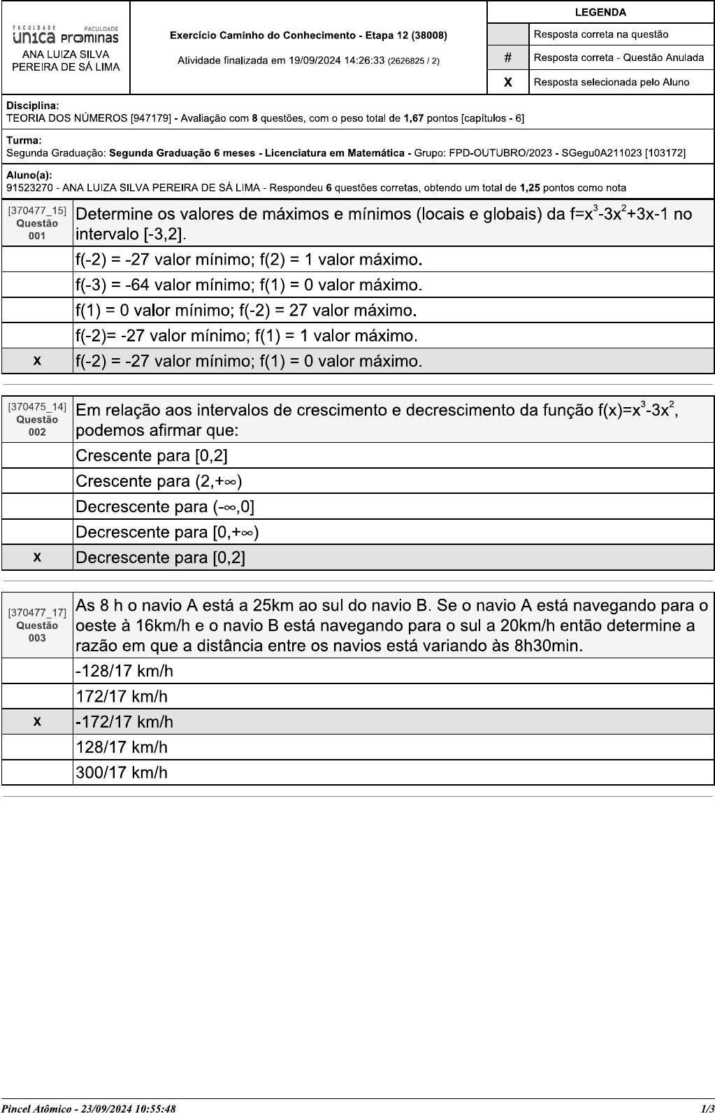 <p>LEGENDA FACULDADE FACULDADE unica prominas Exercício Caminho do Conhecimento - Etapa 12 (38008) Resposta correta na questão ANA LUIZA SILVA Atividade finalizada em 19/09/2024 14:26:33 (2626825 / 2) # Resposta correta Questão Anulada PEREIRA DE LIMA X Resposta selecionada pelo Aluno Disciplina: TEORIA DOS NÚMEROS [947179] Avaliação com 8 questões, com o peso total de 1,67 pontos [capítulos - 6] Turma: Segunda Graduação: Segunda Graduação 6 meses - Licenciatura em Matemática - Grupo: FPD-OUTUBRO/2023 - SGegu0A211023 [103172] Aluno(a): 91523270 - ANA LUIZA SILVA PEREIRA DE LIMA Respondeu 6 questões corretas, obtendo um total de 1,25 pontos como nota [370477_15] Determine os valores de máximos e mínimos (locais e globais) da no Questão 001 intervalo [-3,2]. f(-2) = -27 valor mínimo; f(2) = 1 valor máximo. valor mínimo; f(1) = 0 valor máximo. valor mínimo; f(-2) = 27 valor máximo. f(-2)= -27 valor mínimo; f(1) = 1 valor máximo. X f(-2) = -27 valor mínimo; f(1) = 0 valor máximo. [370475_14] Em relação aos intervalos de crescimento e decrescimento da função Questão 002 podemos afirmar que: Crescente para [0,2] Crescente para (2,+00) Decrescente para Decrescente para X Decrescente para [0,2] [370477_17] As 8 h o navio A está a 25km ao sul do navio B. Se o navio A está navegando para o Questão oeste à 16km/h e o navio B está navegando para o sul a 20km/h então determine a 003 razão em que a distância entre os navios está variando às 8h30min. -128/17 km/h 172/17 km/h X -172/17 km/h 128/17 km/h 300/17 km/h Pincel Atômico - 23/09/2024 10:55:48 1/3</p><p>Dada a representação gráfica de uma função f(x), determine a sua lei de formação: ed 8 6 4 [370475_60] Questão 2 004 -2 o 4 6 8 10 -2 -4 f(x)=2/x X f(x)=2/(x-2) f(x)=2/(x-1) f(x)=2/(x+1) f(x)=2/(x+2) [370475_15] Questão Para qual (is) valor (es) a função possui ponto de mímimo? 005 X x=-5 x=10 x=-2 x=4 x=5 [370475_64] lim : Questão 006 Use a regra de Regra de L'Hôspital, determine o limite X 11/19 9/20 13/20 11/20 11/10 Pincel Atômico - 23/09/2024 10:55:48 2/3</p><p>Em relação a função e sua representação gráfica em um intervalo [a,b]. 7 6 5 B 4 3 [370477_16] Questão 2 007 1 > -5 4 -3 -2 -1 3 4 5 6 7 8 9 10 -1 -2 Analise as afirmações: O ponto A é um mínimo local. O Ponto B é uma máximo local tanto quanto absoluto. A função não possui um máximo nem mínimo absoluto nesse intervalo. Todas as afirmativas estão corretas Apenas a afirmativa está correta Apenas as afirmativas I e III estão corretas Apenas a afirmativa III está correta X Apenas a afirmativa está correta Questão Para qual (is) valor (es) a função +1 possui ponto de mímimo? 008 X x=-3 x=17 x=4 x=-2 x=2 Pincel Atômico - 23/09/2024 10:55:48 3/3</p>