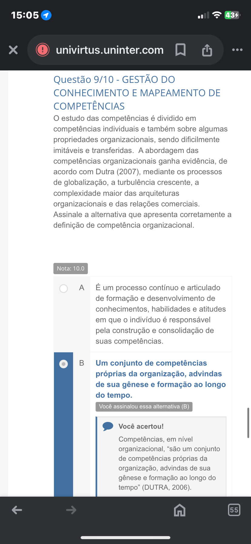 <p>15:05 434 univirtus.uninter.com Questão 9/10 - GESTÃO DO CONHECIMENTO E MAPEAMENTO DE COMPETÊNCIAS estudo das competências é dividido em competências individuais e também sobre algumas propriedades organizacionais, sendo dificilmente imitáveis e transferidas. A abordagem das competências organizacionais ganha evidência, de acordo com Dutra (2007), mediante os processos de globalização, a turbulência crescente, a complexidade maior das arquiteturas organizacionais e das relações comerciais. Assinale a alternativa que apresenta corretamente a definição de competência organizacional. Nota: 10.0 A É um processo contínuo e articulado de formação e desenvolvimento de conhecimentos, habilidades e atitudes em que o indivíduo é responsável pela construção e consolidação de suas competências. B Um conjunto de competências próprias da organização, advindas de sua gênese e formação ao longo do tempo. Você assinalou essa alternativa (B) Você acertou! Competências, em nível organizacional, "são um conjunto de competências próprias da organização, advindas de sua gênese e formação ao longo do tempo" (DUTRA, 2006). 55</p>